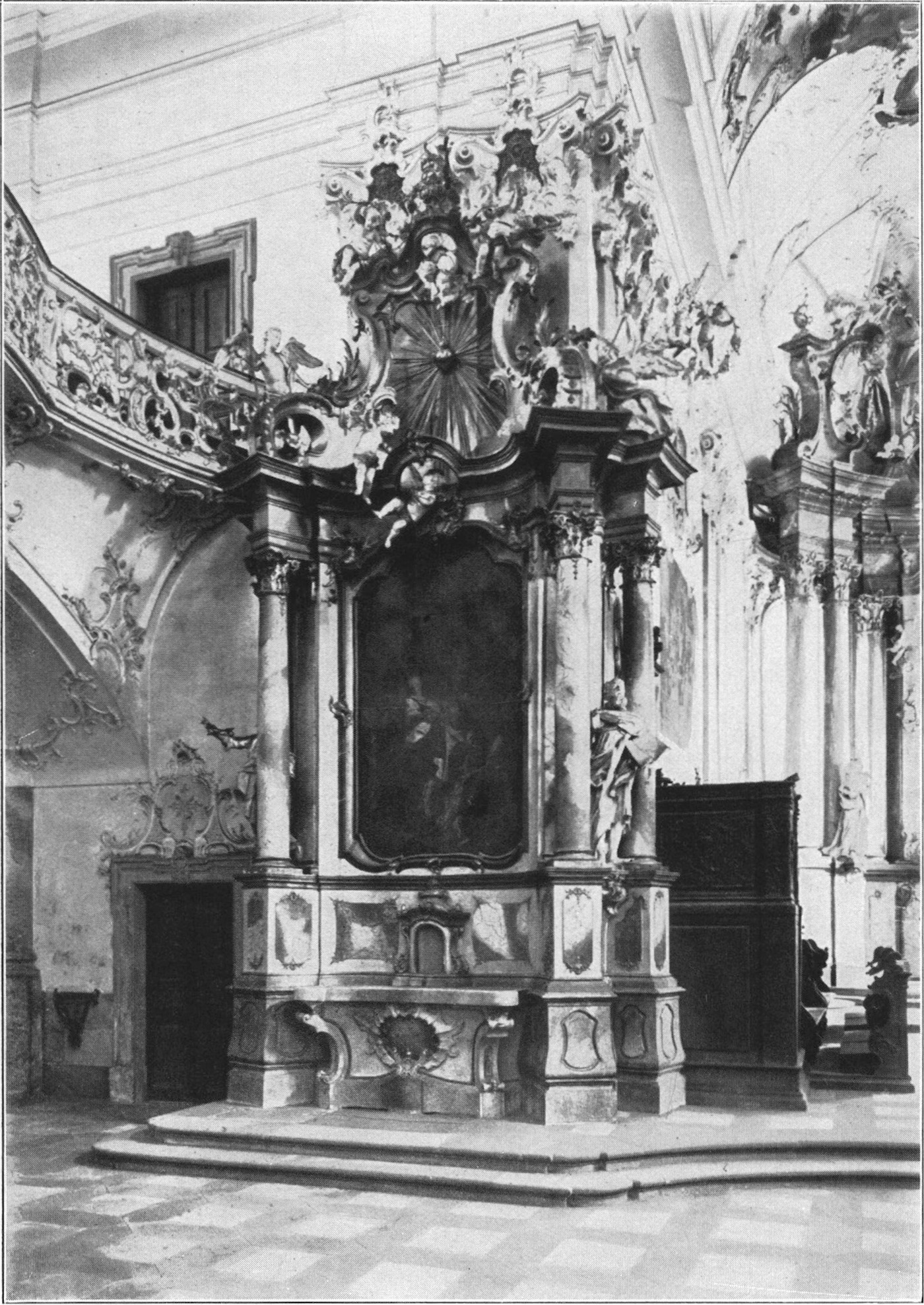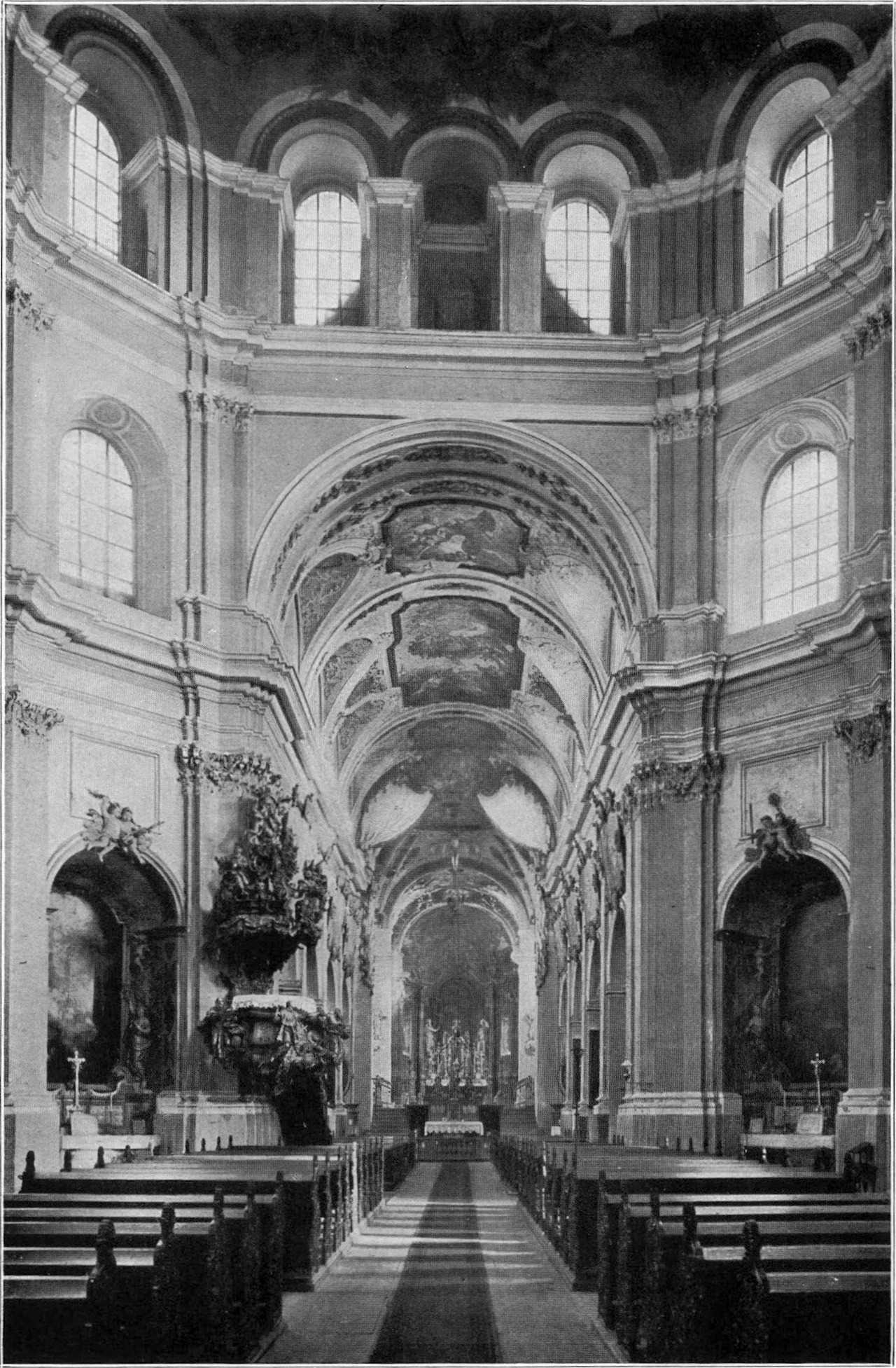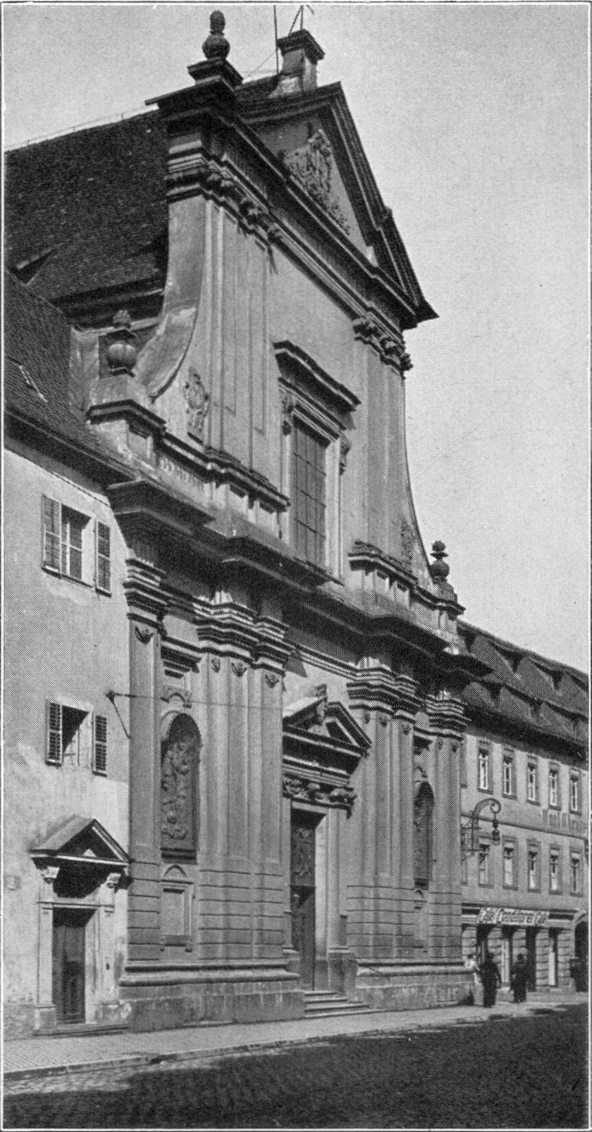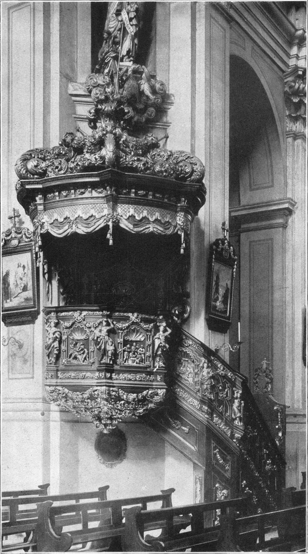 Als Ganzes ist die Hofkirche wiederum eine Glanzleistung der Gemeinschaftsarbeit, besonders auch was ihre hervorragende Ausstattung anbelangt, bei der Hildebrand, Antonio Bossi und Rudolf Byß hauptbeteiligt sind. Alle Einzeldinge sind aus dem Sinne des Raumes gestaltet, aus dem Willen zum äußersten Einheitskunstwerk und seinem Ausdruck, der alles erfüllenden hinreißenden Festlichkeit. Jeder Gegenstand und jeder Zierat biegt und formt sich unter der wehenden Bewegung, die innerhalb eines starren gegebenen Rechteckes durch die kunstvoll hineingestellte Raumschale hervorgezaubert wird. Staunenswert ist die gemeinsame Stilgesinnung, die alles trägt, bewundernswert aber auch die persönliche Leistung aller einzelnen Meister, deren sich Würzburg damals rühmen konnte. Proben ihres Könnens zeigt noch manches Würzburger Gotteshaus, wie das der Augustiner mit seinen[S. ix] glänzenden Altären oder St. Peter, dessen formsprühende und doch gebändigte Kanzel unvergleichlichen Reiz verstreut.