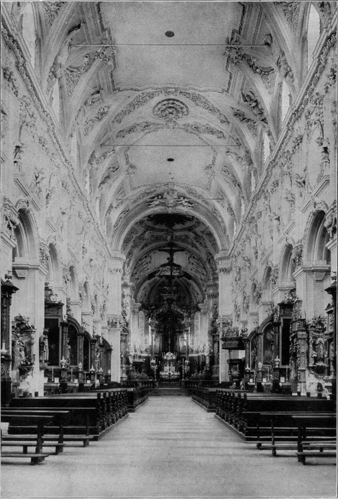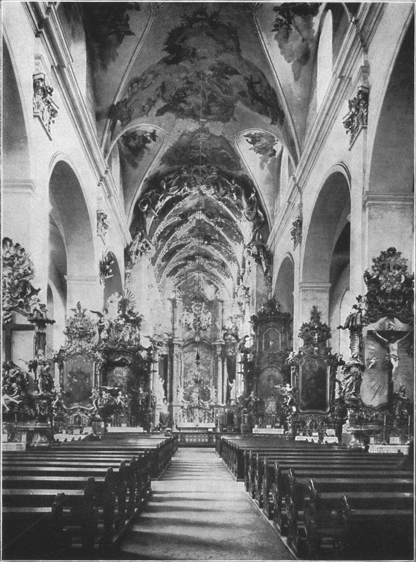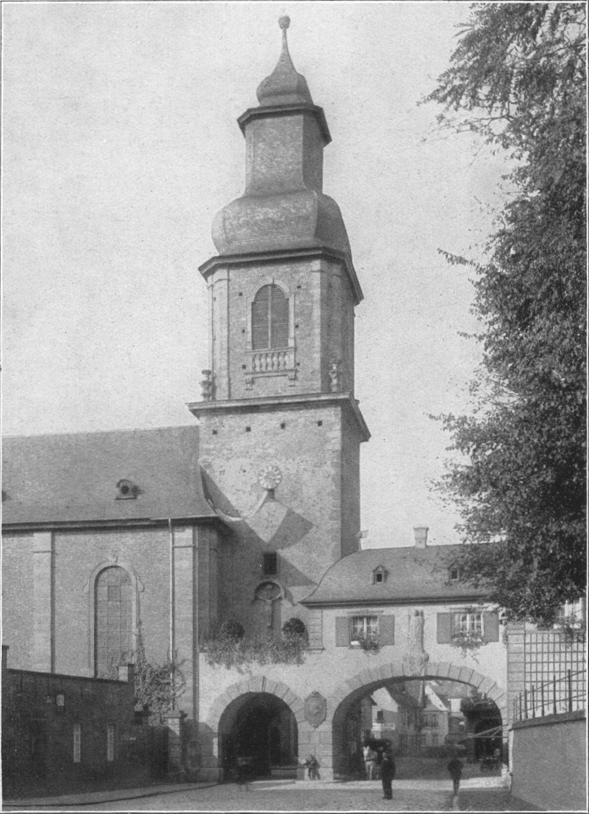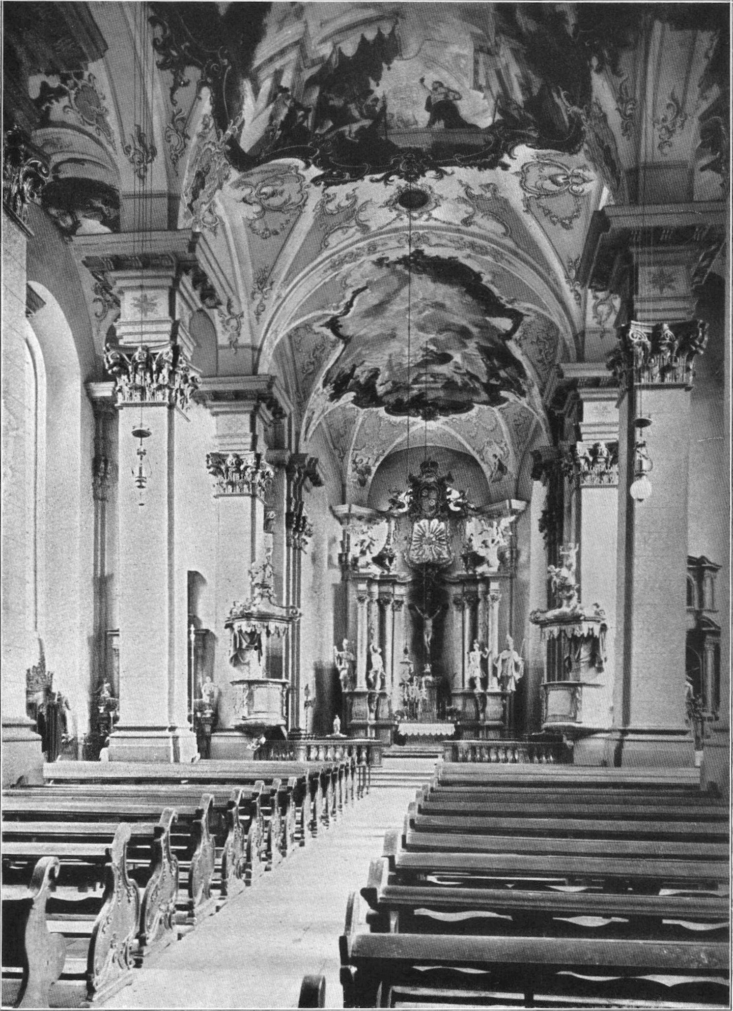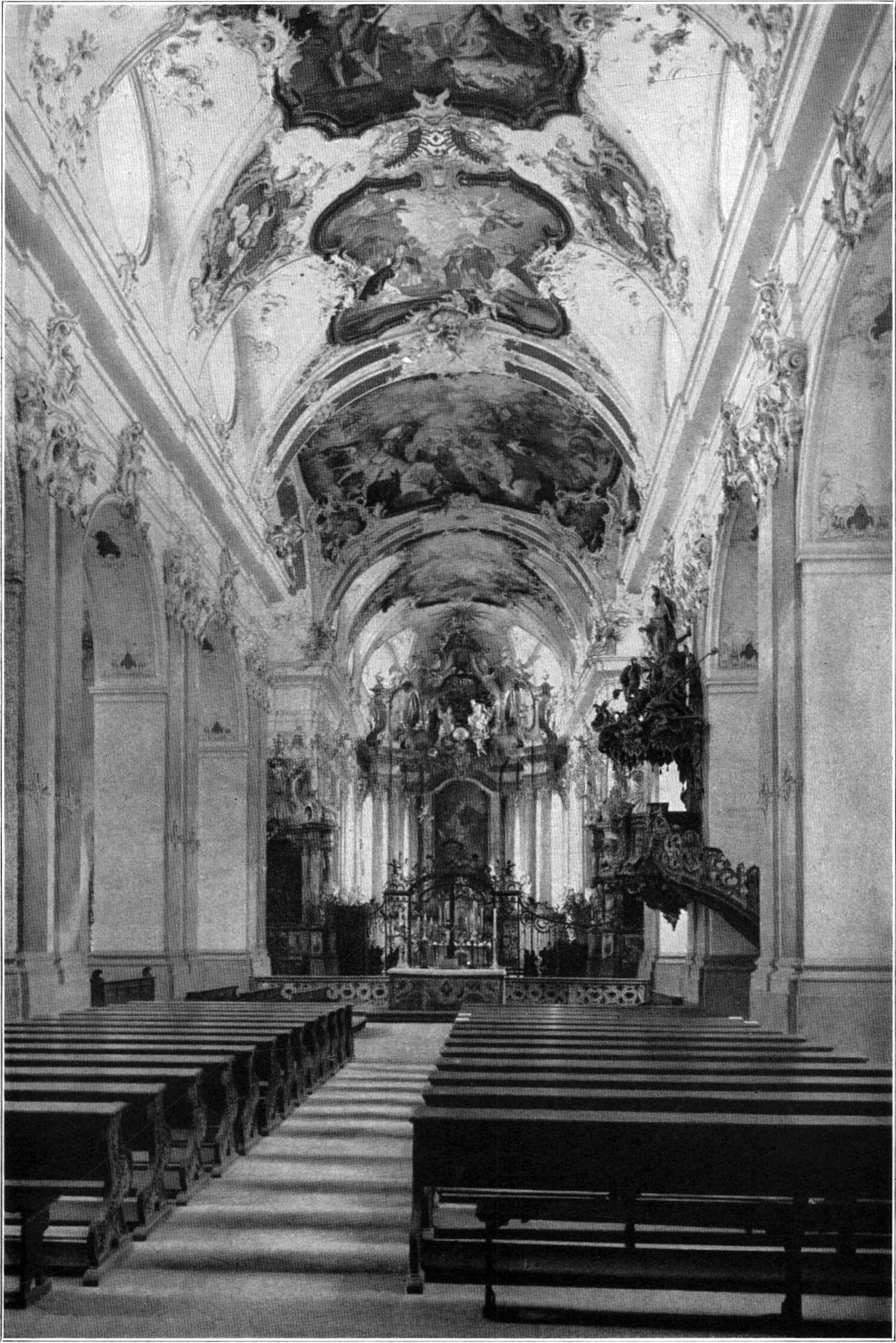 Das westliche Unterfranken stand wegen seiner Staatszugehörigkeit zu Mainz naturgemäß hauptsächlich unter der künstlerischen Einwirkung dieser Stadt. Der bedeutendste Provinzmeister jener Gegenden war J. Martin Schmidt aus Miltenberg, der vielleicht nicht ohne Beeinflussung durch den Kavalierarchitekten Johann Franz Wolfgang v. Ostein die bemerkenswerte Amorbacher Pfarrkirche errichtete. Das Monumentalwerk Westunterfrankens ist aber die Amorbacher Abteikirche des Maximilian v. Welsch. Ihr Grundriß ist für das Zeitalter Vierzehnheiligens (Baubeginn 1742) rückständig; er folgt mit seiner basilikalen Dreischiffigkeit und seinem östlichen Querhaus zweifellos der romanischen Anlage, von der das westliche Turmpaar ziemlich unberührt erhalten blieb. Ihm hat Welsch eine Schauwand mit reicher Treppe vorgelegt, so daß ein wohlgegliederter, mächtiger Außenbau zustande kam, der das eindrucksvolle, großräumige Innere würdig umschließt. Der ganz besondere Ruhm dieser Kirche liegt aber in der Ausstattung, die von bayerischen und Würzburger Meistern besorgt wurde und die strenge Architektur mit flüssigem Schmelz übergießt.