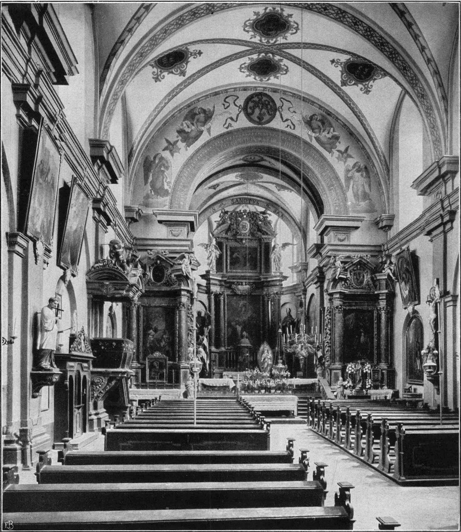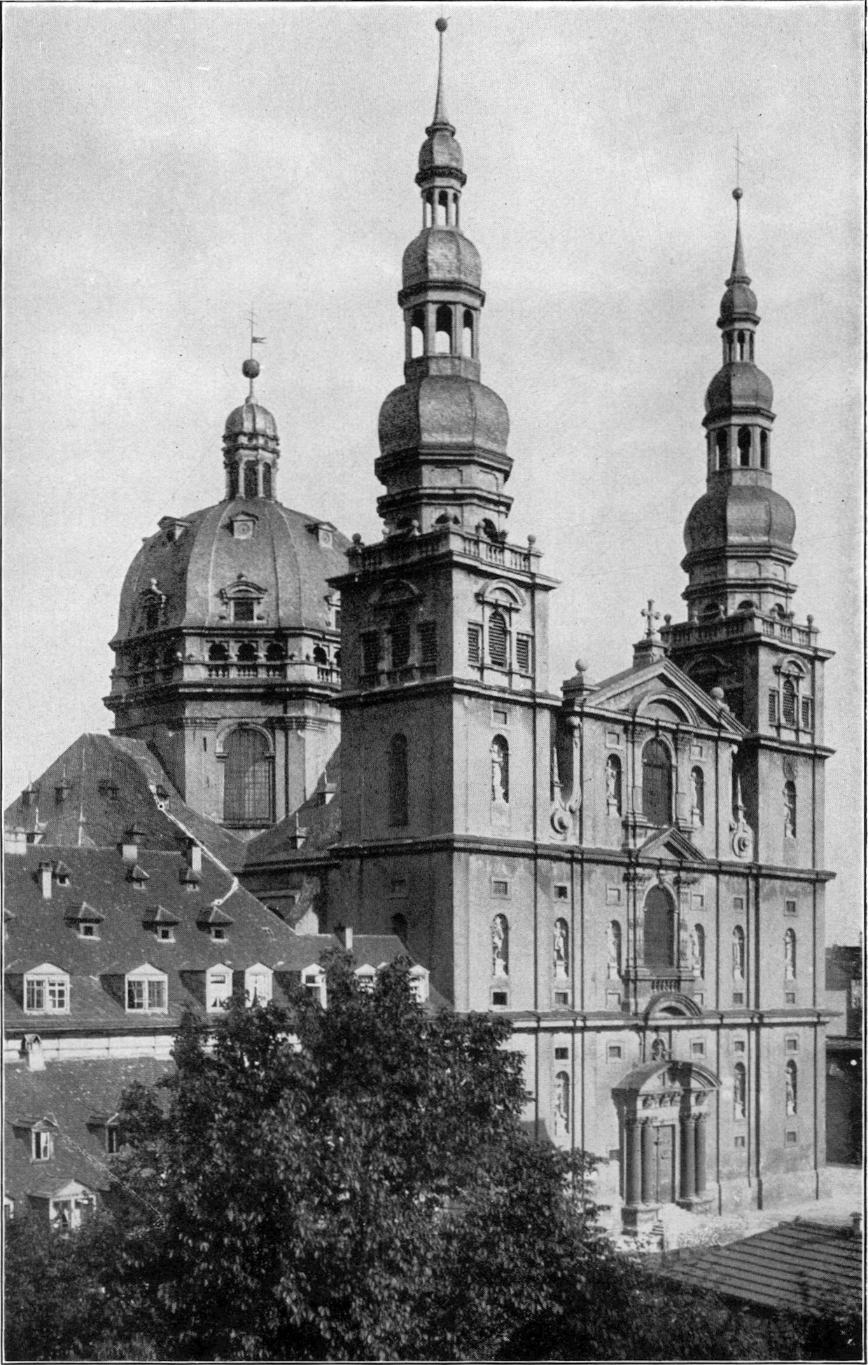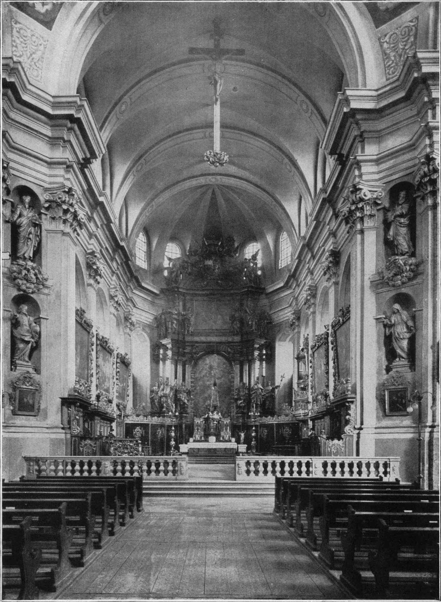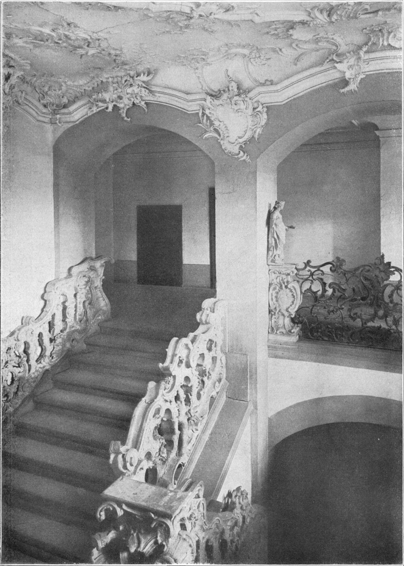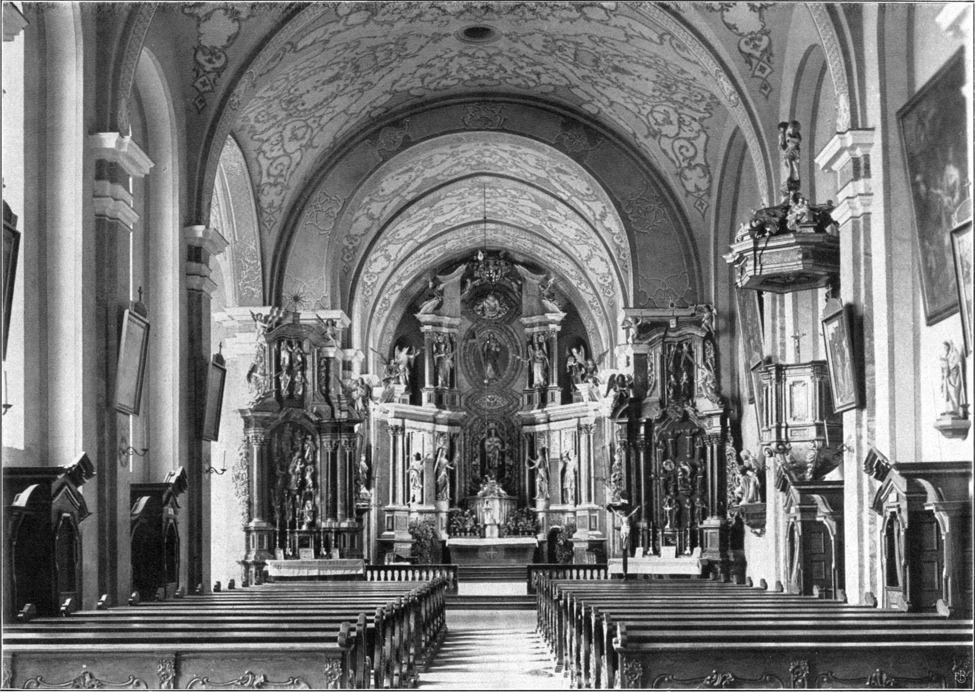 Das westliche Unterfranken stand wegen seiner Staatszugehörigkeit zu Mainz naturgemäß hauptsächlich unter der künstlerischen Einwirkung dieser Stadt. Der bedeutendste Provinzmeister jener Gegenden war J. Martin Schmidt aus Miltenberg, der vielleicht nicht ohne Beeinflussung durch den Kavalierarchitekten Johann Franz Wolfgang v. Ostein die bemerkenswerte Amorbacher Pfarrkirche errichtete. Das Monumentalwerk Westunterfrankens ist aber die Amorbacher Abteikirche des Maximilian v. Welsch. Ihr Grundriß ist für das Zeitalter Vierzehnheiligens (Baubeginn 1742) rückständig; er folgt mit seiner basilikalen Dreischiffigkeit und seinem östlichen Querhaus zweifellos der romanischen Anlage, von der das westliche Turmpaar ziemlich unberührt erhalten blieb. Ihm hat Welsch eine Schauwand mit reicher Treppe vorgelegt, so daß ein wohlgegliederter, mächtiger Außenbau zustande kam, der das eindrucksvolle, großräumige Innere würdig umschließt. Der ganz besondere Ruhm dieser Kirche liegt aber in der Ausstattung, die von bayerischen und Würzburger Meistern besorgt wurde und die strenge Architektur mit flüssigem Schmelz übergießt.