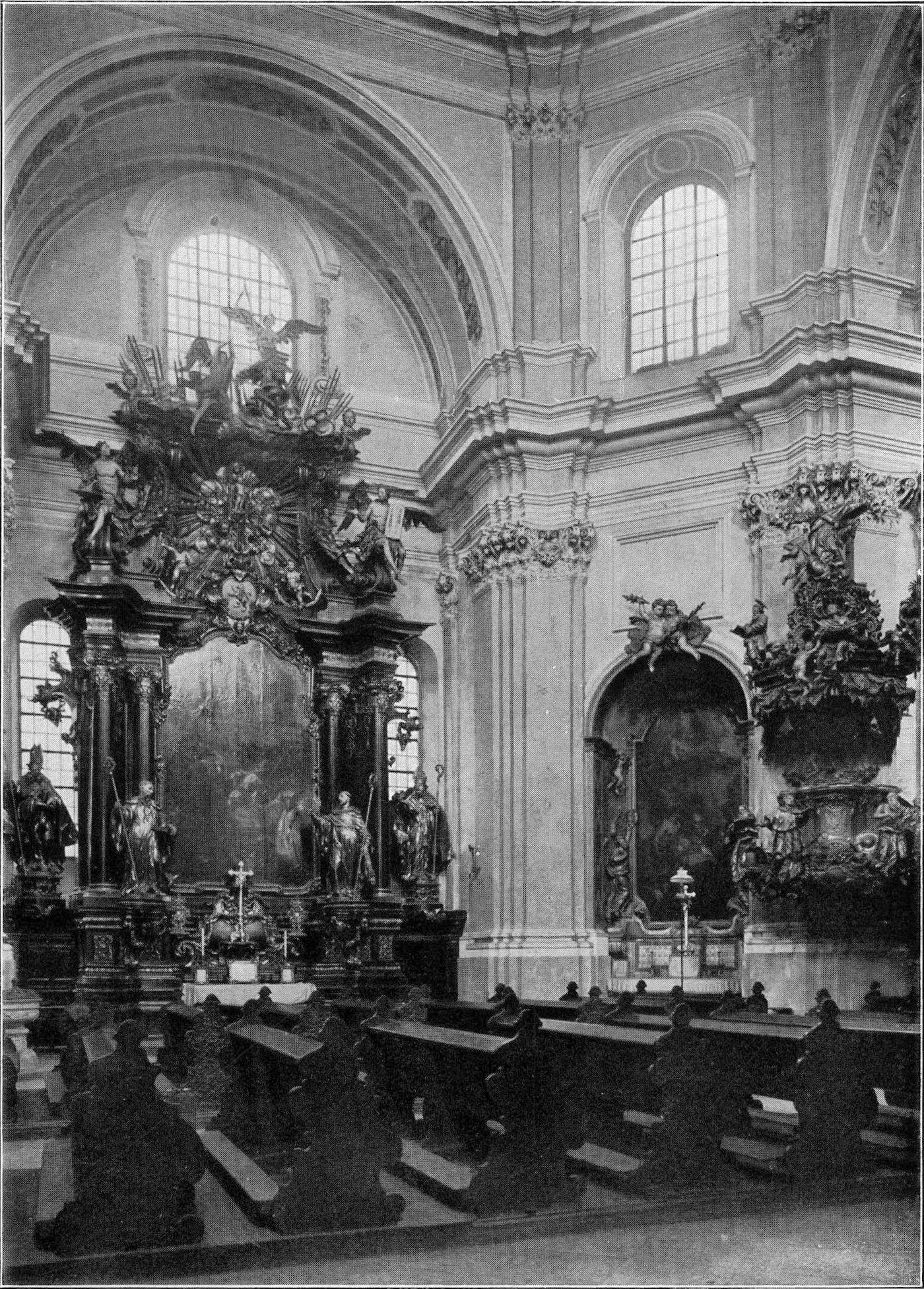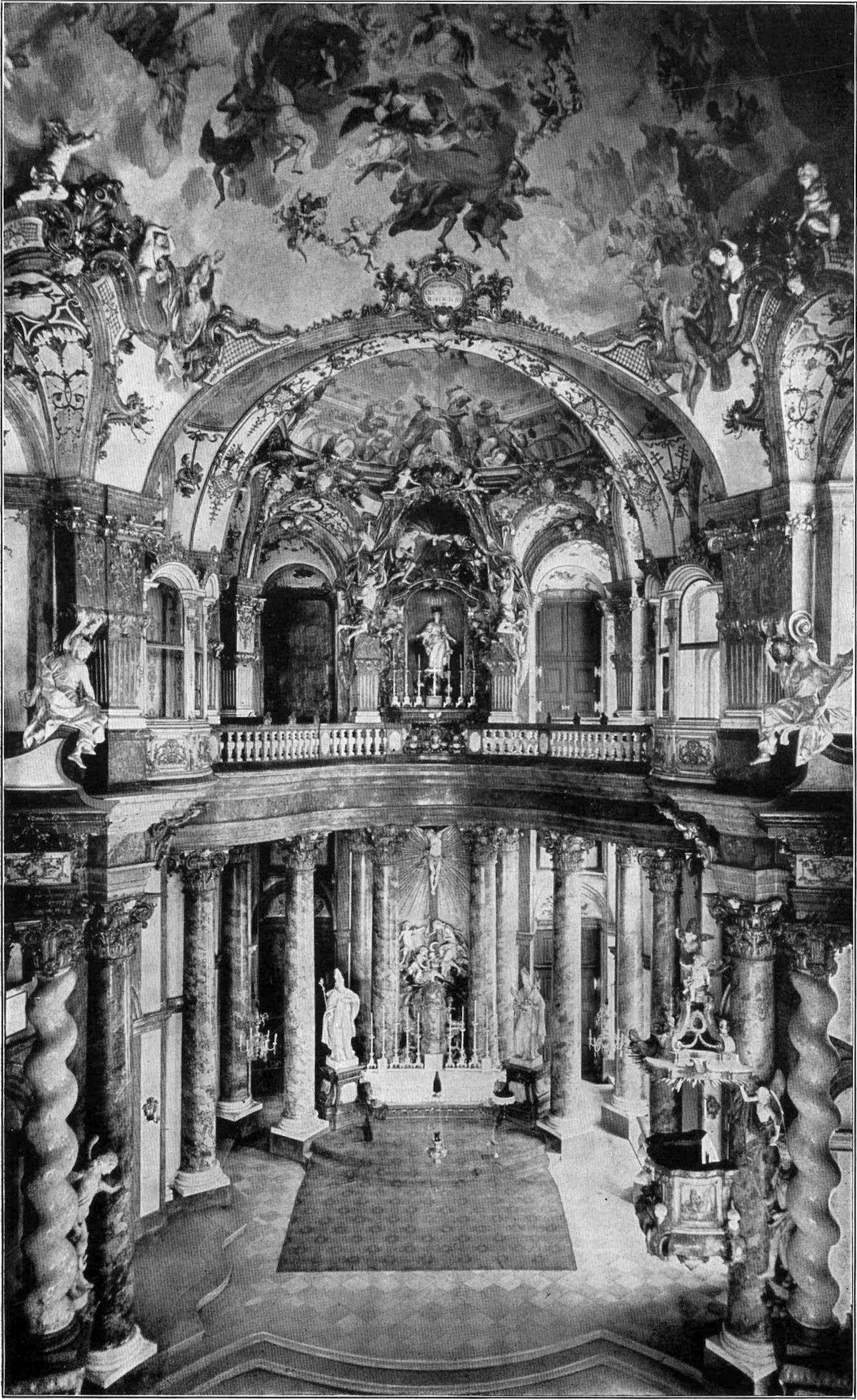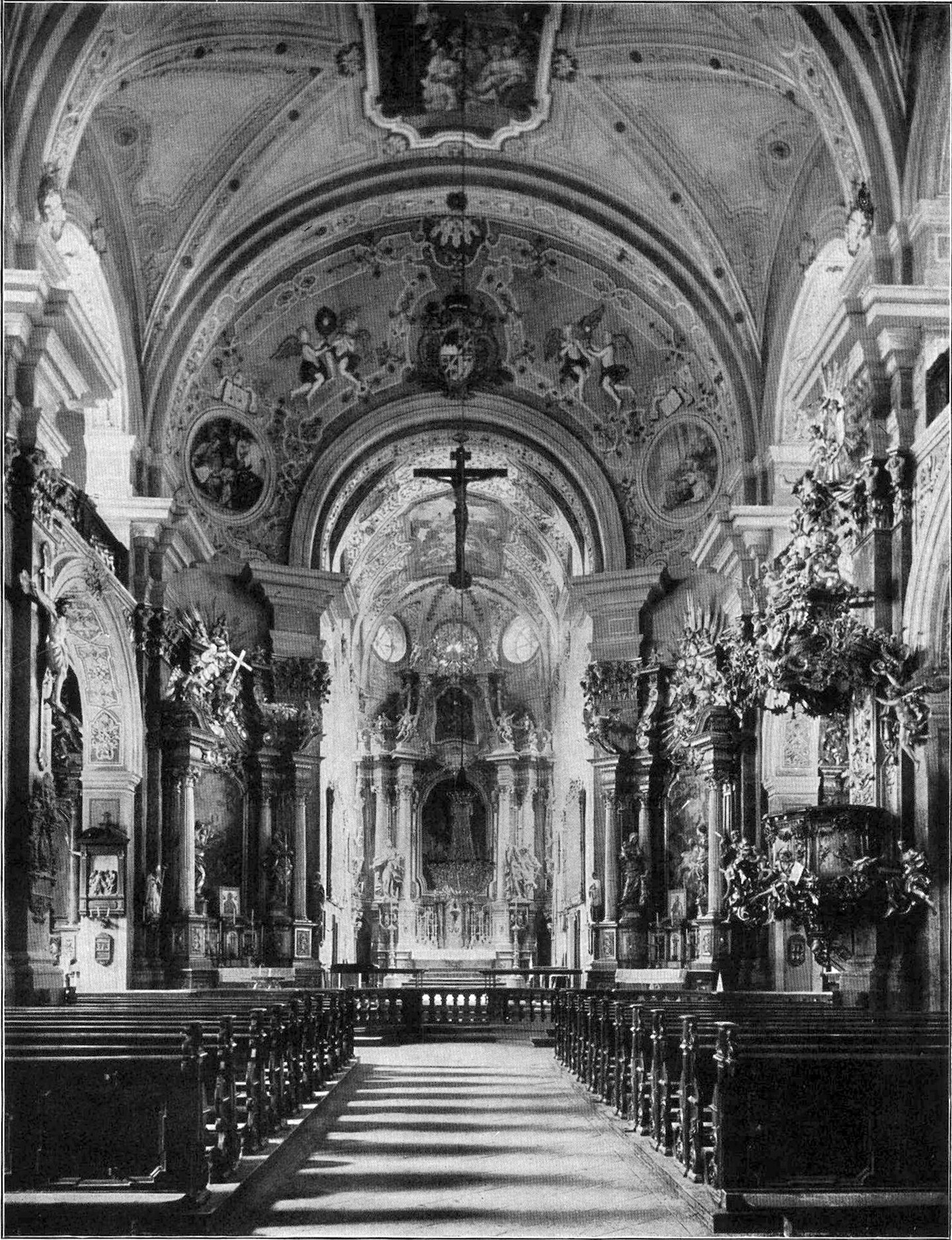 Der Mann, der berufen war den barocken Kirchenbau Frankens auf die Höhe europäischer Bedeutung zu führen, war Balthasar Neumann. Er tritt uns bei der Schönbornkapelle zum ersten Male entgegen. Hier war er zunächst noch ein Lernender, dem besonders die Nähe Johann Dientzenhofers, des Meisters fortgeschrittener Raumverschmelzung wichtig sein mußte. Denn gerade auf diesem von den Dientzenhofern gebahnten Weg schritt späterhin Neumann seinen letzten wahrhaft genialen Werken Vierzehnheiligen und Neresheim zu. Bei dem Bau von Holzkirchen sehen wir beide Meister im Wettbewerb: Johann Dientzenhofer unterliegt mit reiferen schönen Plänen; Neumann errichtet eine schlichte klassizistische Rotunde, die sich durch Sicherheit der Verhältnisse und gute Raumwirkung auszeichnet. Um die gleiche Zeit führt er seinen ersten ganz großen Kirchenbau in Münsterschwarzach, wo er ein herkömmliches Barockschema mit persönlicher Größe gestaltet. Hierauf baut Neumann zwei Landkirchen zu Gaibach und Etwashausen, die wie Studien zu seinen Meisterwerken anmuten. Beide behandeln die Aufgabe (die Hauptaufgabe barocker Raumentwicklung) der Verschmelzung des Lang- und Zentralbaues zu einer neuen Einheitsform[S. viii] und beide Male werden Anregungen der Schönbornkapelle aufgenommen und weiter entwickelt: In Gaibach die Verklammerung der Chor- und Querschiffsovale mit dem Kuppelraum, in Etwashausen das festliche Motiv der knapp vor der Wand freistehenden Säulenpaare, die eine Auflösung der schließenden Fläche in rhythmische Bewegung ermöglichen. Nun war Neumann gleichsam vorbereitet, seinen kühnsten Raumvorstellungen Gestalt zu verleihen, die Meisterwerke von Vierzehnheiligen und Neresheim zu erschaffen. Beide Kirchen stehen nicht auf unterfränkischem Boden. Dort aber befindet sich noch ein wichtiger Bau, die Würzburger Hofkirche, die im inneren Zusammenhange mit jenen Kirchen steht und uns beispielhaft für das Stilwollen der Zeit sein kann. Ihre Planungsgeschichte ist immer noch nicht ganz klar; ihre Raumgestalt, die mehrere Ovale mittels gekrümmter Gurten ineinanderkettet, läßt sich jedenfalls besser in das Werk Neumanns als in das Lukas v. Hildebrands einfügen, dem man sie mit archivalischen Beweisen allein zusprechen wollte. Wien und Österreich huldigten aber nie dieser Art von Raumkunst, die, wie bereits gesagt, ihre Heimat in Böhmen hat.