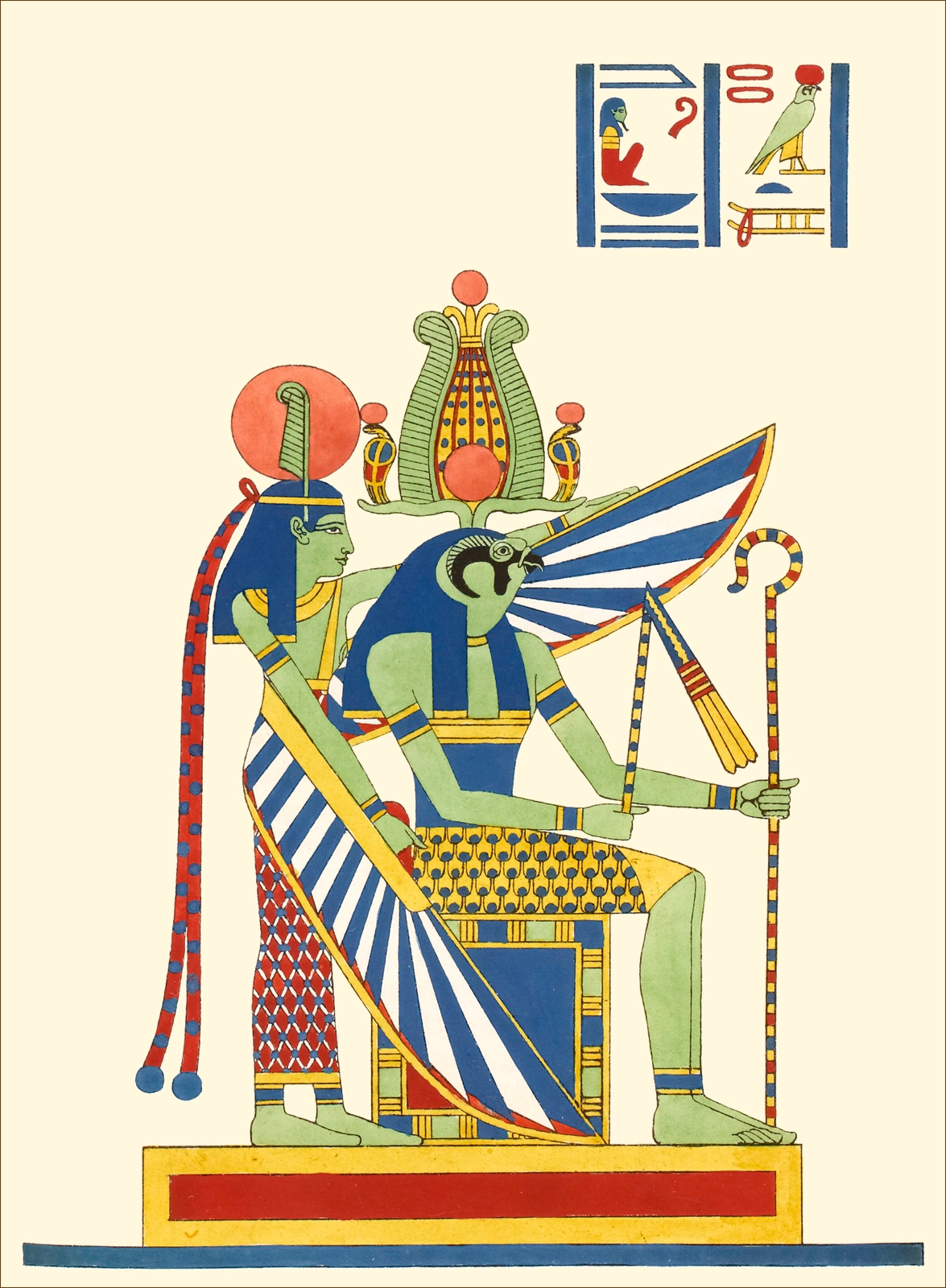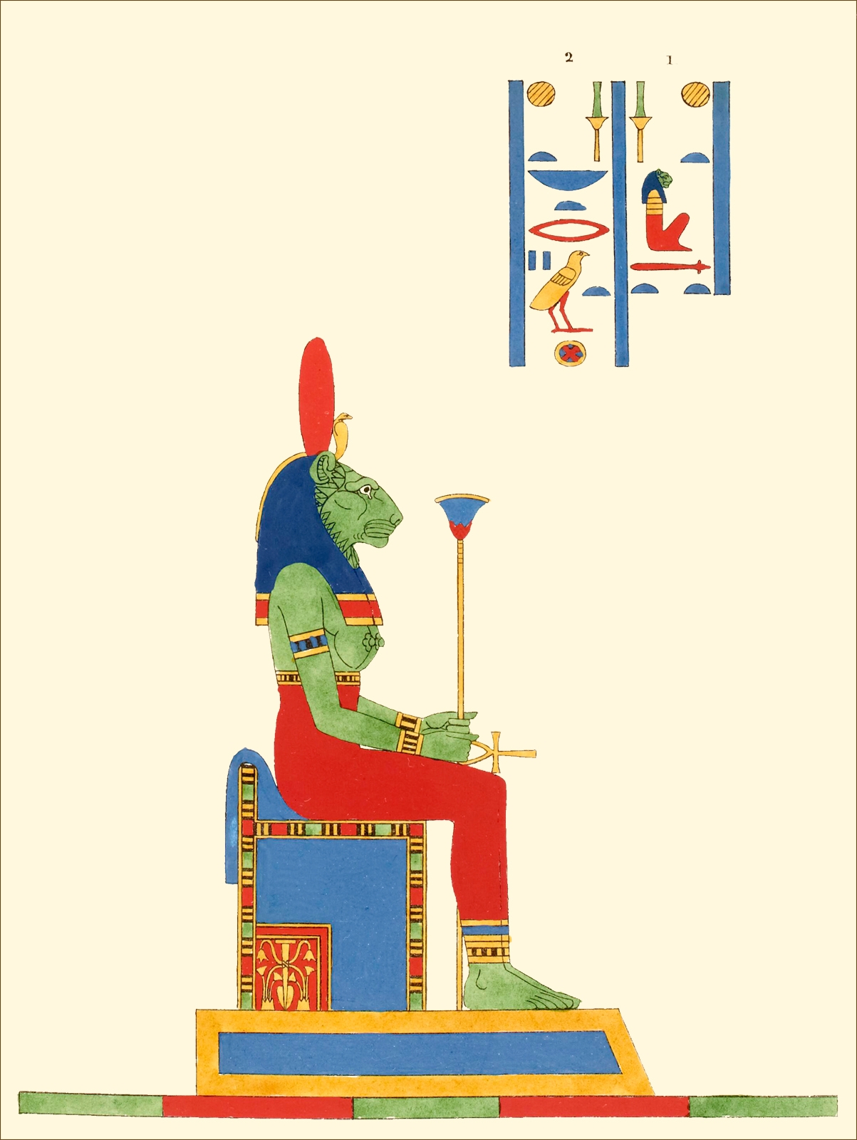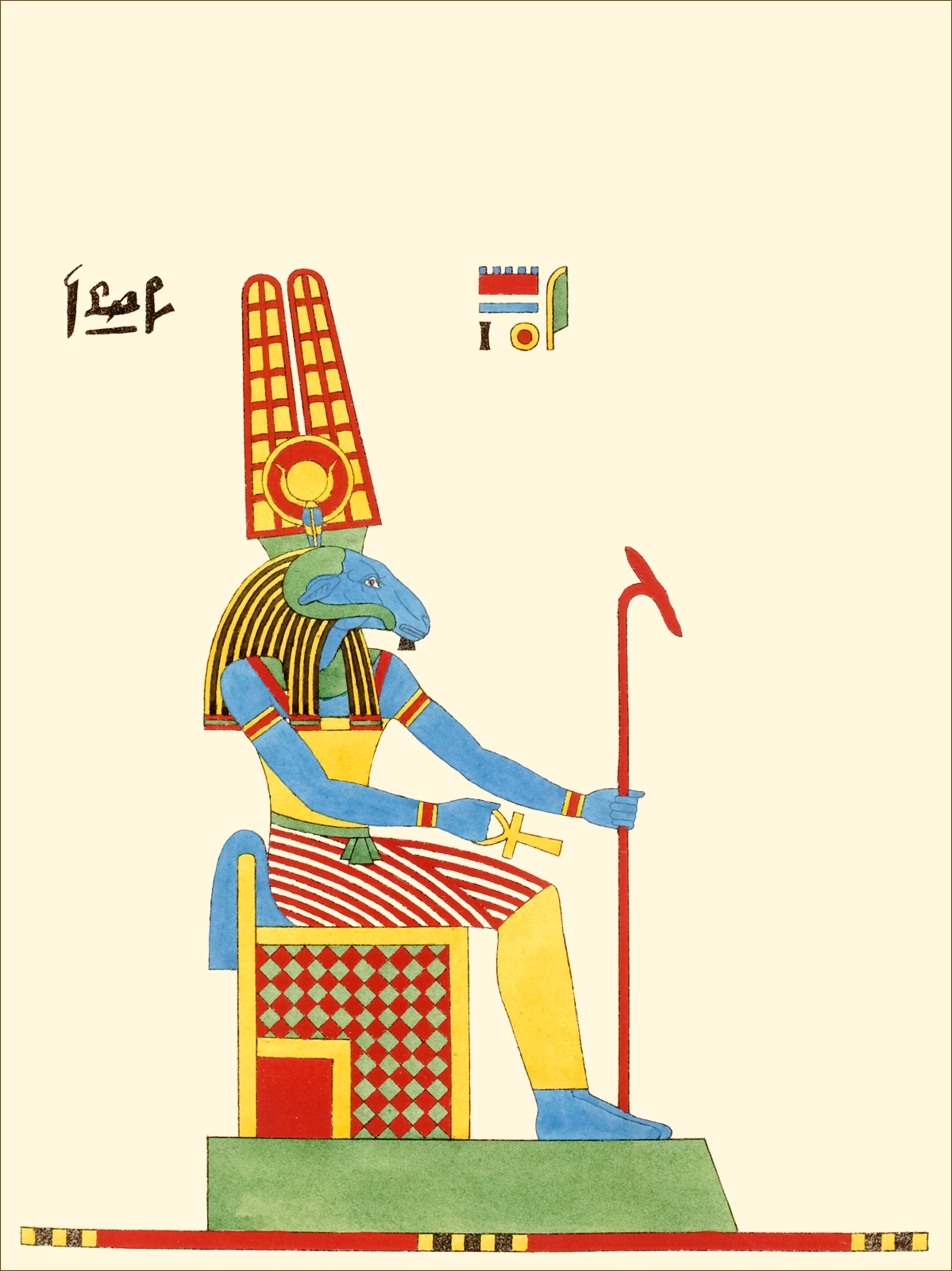 Les écrivains Grecs et Latins, qui nous ont conservé quelques documents sur le culte et sur la religion des anciens Égyptiens, disent tous que ce peuple représentait le dieu Amon, la principale divinité de l’Égypte et de Thèbes, sous une forme humaine, et ayant pour tête celle d’un bélier. On vient de voir cette divinité sous une forme purement humaine, mais les monuments nous la montrent aussi telle que les Grecs l’ont décrite; le nom et la légende hiéroglyphique Amon ou Amonré, Seigneur des régions du monde, Seigneur suprême, se lient, en effet, assez souvent avec l’image d’une divinité assise sur un trône, le sceptre des dieux d’une main, le symbole de la vie divine de l’autre, ayant les chairs vertes ou bleues comme l’Amon à face humaine, mais dont la tête est celle d’un bélier, ornée de la même coiffure, surmontée du disque, et des grandes plumes qui distinguent également Amon à tête d’homme; le serpent Ureus, vu de face, et qui décore le bas de cette coiffure, est l’emblême ordinaire de la puissance royale; cet insigne est commun aux dieux et aux souverains de l’Égypte: telle est la divinité représentée sur notre gravure.