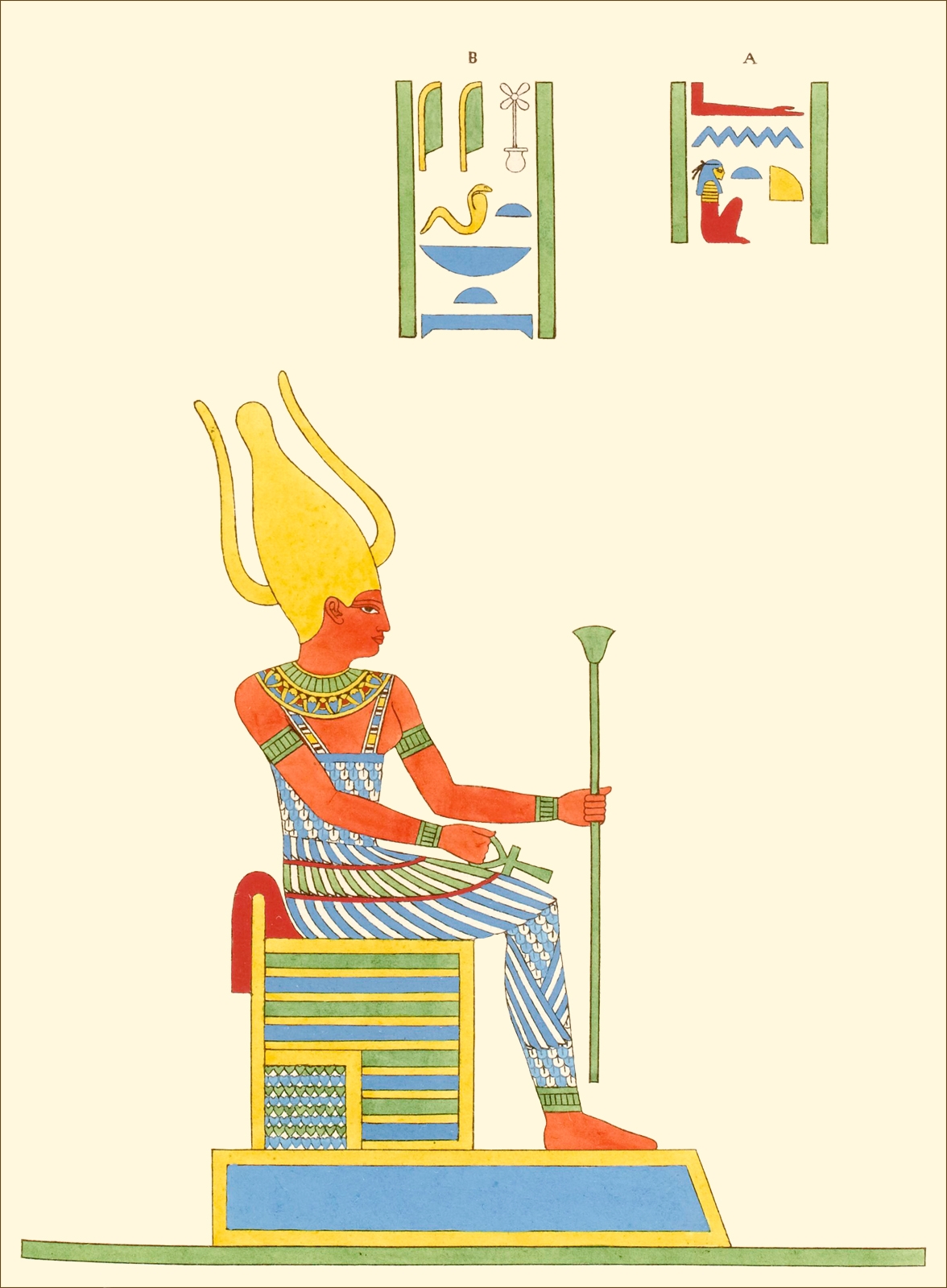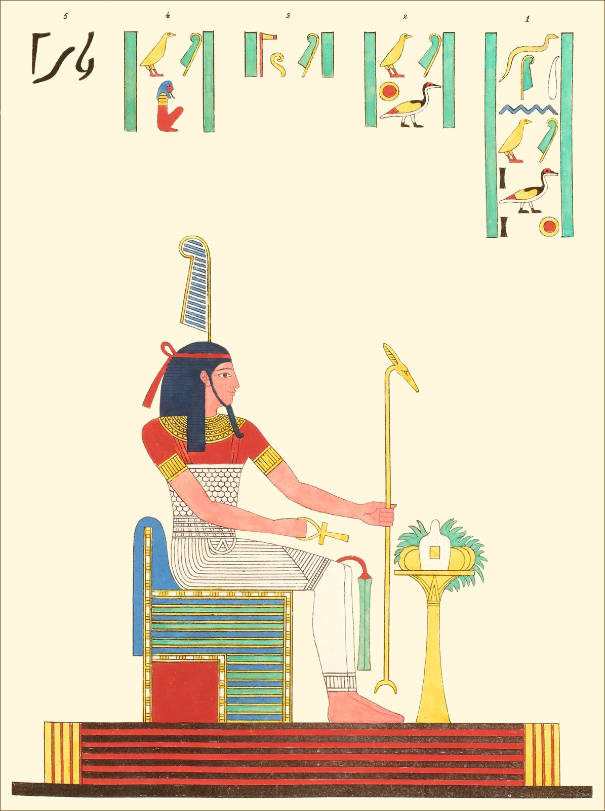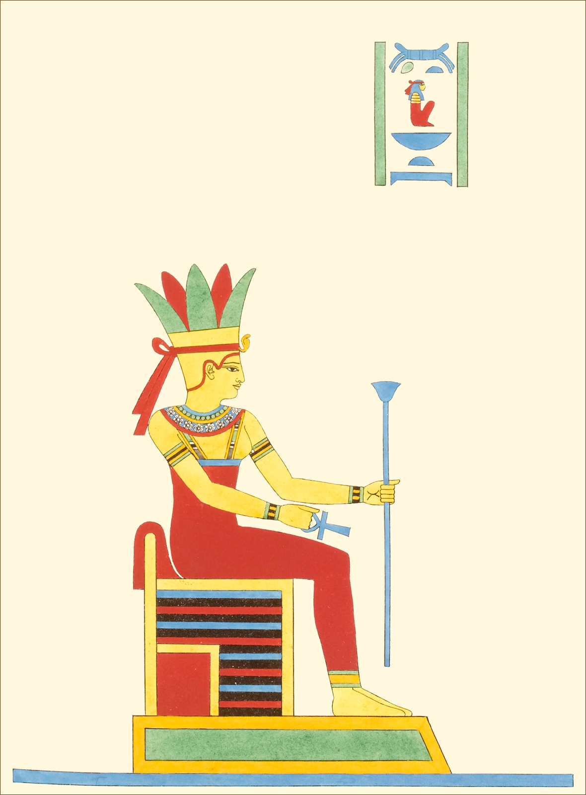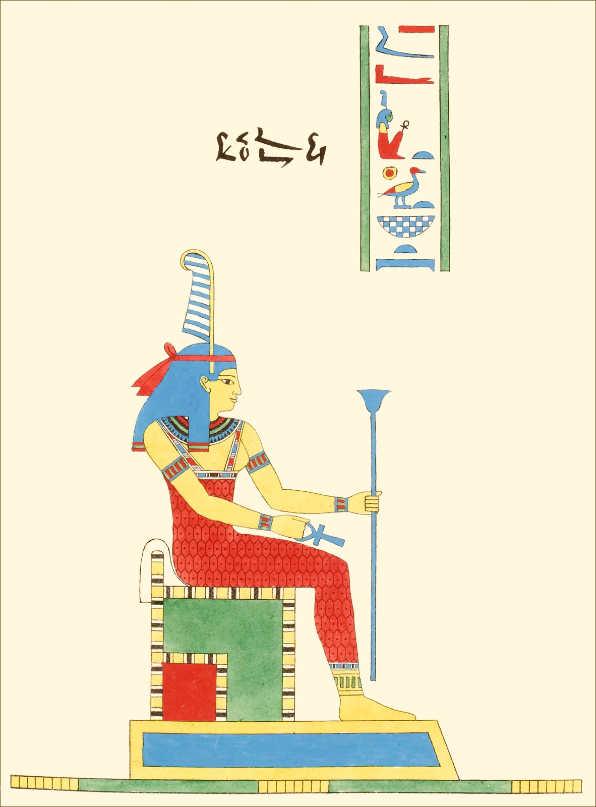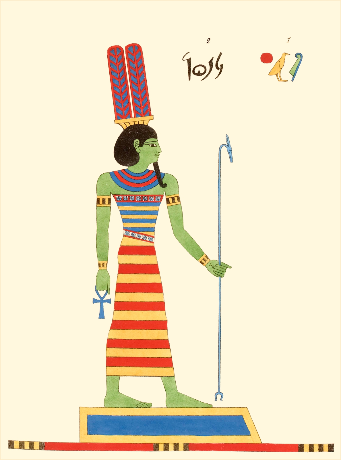 Ce dieu, de forme humaine, est ici représenté assis sur un trône, comme le sont pour l’ordinaire toutes les grandes divinités de l’Égypte. Sa carnation est bleue, couleur propre à ce personnage; sa barbe est figurée par une appendice noire qui caractérise les divinités mâles; et dans les cercueils de momie, cette même appendice indique toujours une momie d’homme; le dieu tient dans sa main gauche un sceptre terminé par la tête de cet oiseau qu’Horapollon nomme Koucoupha, sceptre commun à toutes les divinités mâles du Panthéon Égyptien, et qui était le symbole de la bienfaisance des dieux; dans sa main droite est la croix ansée, symbole de la vie divine; sa tête est ornée d’une coiffure royale, surmontée de deux grandes plumes peintes de diverses couleurs; de la partie postérieure de sa coiffure, descend une longue bandelette bleue; son col est orné d’un collier, parfois très-richement décoré; sa tunique, d’abord soutenue au-dessous du sein, au moyen de deux bretelles, est fixée vers les hanches par une ceinture bleue; des bracelets ornent le haut de ses bras, et souvent aussi la naissance du poignet.