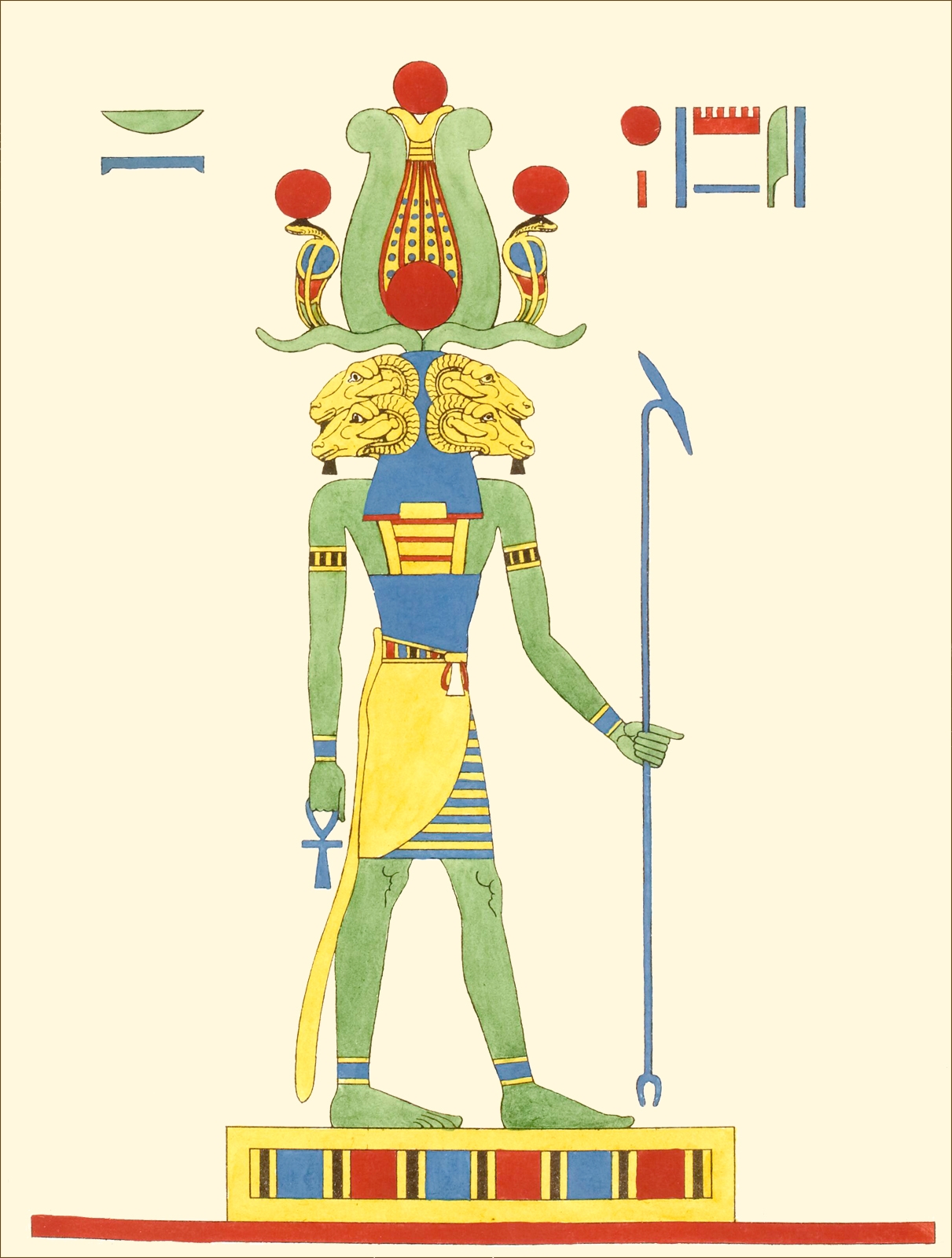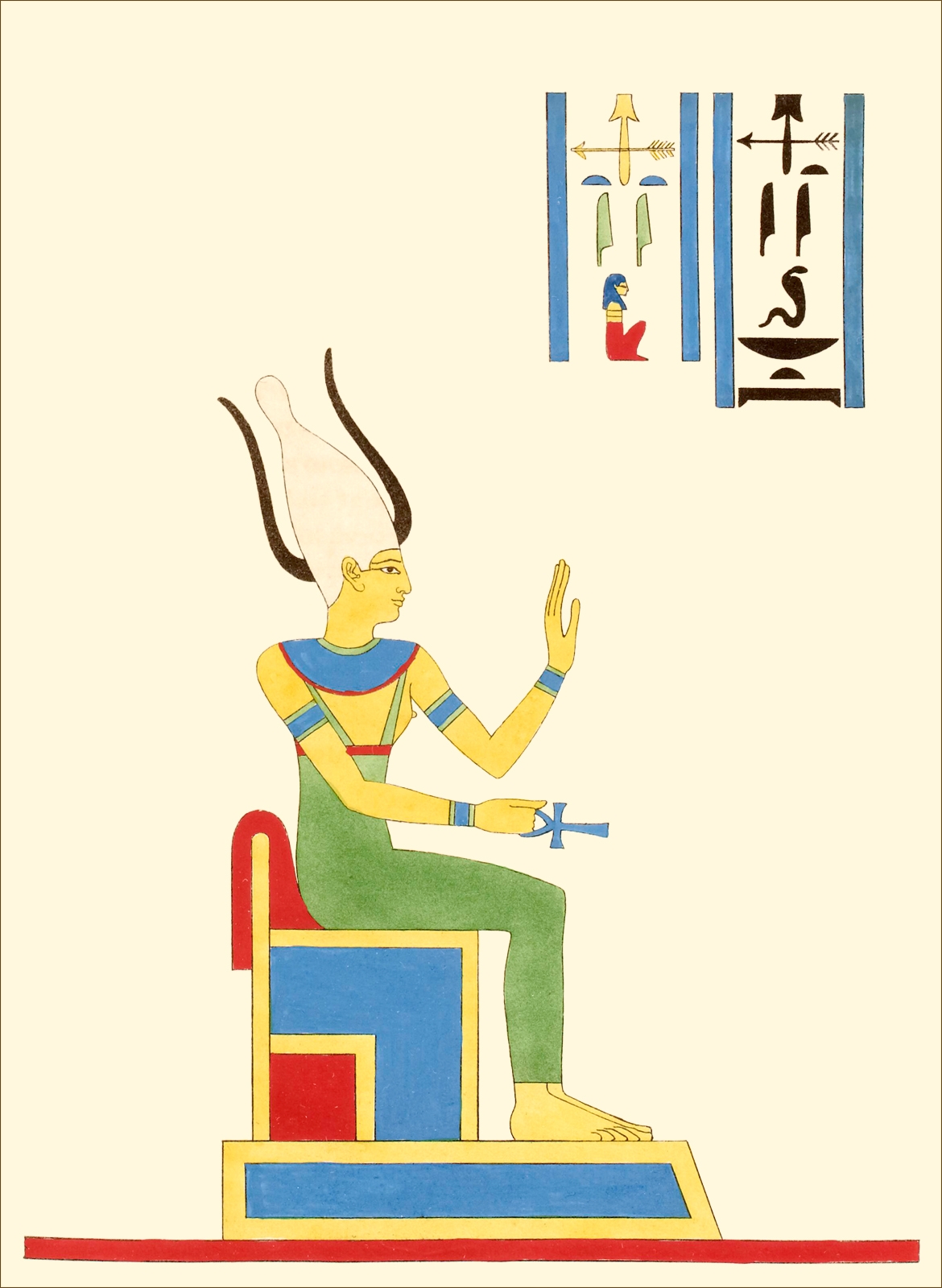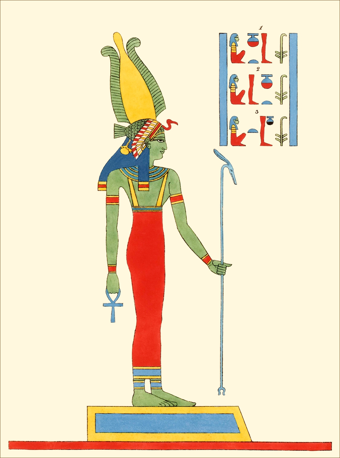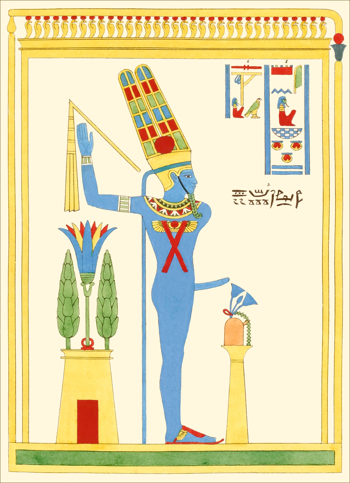 Ce dieu, de forme humaine, est ici représenté assis sur un trône, comme le sont pour l’ordinaire toutes les grandes divinités de l’Égypte. Sa carnation est bleue, couleur propre à ce personnage; sa barbe est figurée par une appendice noire qui caractérise les divinités mâles; et dans les cercueils de momie, cette même appendice indique toujours une momie d’homme; le dieu tient dans sa main gauche un sceptre terminé par la tête de cet oiseau qu’Horapollon nomme Koucoupha, sceptre commun à toutes les divinités mâles du Panthéon Égyptien, et qui était le symbole de la bienfaisance des dieux; dans sa main droite est la croix ansée, symbole de la vie divine; sa tête est ornée d’une coiffure royale, surmontée de deux grandes plumes peintes de diverses couleurs; de la partie postérieure de sa coiffure, descend une longue bandelette bleue; son col est orné d’un collier, parfois très-richement décoré; sa tunique, d’abord soutenue au-dessous du sein, au moyen de deux bretelles, est fixée vers les hanches par une ceinture bleue; des bracelets ornent le haut de ses bras, et souvent aussi la naissance du poignet.