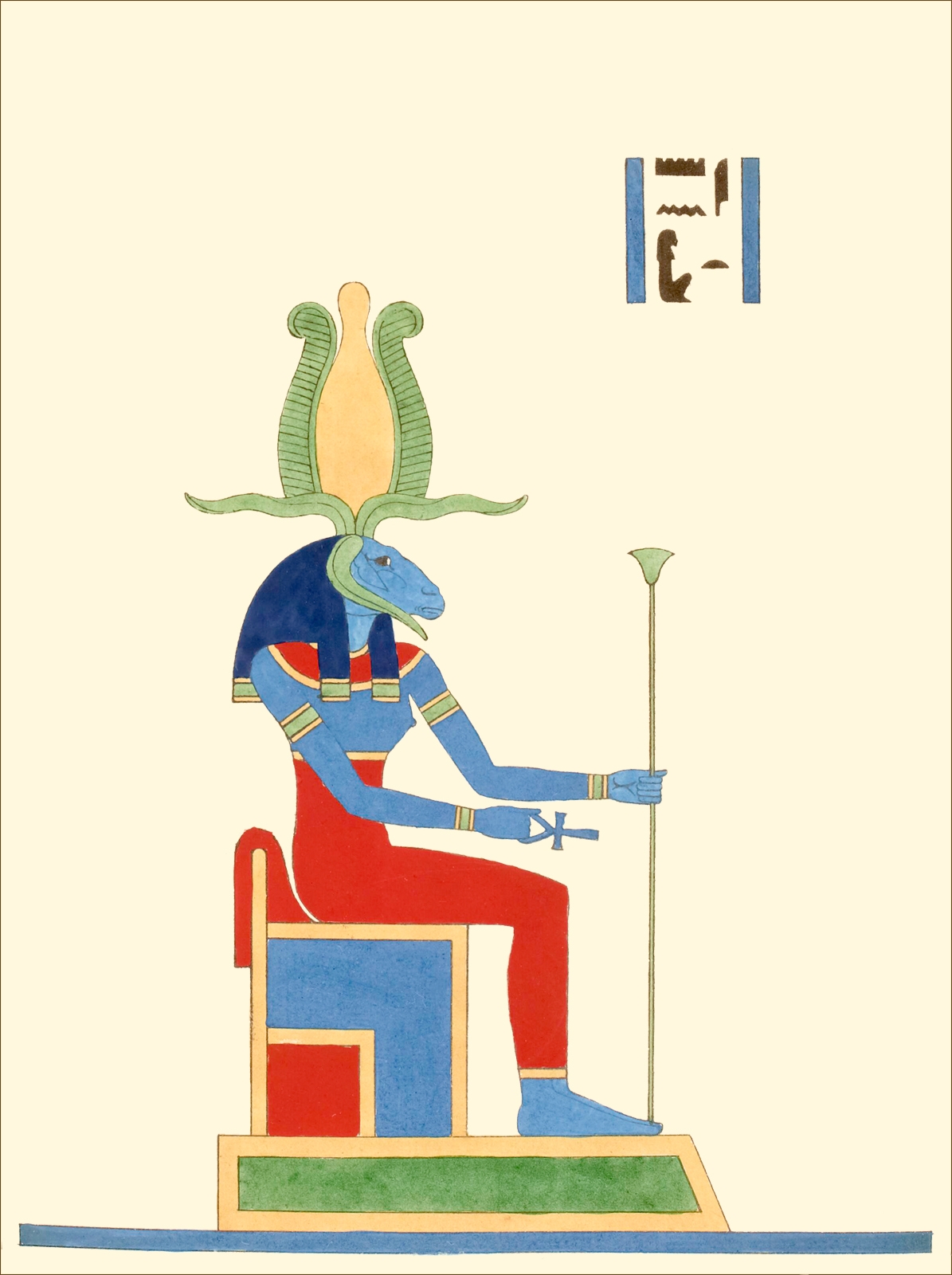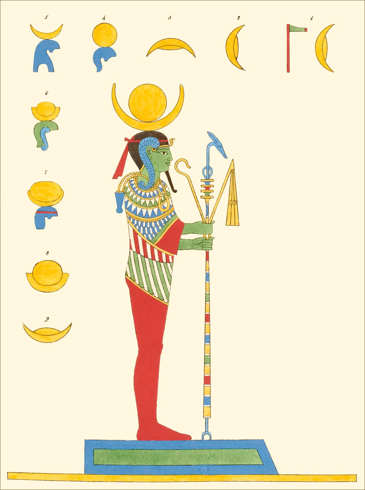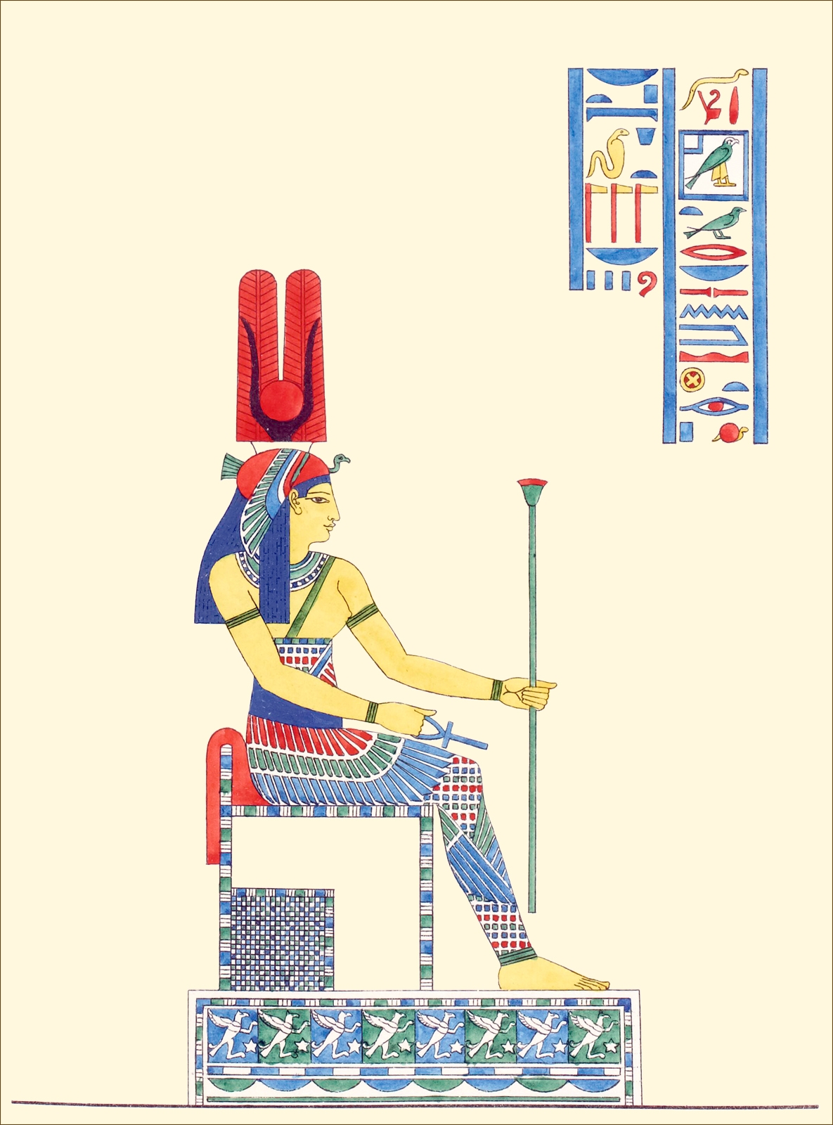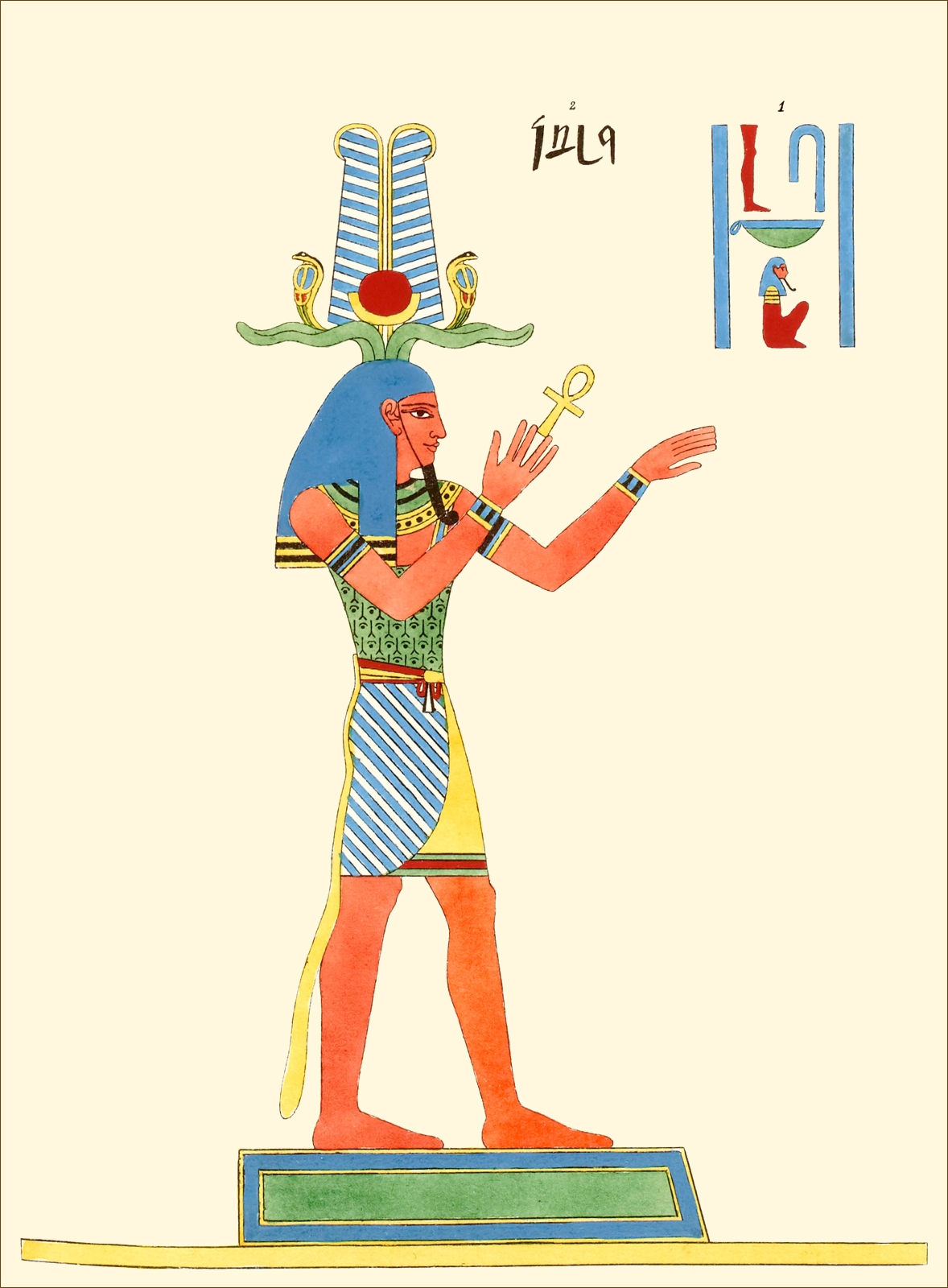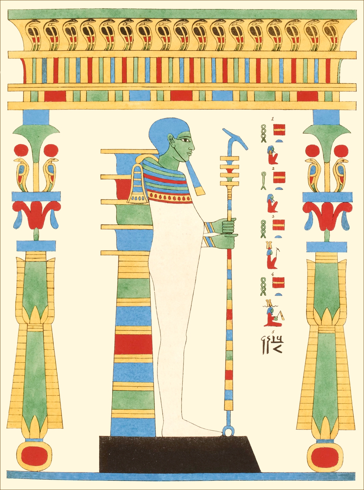 Ce dieu, de forme humaine, est ici représenté assis sur un trône, comme le sont pour l’ordinaire toutes les grandes divinités de l’Égypte. Sa carnation est bleue, couleur propre à ce personnage; sa barbe est figurée par une appendice noire qui caractérise les divinités mâles; et dans les cercueils de momie, cette même appendice indique toujours une momie d’homme; le dieu tient dans sa main gauche un sceptre terminé par la tête de cet oiseau qu’Horapollon nomme Koucoupha, sceptre commun à toutes les divinités mâles du Panthéon Égyptien, et qui était le symbole de la bienfaisance des dieux; dans sa main droite est la croix ansée, symbole de la vie divine; sa tête est ornée d’une coiffure royale, surmontée de deux grandes plumes peintes de diverses couleurs; de la partie postérieure de sa coiffure, descend une longue bandelette bleue; son col est orné d’un collier, parfois très-richement décoré; sa tunique, d’abord soutenue au-dessous du sein, au moyen de deux bretelles, est fixée vers les hanches par une ceinture bleue; des bracelets ornent le haut de ses bras, et souvent aussi la naissance du poignet.