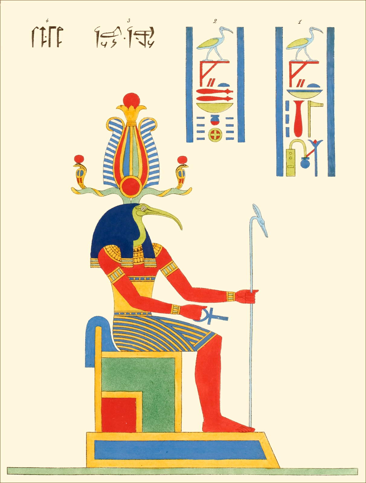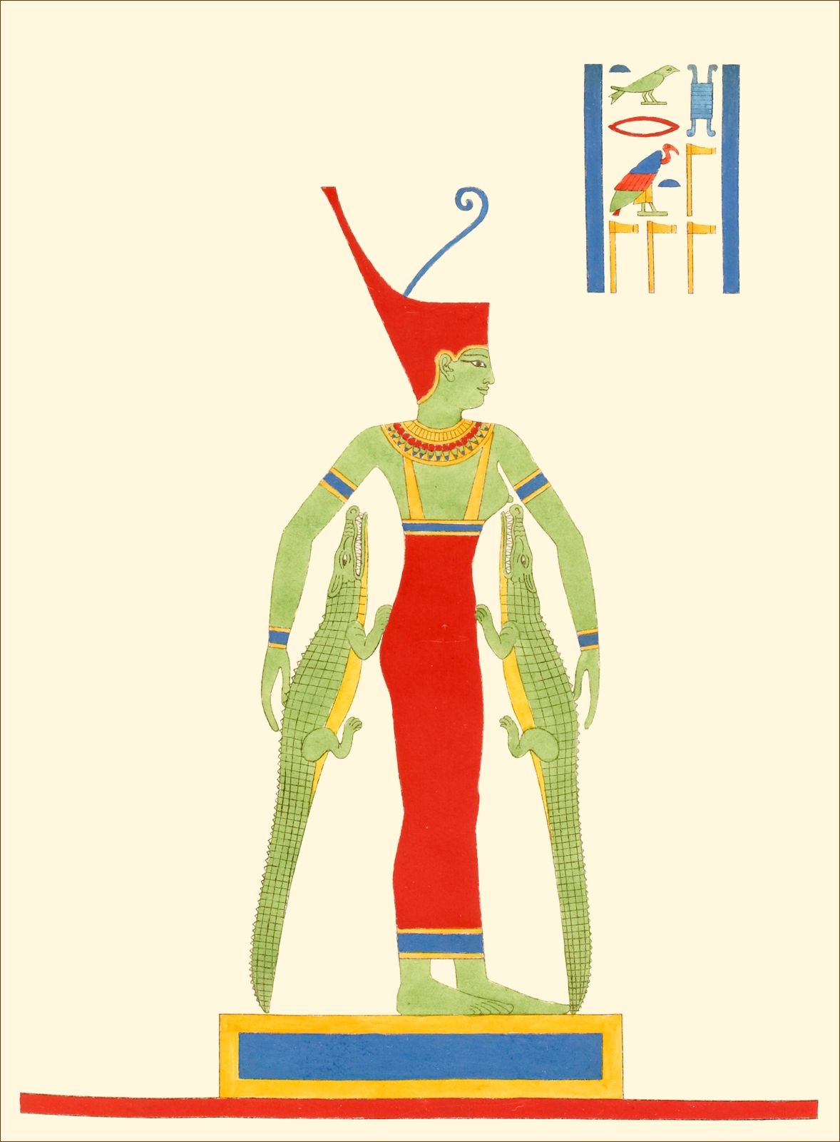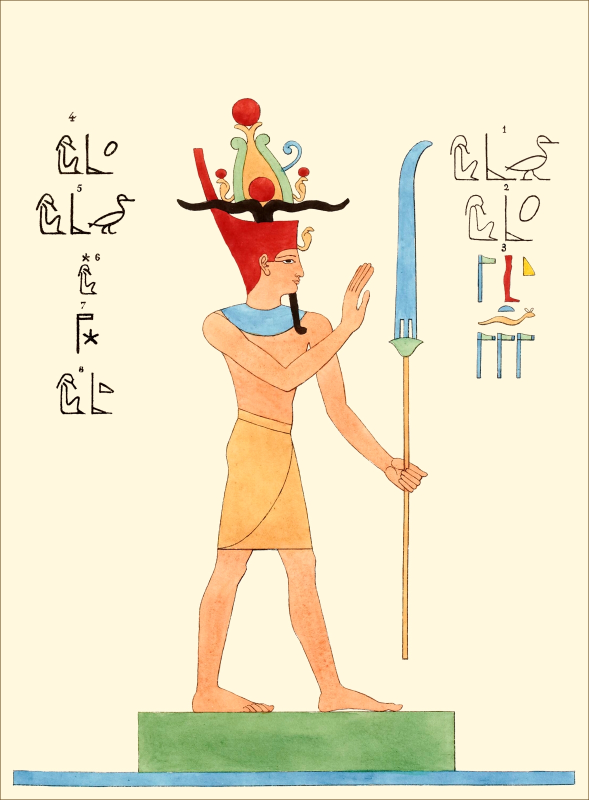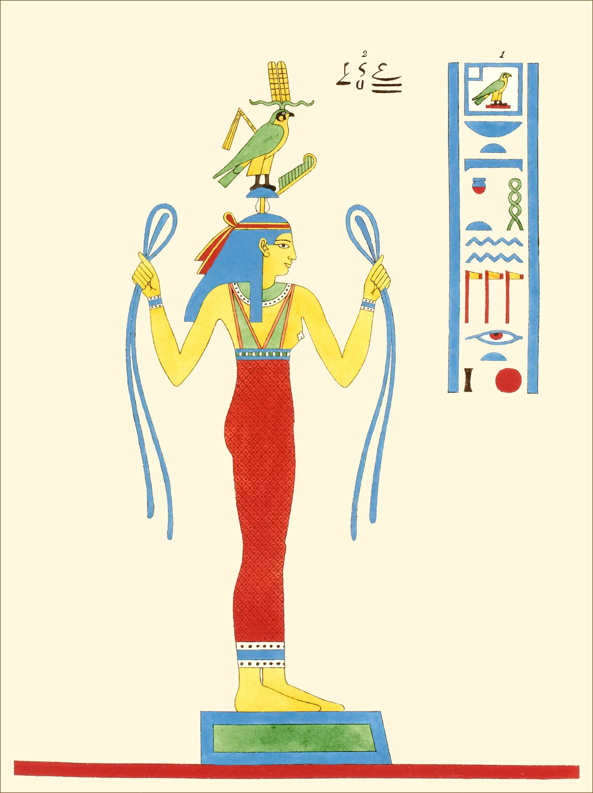 Ce dieu, de forme humaine, est ici représenté assis sur un trône, comme le sont pour l’ordinaire toutes les grandes divinités de l’Égypte. Sa carnation est bleue, couleur propre à ce personnage; sa barbe est figurée par une appendice noire qui caractérise les divinités mâles; et dans les cercueils de momie, cette même appendice indique toujours une momie d’homme; le dieu tient dans sa main gauche un sceptre terminé par la tête de cet oiseau qu’Horapollon nomme Koucoupha, sceptre commun à toutes les divinités mâles du Panthéon Égyptien, et qui était le symbole de la bienfaisance des dieux; dans sa main droite est la croix ansée, symbole de la vie divine; sa tête est ornée d’une coiffure royale, surmontée de deux grandes plumes peintes de diverses couleurs; de la partie postérieure de sa coiffure, descend une longue bandelette bleue; son col est orné d’un collier, parfois très-richement décoré; sa tunique, d’abord soutenue au-dessous du sein, au moyen de deux bretelles, est fixée vers les hanches par une ceinture bleue; des bracelets ornent le haut de ses bras, et souvent aussi la naissance du poignet.
