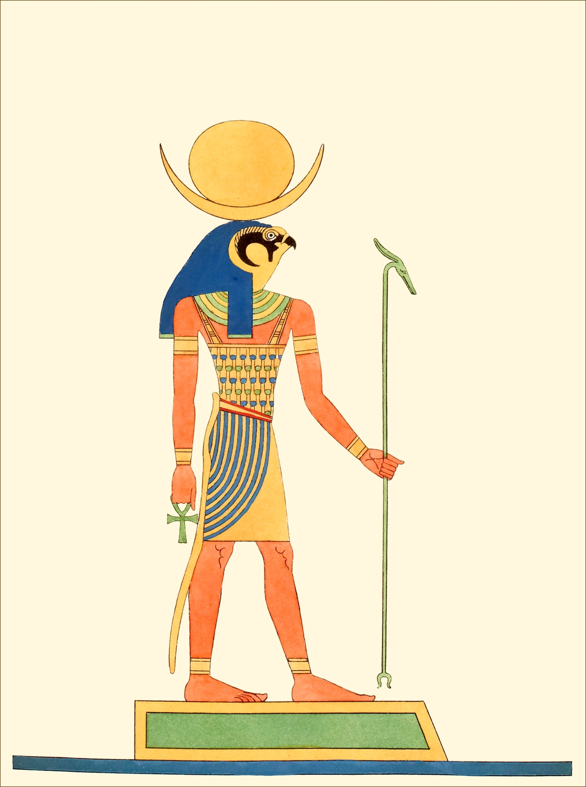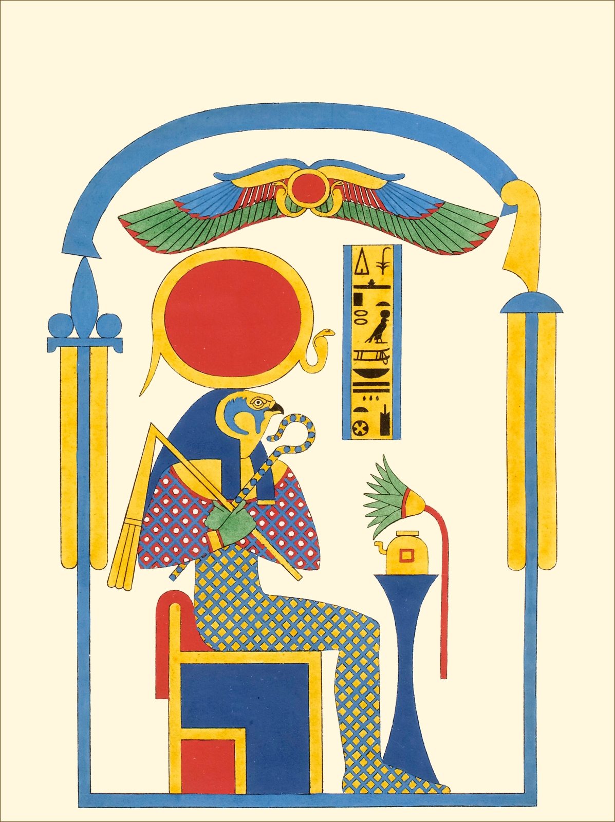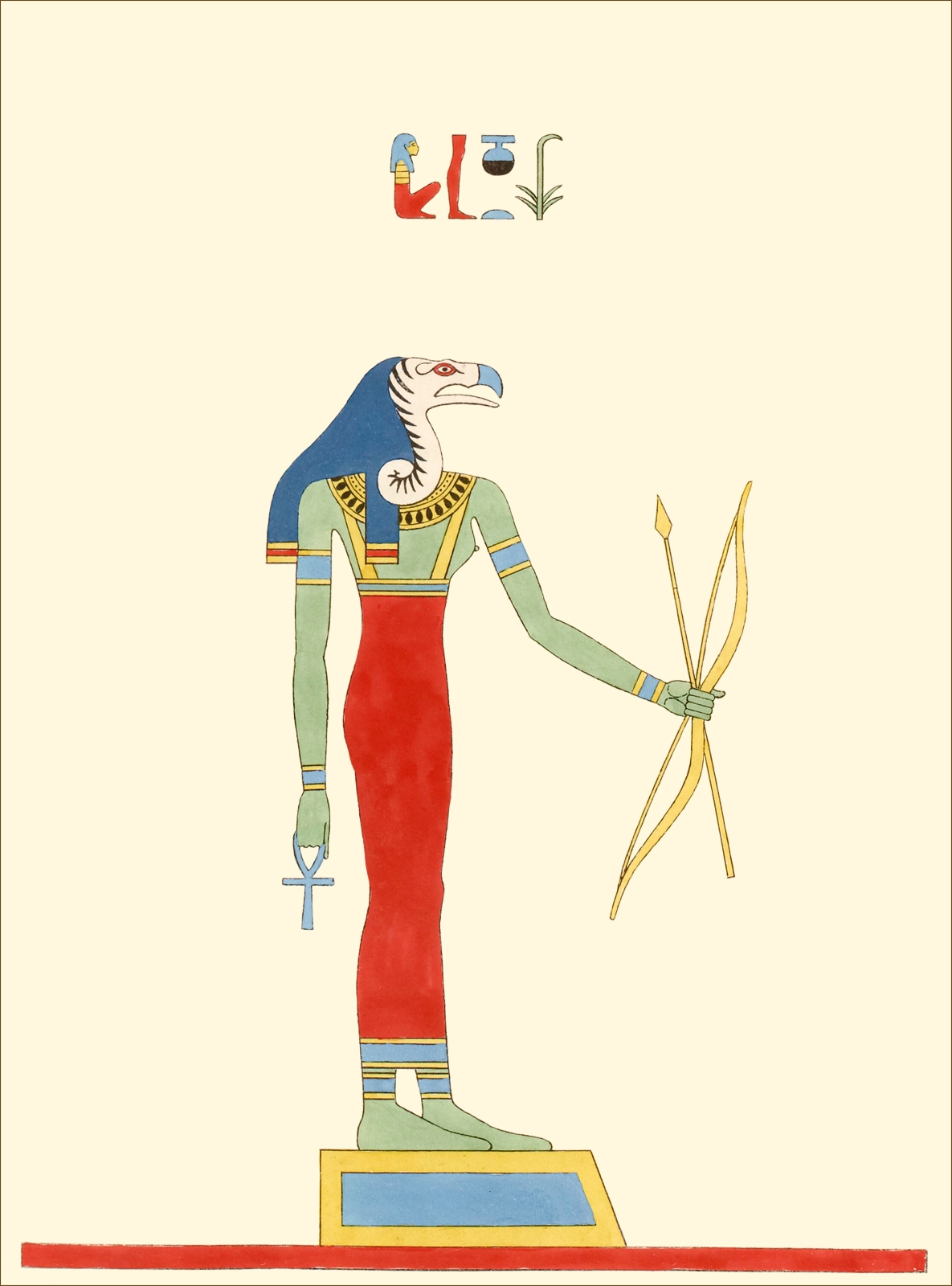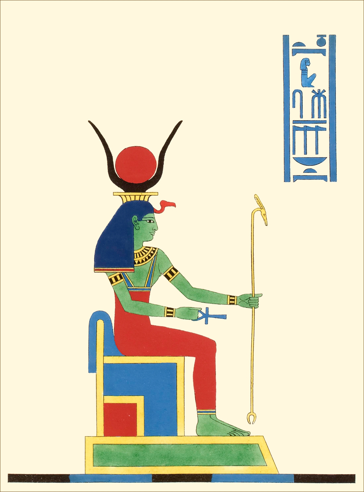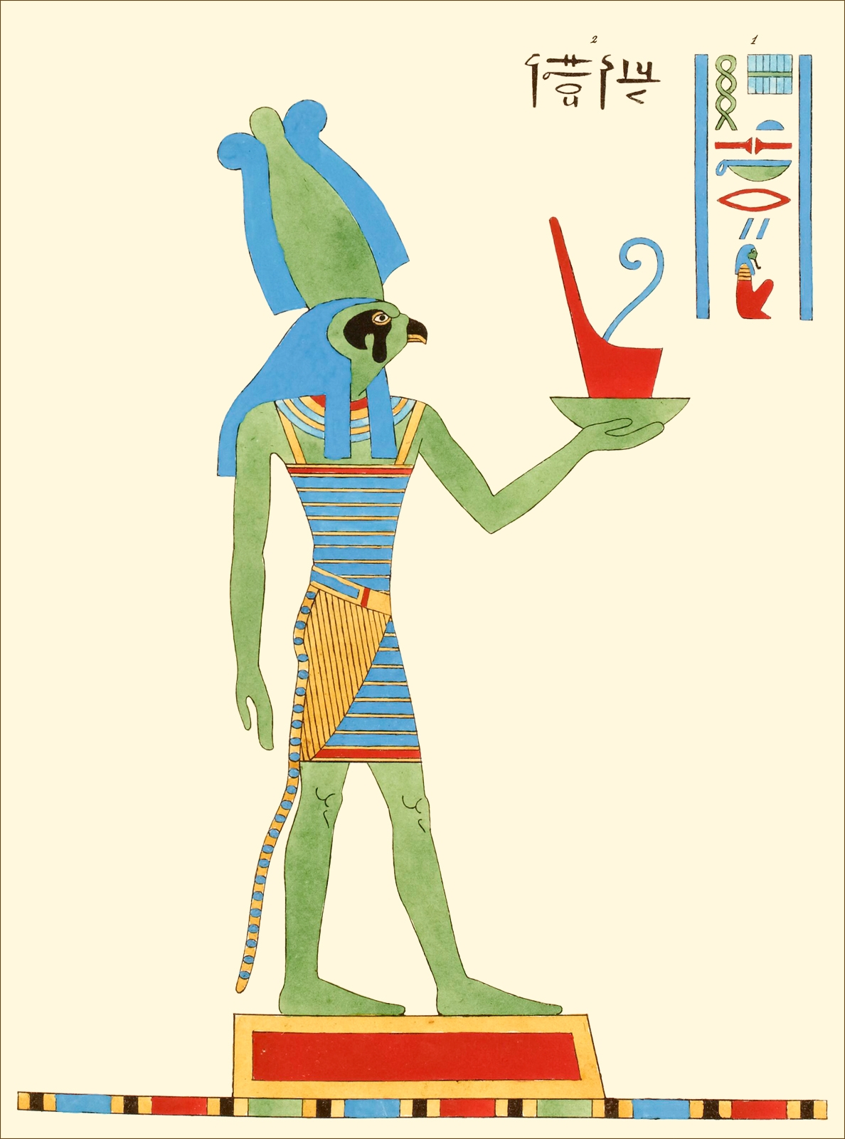 Ce dieu, de forme humaine, est ici représenté assis sur un trône, comme le sont pour l’ordinaire toutes les grandes divinités de l’Égypte. Sa carnation est bleue, couleur propre à ce personnage; sa barbe est figurée par une appendice noire qui caractérise les divinités mâles; et dans les cercueils de momie, cette même appendice indique toujours une momie d’homme; le dieu tient dans sa main gauche un sceptre terminé par la tête de cet oiseau qu’Horapollon nomme Koucoupha, sceptre commun à toutes les divinités mâles du Panthéon Égyptien, et qui était le symbole de la bienfaisance des dieux; dans sa main droite est la croix ansée, symbole de la vie divine; sa tête est ornée d’une coiffure royale, surmontée de deux grandes plumes peintes de diverses couleurs; de la partie postérieure de sa coiffure, descend une longue bandelette bleue; son col est orné d’un collier, parfois très-richement décoré; sa tunique, d’abord soutenue au-dessous du sein, au moyen de deux bretelles, est fixée vers les hanches par une ceinture bleue; des bracelets ornent le haut de ses bras, et souvent aussi la naissance du poignet.