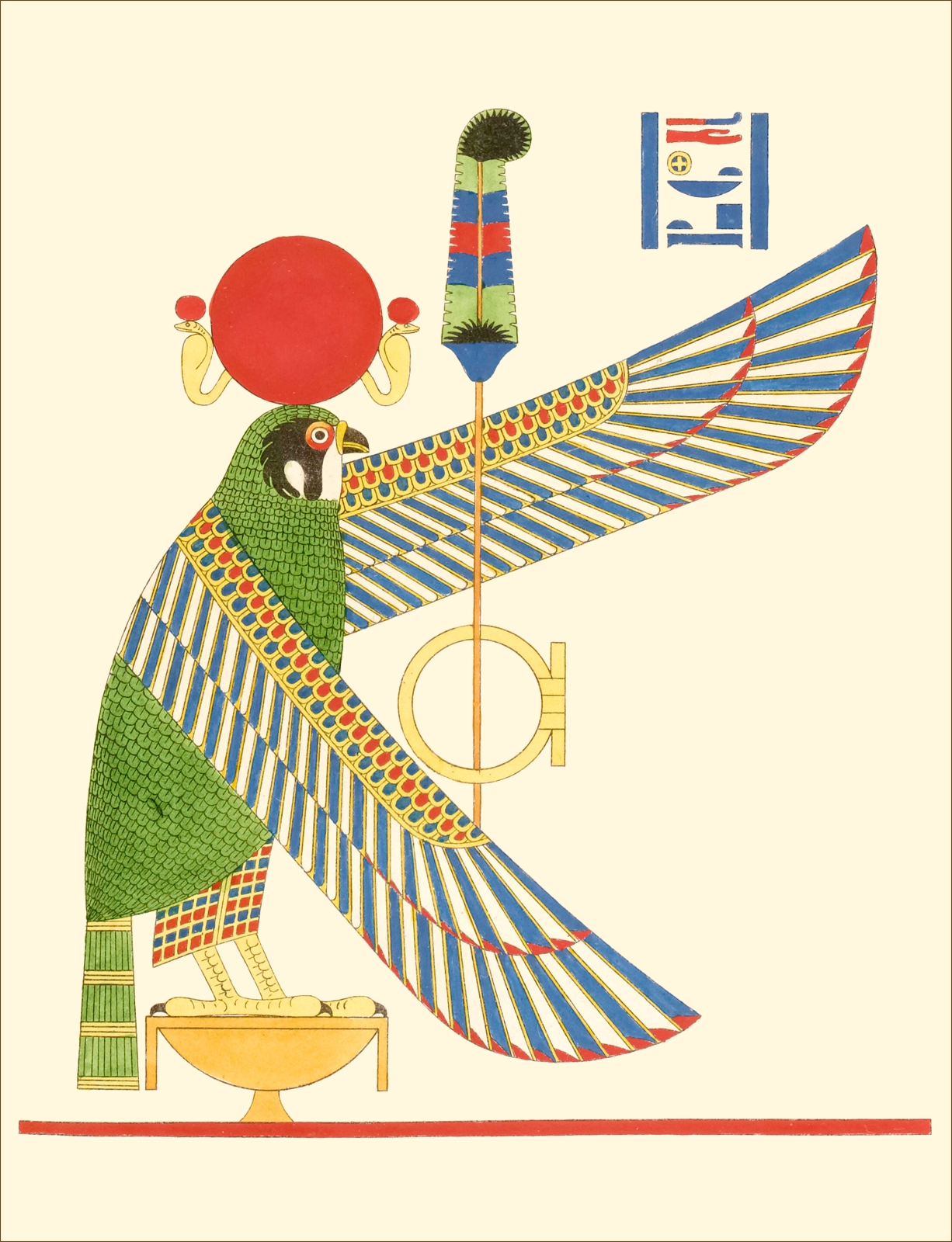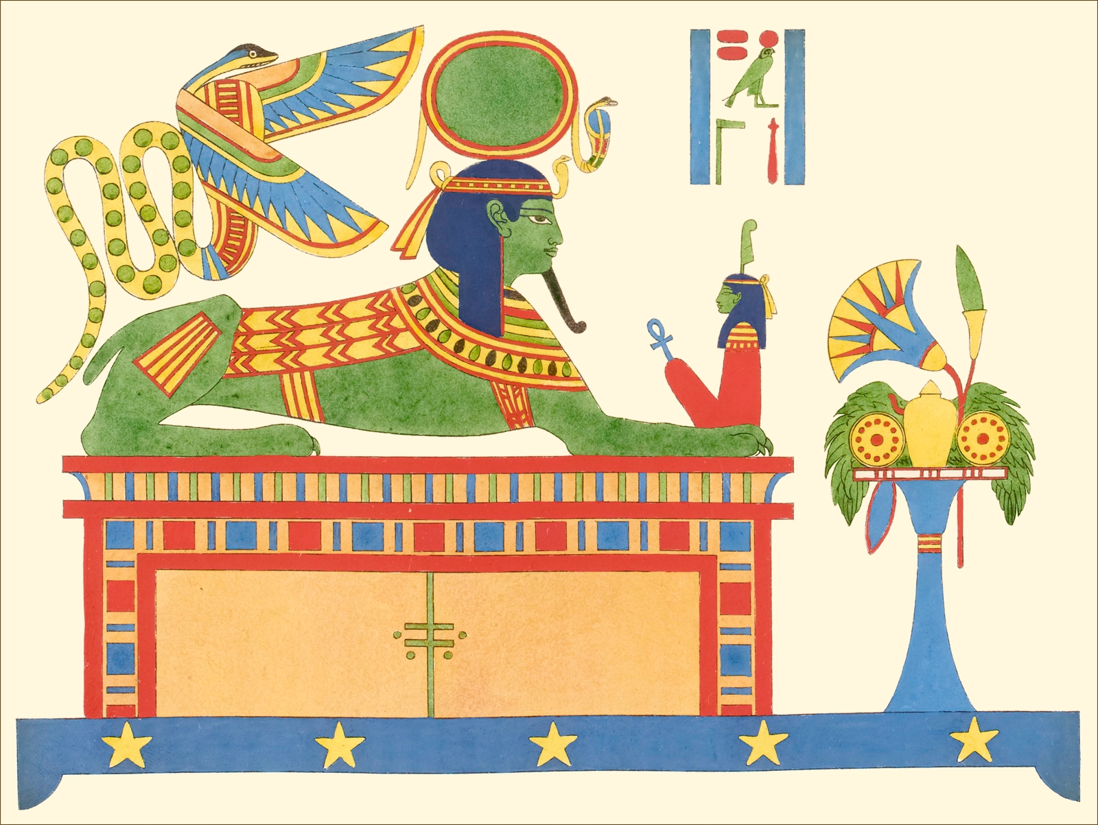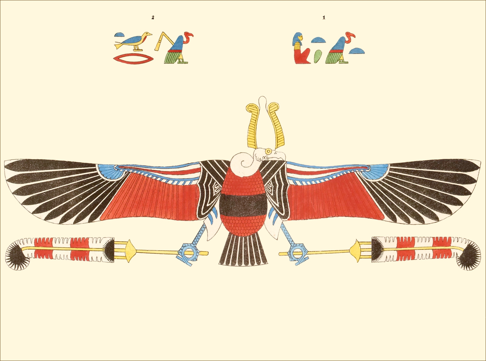 Notre planche 2.4[21] représente le bélier sacré à une seule tête décorée du disque et de l’uræus. L’épervier, symbole du soleil, voltige 11 au-dessus du bélier, aux pattes antérieures duquel sont liés des serpents uræus portant la coiffure emblématique des régions d’en haut; d’autres uræus, la tête couverte de la coiffure emblématique des régions d’en bas, paraissent attachées aux pattes postérieures de l’animal sacré, marchant sur la forme d’une coudée (mesure égyptienne de longueur), peinte en vert. Le tout repose sur un autel enrichi d’ornements peints de diverses couleurs.