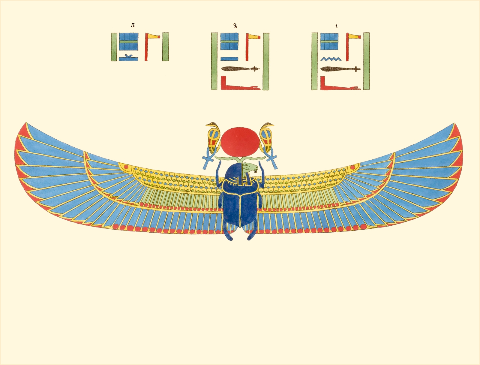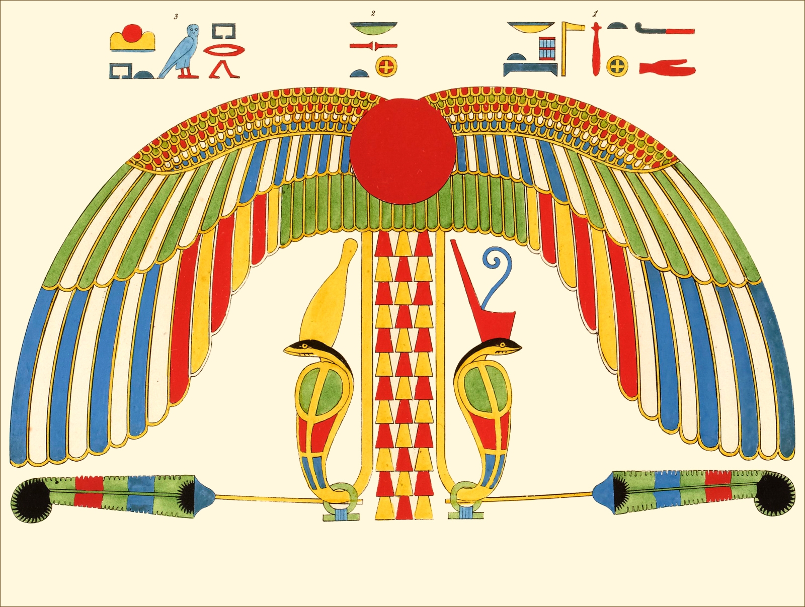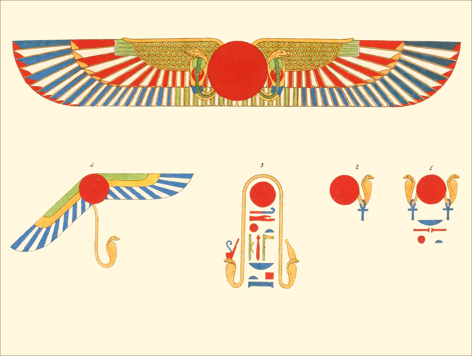 Notre planche 2.4[21] représente le bélier sacré à une seule tête décorée du disque et de l’uræus. L’épervier, symbole du soleil, voltige 11 au-dessus du bélier, aux pattes antérieures duquel sont liés des serpents uræus portant la coiffure emblématique des régions d’en haut; d’autres uræus, la tête couverte de la coiffure emblématique des régions d’en bas, paraissent attachées aux pattes postérieures de l’animal sacré, marchant sur la forme d’une coudée (mesure égyptienne de longueur), peinte en vert. Le tout repose sur un autel enrichi d’ornements peints de diverses couleurs.