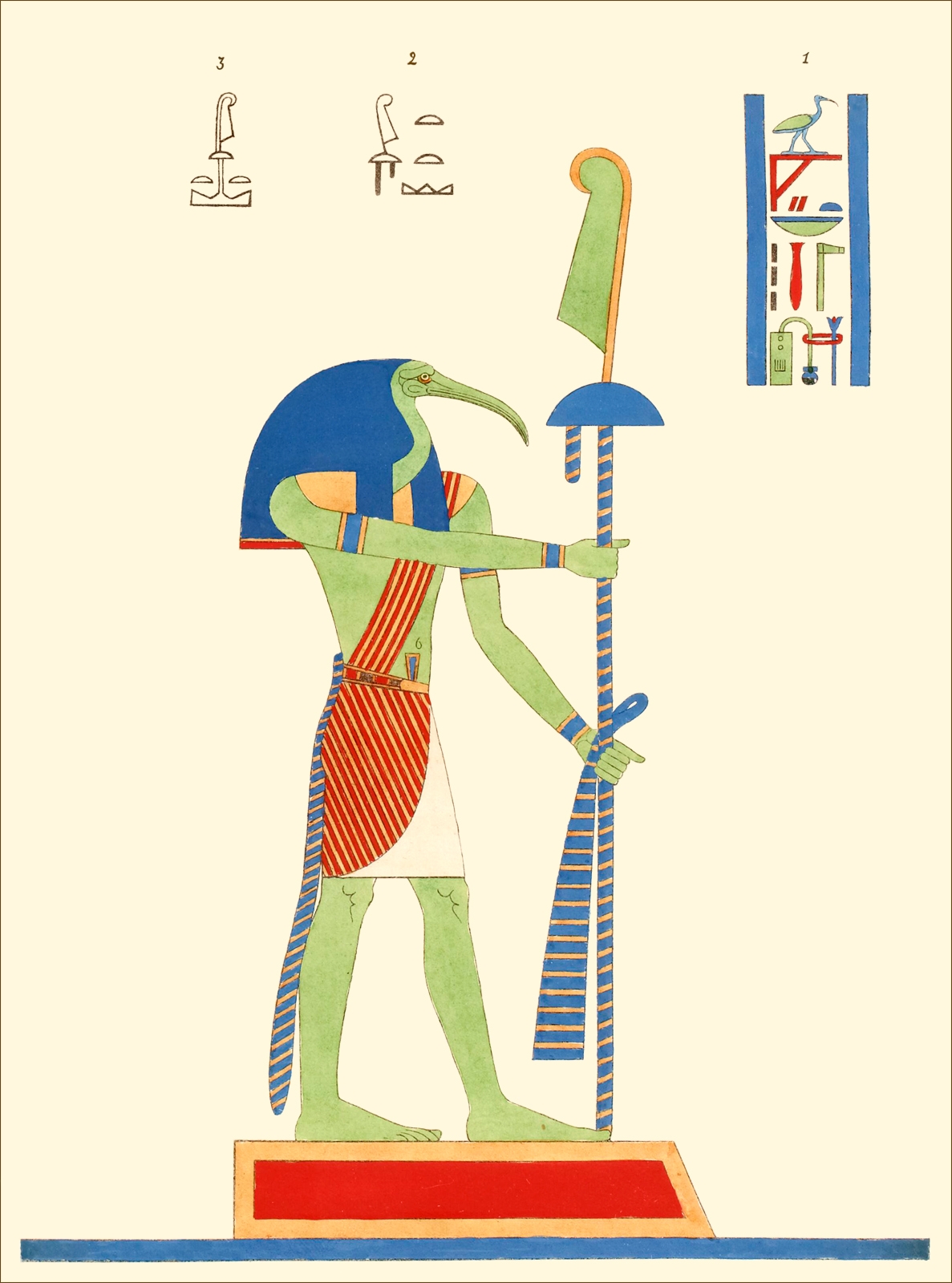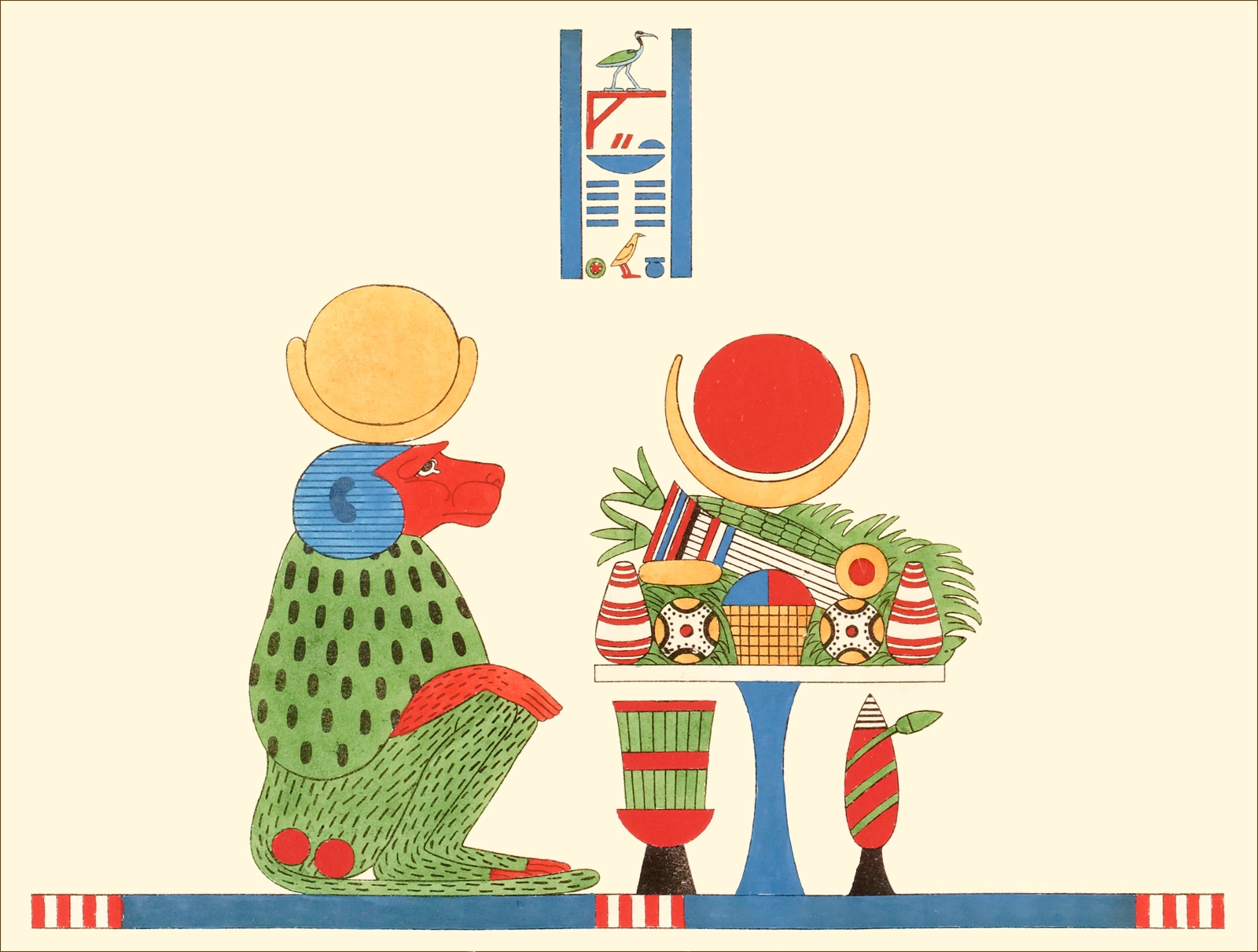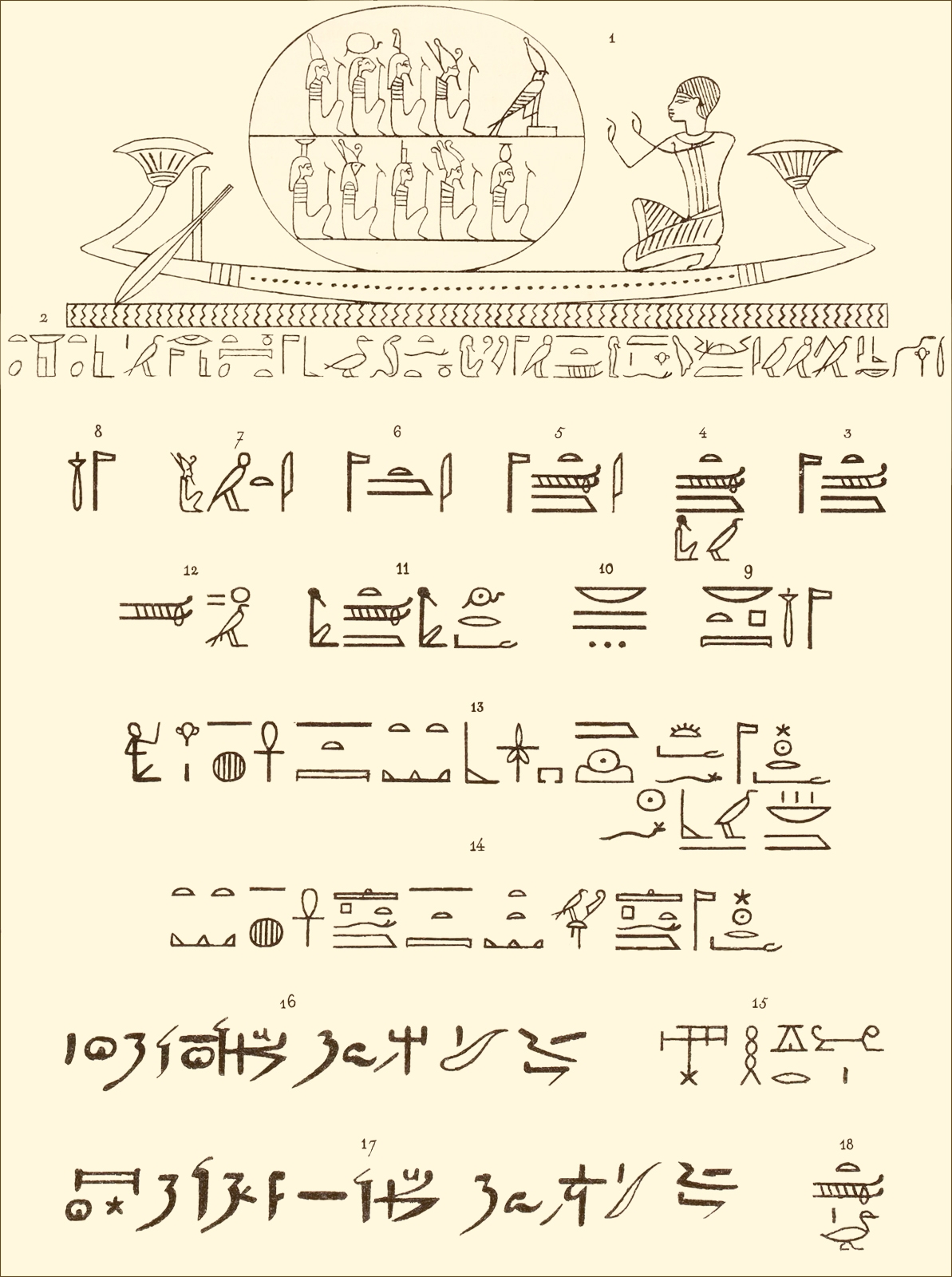 [433] Voyez planches 29, lég. no 1; et 29.2, lég. no 1.—Caylus, tome VI, pl. a, no 2 et 3.—Grand Mss. hiérogl., Description de l’Egypte, pl. 72; Scène du Jugement, lég. du Dieu; et toutes les légendes de Thoth Ibiocéphale sur les cercueils de momies.