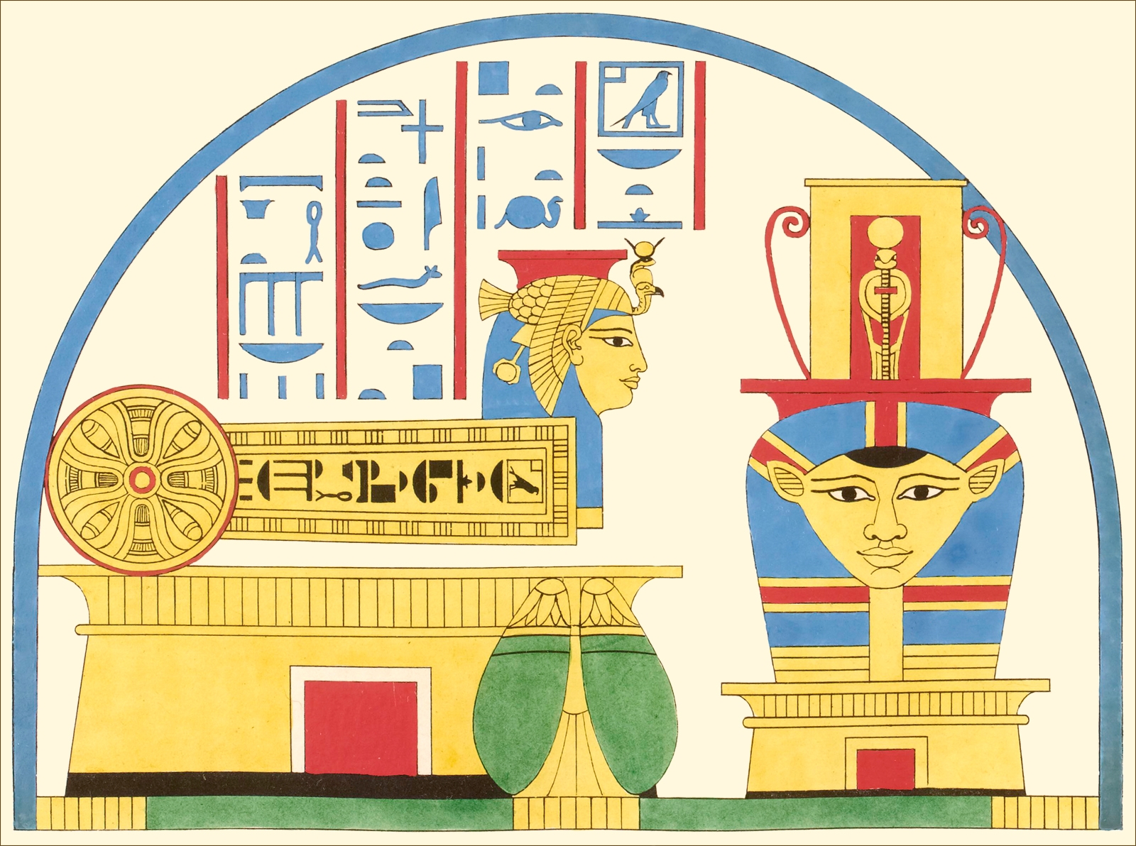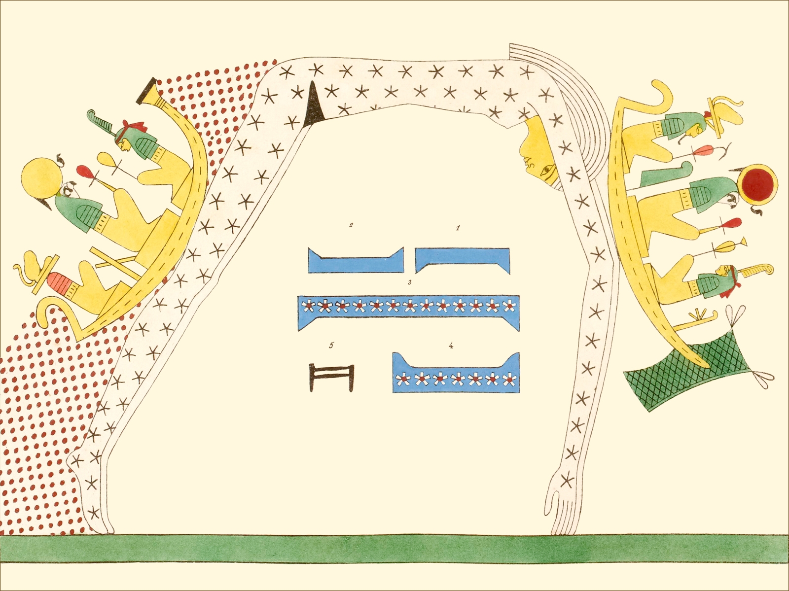 [472] Je me suis assuré, pendant mon séjour aux ruines d’Ombos en 1829, que le champ du listel, sur lequel on a gravé cette inscription, était jadis doré, et que toutes les lettres furent remplies d’une couleur rouge éclatante.