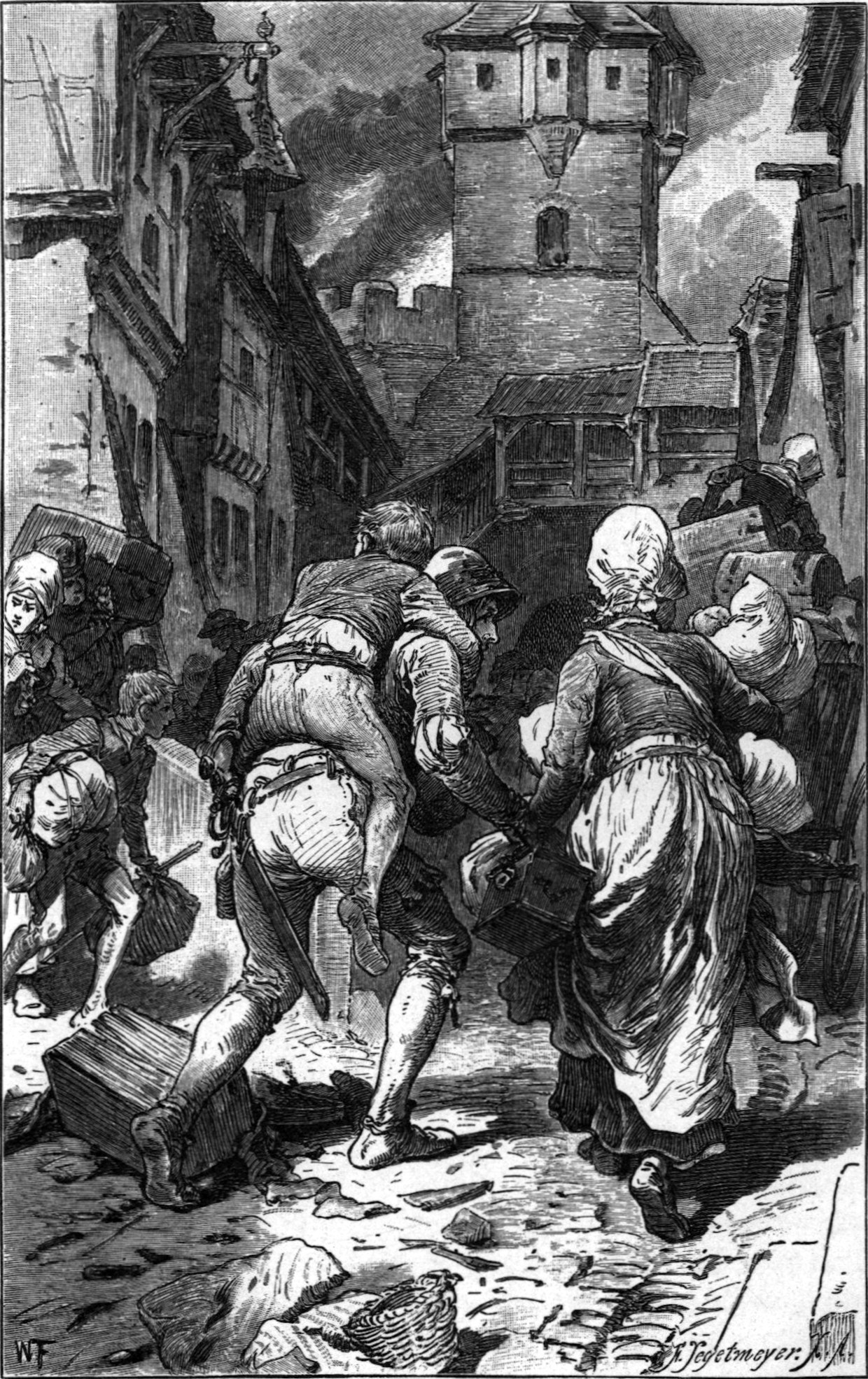 Ein Schlag gegen die Hausthür schreckte sie aus dumpfem Brüten auf; blutbespritzt, mit dem Ausdruck der Verzweiflung in den verzerrten Zügen, stand Matthias vor ihr. „Fort, fort!“ keuchte er, „die Burgunder sind auf den Wällen, in wenig Augenblicken überschwemmen sie die Stadt. Wehe dem, den sie hier finden!“ Er nahm Hans auf den[S. 13] Rücken, ergriff Afras Hand mit eisernem Druck und eilte mit den Seinen dem südlichen Thore zu, das von dem feindlichen Angriff noch verschont geblieben war. Schon wälzte sich ein breiter Strom von Flüchtlingen die Straße hinab, erzwang die Öffnung des Thores und stürmte hinaus, dem nahen Walde zu. Zu Fuß, zu Pferde, in Wagen und Karren suchten die unglücklichen Bewohner sich und ihre Habe in Sicherheit zu bringen, während hinter ihnen entsetzliches Geschrei und wildes Toben anzeigte, daß die wütenden Feinde in die besiegte Stadt eingedrungen seien.