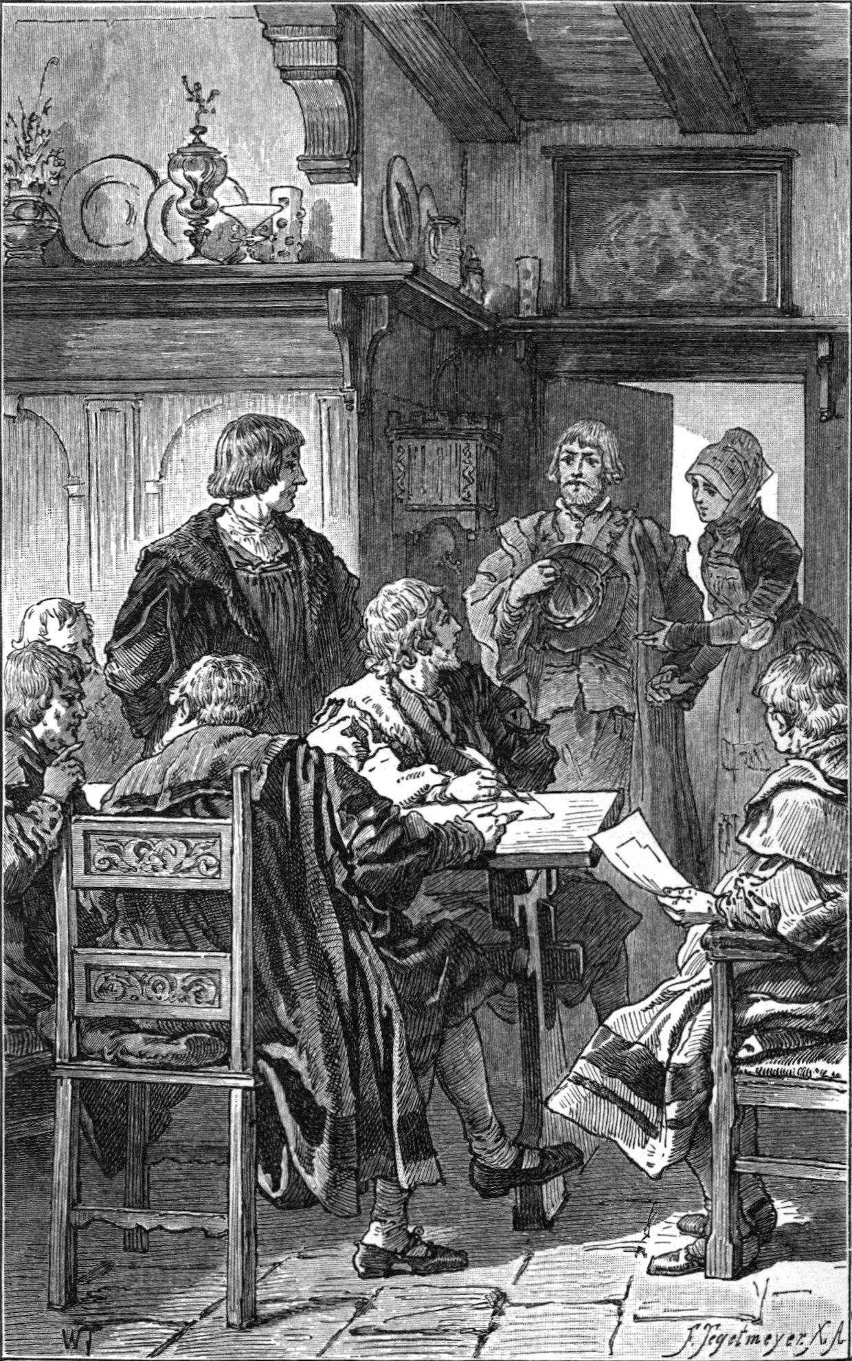 In einem Zimmer des Erdgeschosses, der Schreibstube des Hausherrn, saßen zwei Männer, der eine in dunkler, bürgerlicher Tracht, mit pelzverbrämter Schaube, der andre von ritterlichem Aussehen, in grünem Samtwams, kurzen Beinkleidern und hohen Reiterstiefeln, — eine kräftige Gestalt, welche durch die Jahre nicht gebeugt, sondern nur gerundet worden war. Es war der Ritter Werner von Maltheim, der auf der Burg gleichen Namens, dem alten Erbe seiner Väter, saß,[S. 20] ein getreuer Freund und Anhänger des Burg- und Markgrafen Albrecht Achilles, des streitbaren Hohenzollernfürsten. Der Mann ihm gegenüber war der Herr des stattlichen Patrizierhauses, Herr Wilibald Ebner, eines der reichsten und angesehensten Glieder der ansehnlichen Nürnberger Kaufmannsgilde. Er war viel kleiner und schmächtiger gebaut, als sein ritterlicher Gast, aber sein kluges Auge deutete auf einen scharfen, gebildeten Verstand und ließ ihn dem Kriegsmann sehr überlegen erscheinen. Er saß auf dem einzigen Stuhl des Gemaches vor einem großen Schreibpult, über dem von der Decke herab eine Ampel hing, die fast den ganzen Tag brennen mußte; der Ritter hatte auf einer der schweren Truhen Platz genommen, welche zu größerer Bequemlichkeit mit weichen Kissen belegt waren.
