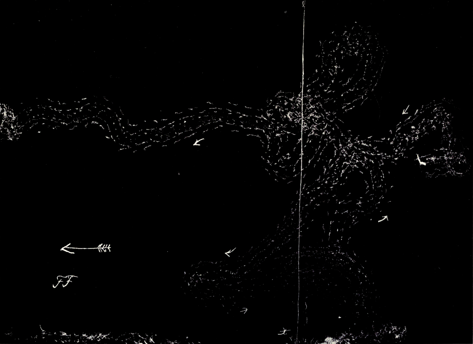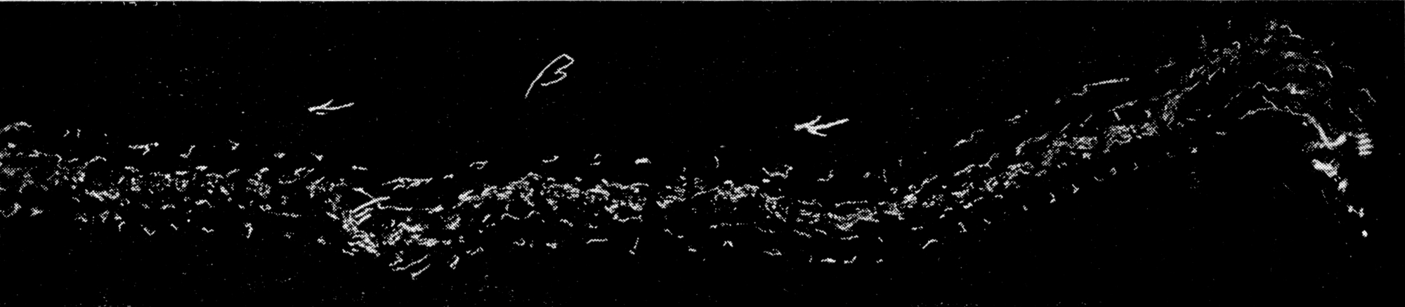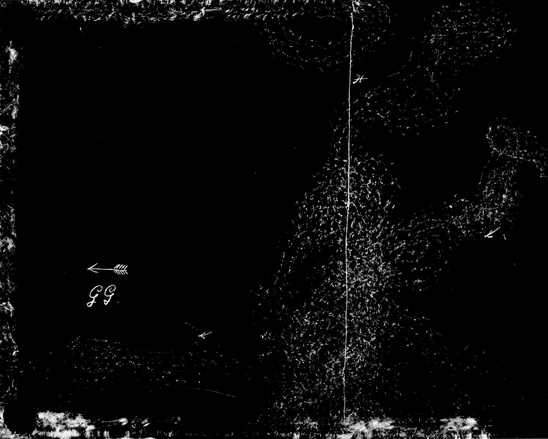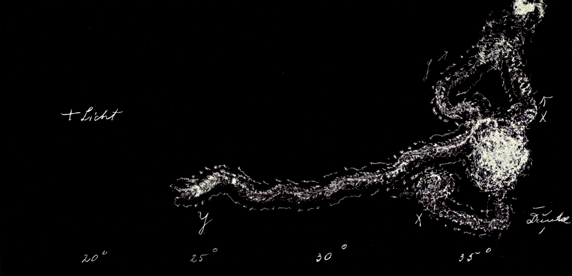 Fig. 4. Versuch GG. Licht von rechts einfallend in der Richtung des Pfeils. Schattenregion rechts bis zur Linie X. Reichliche Versuchsbewegungen an der Schattengrenze. An den Rändern die Spuren der durch Thigmotaxis an den Wänden festgehaltenen Individuen.