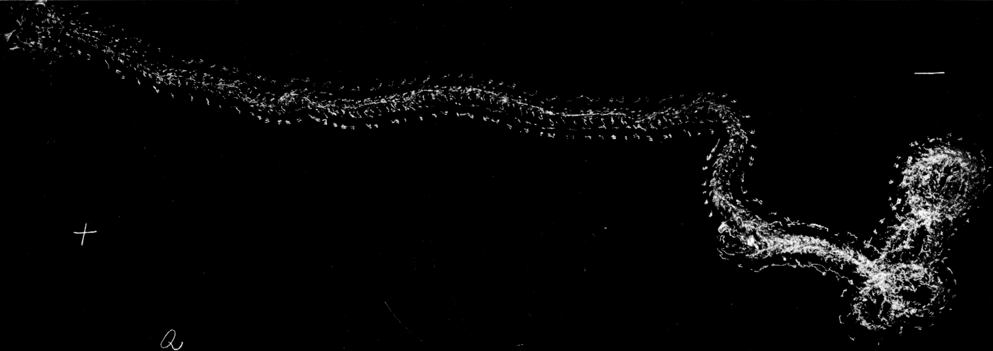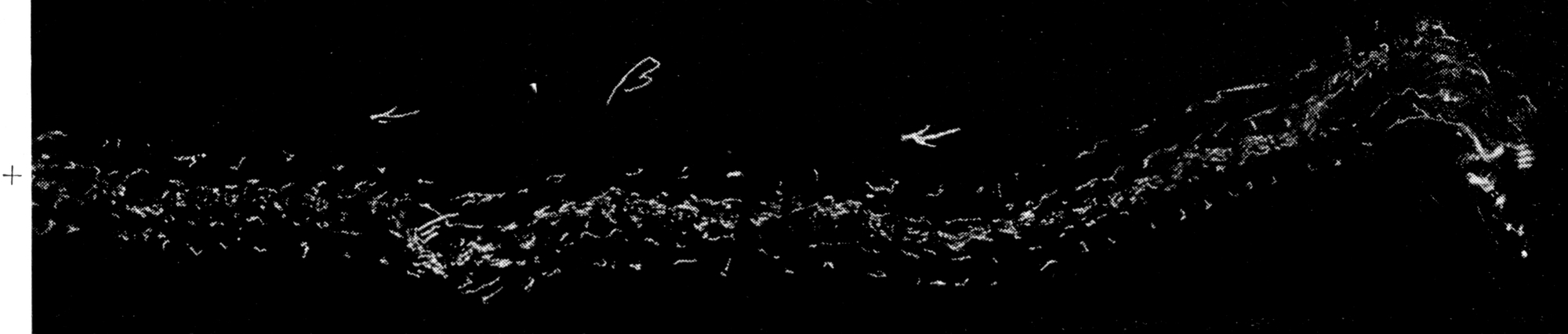 Fig. 1. Versuch Q. Phototaxisversuch. Einfall des Lichts von + her. Tier, bei − eingesetzt, führt eine Anzahl Versuchsbewegungen aus, um dann nach erfolgter Drehung (Hinterleibsspitze gegen +) energisch gegen die Lichtquelle zu kriechen. Die verhältnismäßig zahlreichen Versuchsbewegungen bei − sind durch Interferenz mit Thermotaxis zu erklären. Bei − war das Papier leicht erwärmt durch untergelegtes Sandbad. Temperatur dort etwa 25° C.