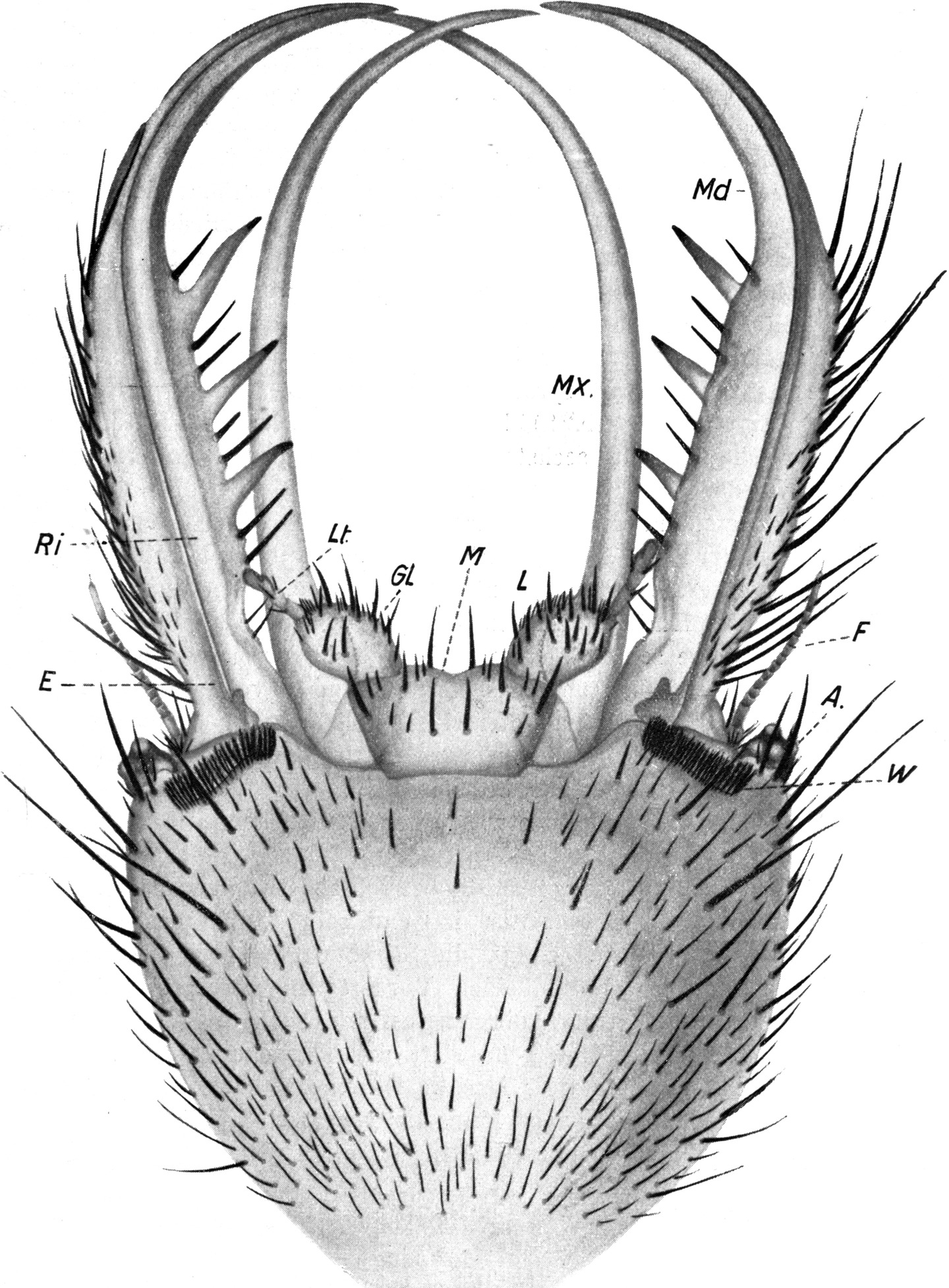 An der Unterseite findet sich nur am Außenrand in der Nähe der Basis eine Gruppe von Borsten, die einigermaßen dicht stehen, glatt, gekrümmt und nach vorn gerichtet sind (Abb. 4). An der Unterseite zieht sich ferner bis zur Spitze der Mandibel eine Rinne hin, welche an der Basis breiter, an der Spitze schmäler ist, und deren äußerer Rand dem Außenrand der Mandibel parallel verläuft (Abb. 4 Ri). Sie wird von Wülsten begrenzt, von denen der äußere stärker entwickelt ist.