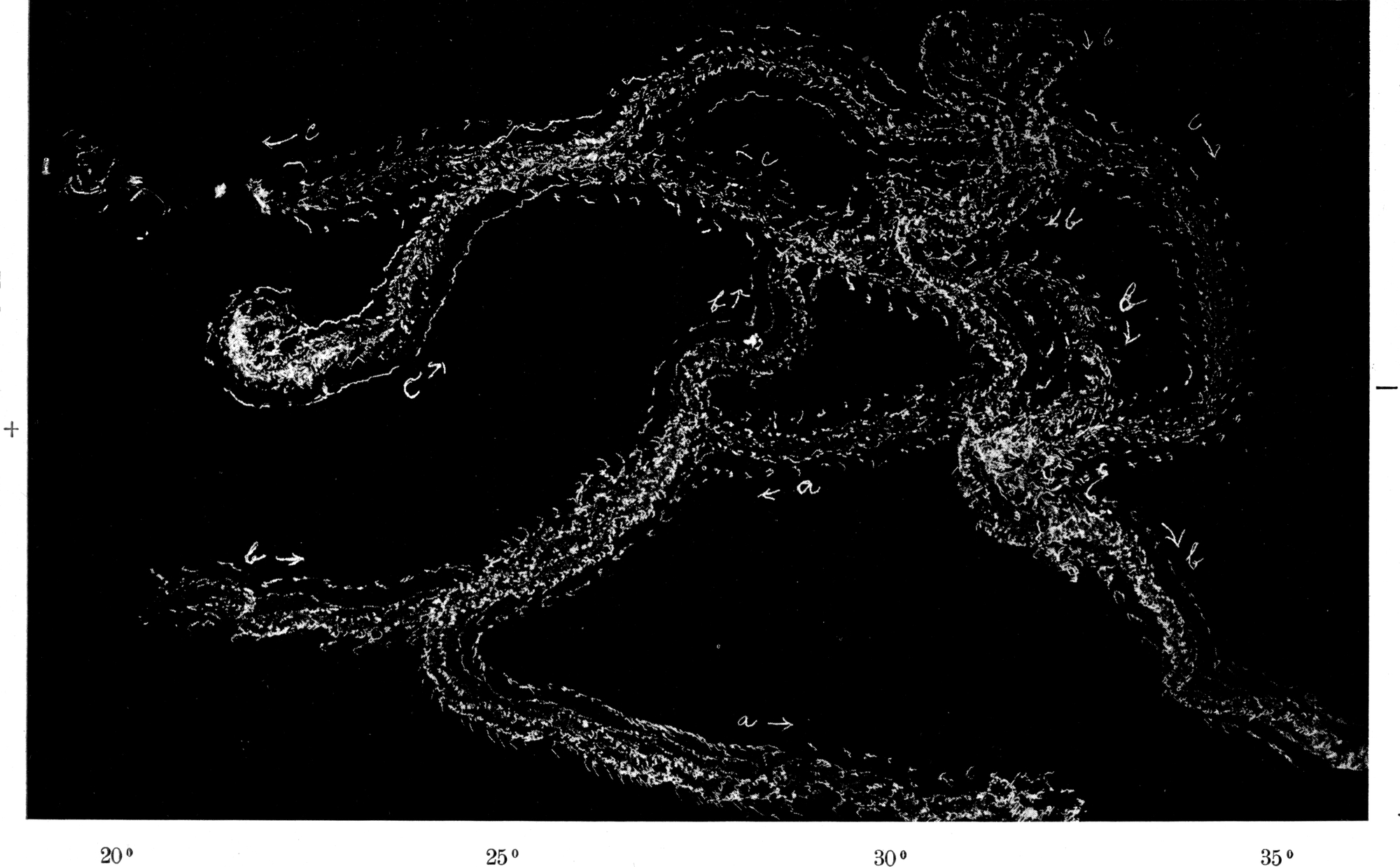 Fig. 10. Versuch O. Zusammenwirken von Photo- und Thermotaxis. Bei + Lichteinfall, bei − dunkelste Region. Die Grade geben die Bodentemperatur der betreffenden Region an. Tier a beginnt bei 35° C seinen Weg, ehe das Rußpapier die Temperatur angenommen hatte, kriecht zuerst aufs Licht zu, wird dann thermotaktisch erregt, kriecht zurück in die Wärme und verläßt, thigmotaktisch gereizt, das Versuchsfeld. Tier b kriecht aus dem Licht in die Wärme und verläßt, bei der Höchsttemperatur thigmotaktisch gereizt, das Versuchsfeld. Tier c macht zuerst einen Versuchskreis, geht dann in die Wärme, schwankt zwischen Wärme und Licht, um schließlich energisch sich zum Licht zu wenden.