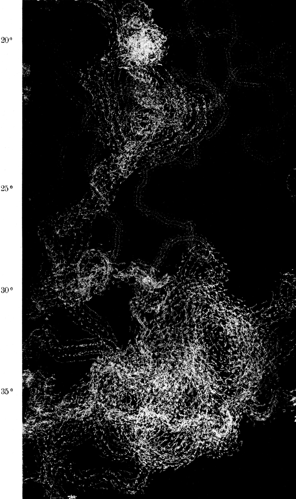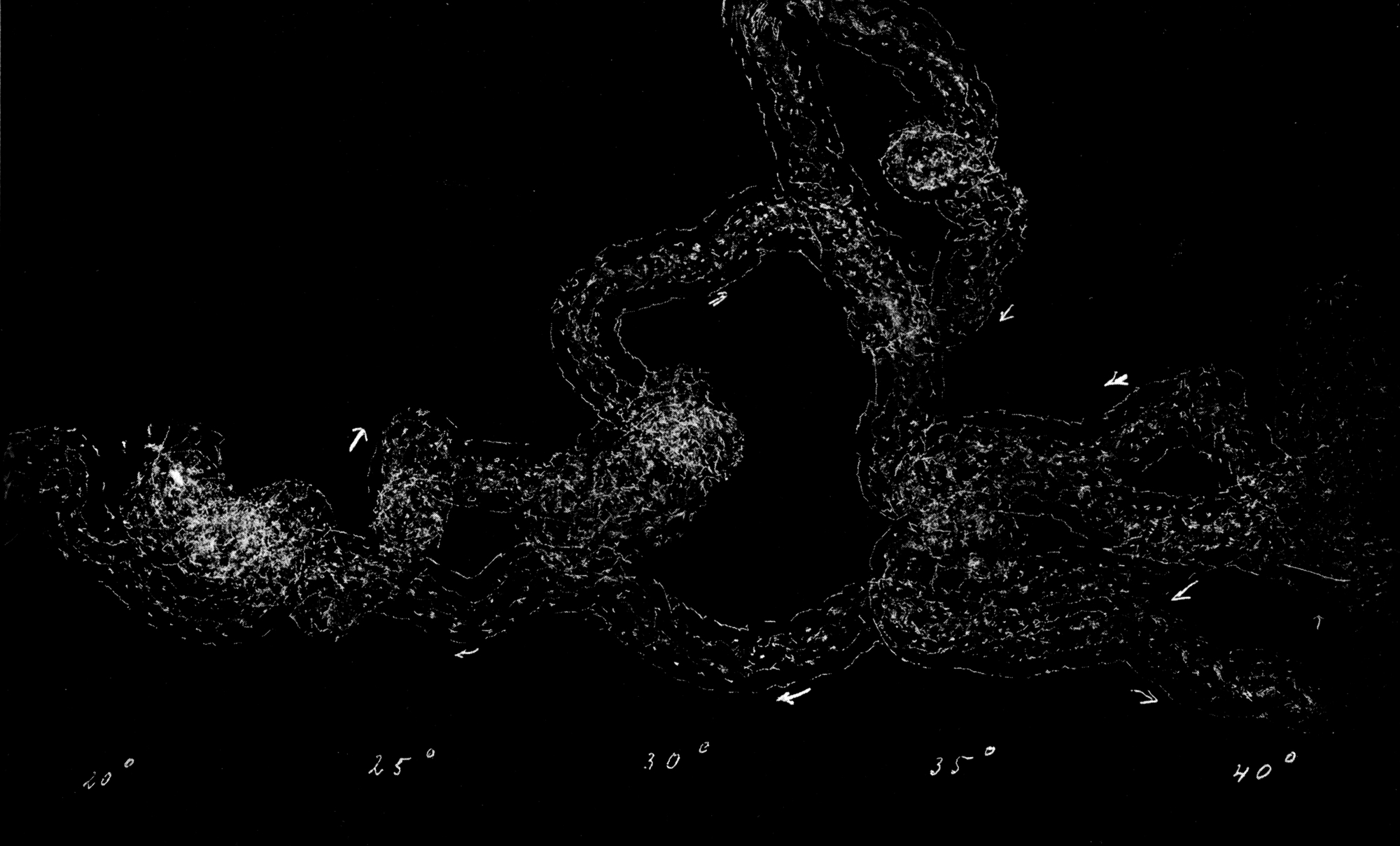 Fig. 2. Versuch N. 3 Exemplare bei vollkommener Dunkelheit auf verschiedenen Stellen des von 20° C auf 35° C ansteigend erwärmten Grundes niedergelegt. Sehr viele Versuchsbewegungen; zum Teil ganz kleine Kreise. Sehr lebhafte Bewegungen durch Dunkelheit und Wärme angeregt. Alle Tiere langten schließlich in der Region bei 35° an, zum Teil thigmotaktisch am Rand festgehalten und dort weiterwandernd. Versuchsdauer 11h 45′ bis 12h 45′.