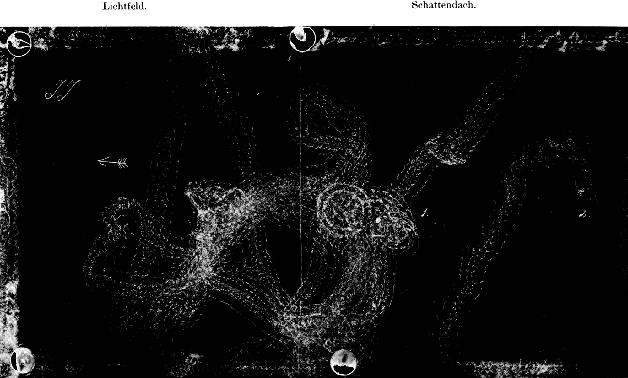 Fig. 5. Versuch JJ. Licht von rechts einfallend in der Richtung des Pfeils; Beleuchtung schwach und nicht sehr tief unter das Schattendach rechts eindringend. Daher Exemplar 2 gar nicht durch das Licht orientiert. Exemplar 1 viele Versuchsbewegungen ausführend, ehe Orientierung in der Nähe der Schattengrenze erfolgt. Nach Eintritt in das Lichtfeld bald Umkehr unter dem Einfluß der Lichtrichtung, dann im Schatten bald wieder Umkehr zum Licht. Kein Stocken an der Schattengrenze. Später Thigmotaxis.