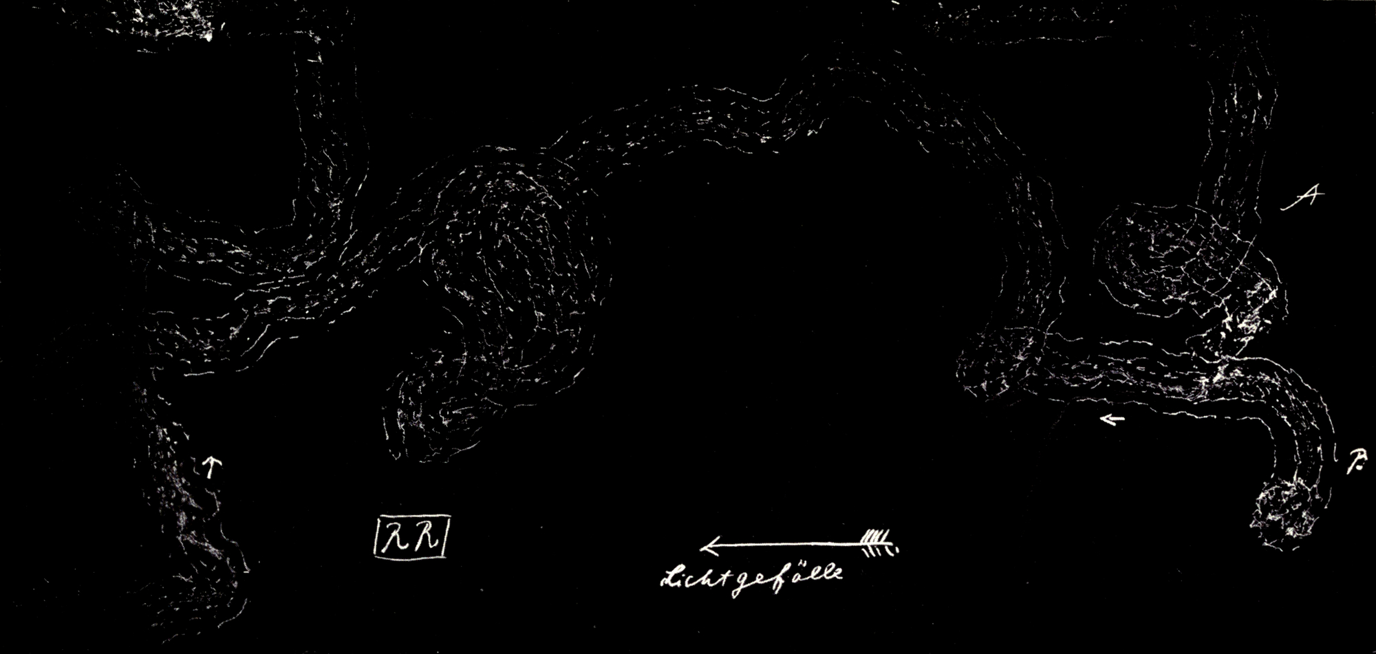Fig. 7. Versuch RR. Ausgeführt 6. Nov. 1914. Lichtgefälle in der Pfeilrichtung, hergestellt durch Oltmanns’ Prisma. Versuch in Dunkelkammer; Wärmewirkung verhindert durch gekühlten Boden und Kühlwanne zwischen Licht und Experimentierfläche. A Exemplar zum erstenmal eingesetzt 10h 50′, nach geringen Versuchsbewegungen in der Richtung des stärkeren Lichtes in Bewegung gesetzt, bald durch Thigmotaxis abgelenkt. B Dasselbe Exemplar noch einmal eingesetzt 11h 50′. Kriecht auch schwankend, doch direkt in die hellere Zone, bewegt sich, dort zum Teil thigmotaktisch etwas gestört, im helleren Raum, ohne Bevorzugung einer bestimmten Region, bleibt aber im Hellen.