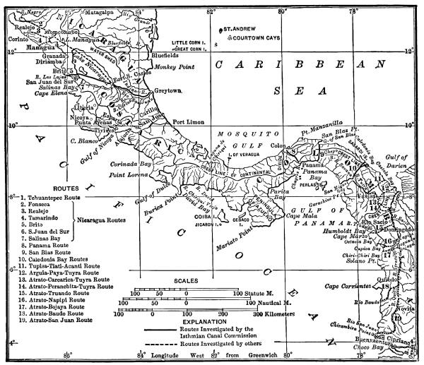 Concessions and treaties require to be secured and negotiated for the construction of the canal on either route, and under the conditions created by the $40,000,000 offer of the new Panama Canal Company this feature of both routes appears to possess about the same characteristics, although the Nicaragua route is, perhaps, freer from the complicating shadows of prior rights and concessions.