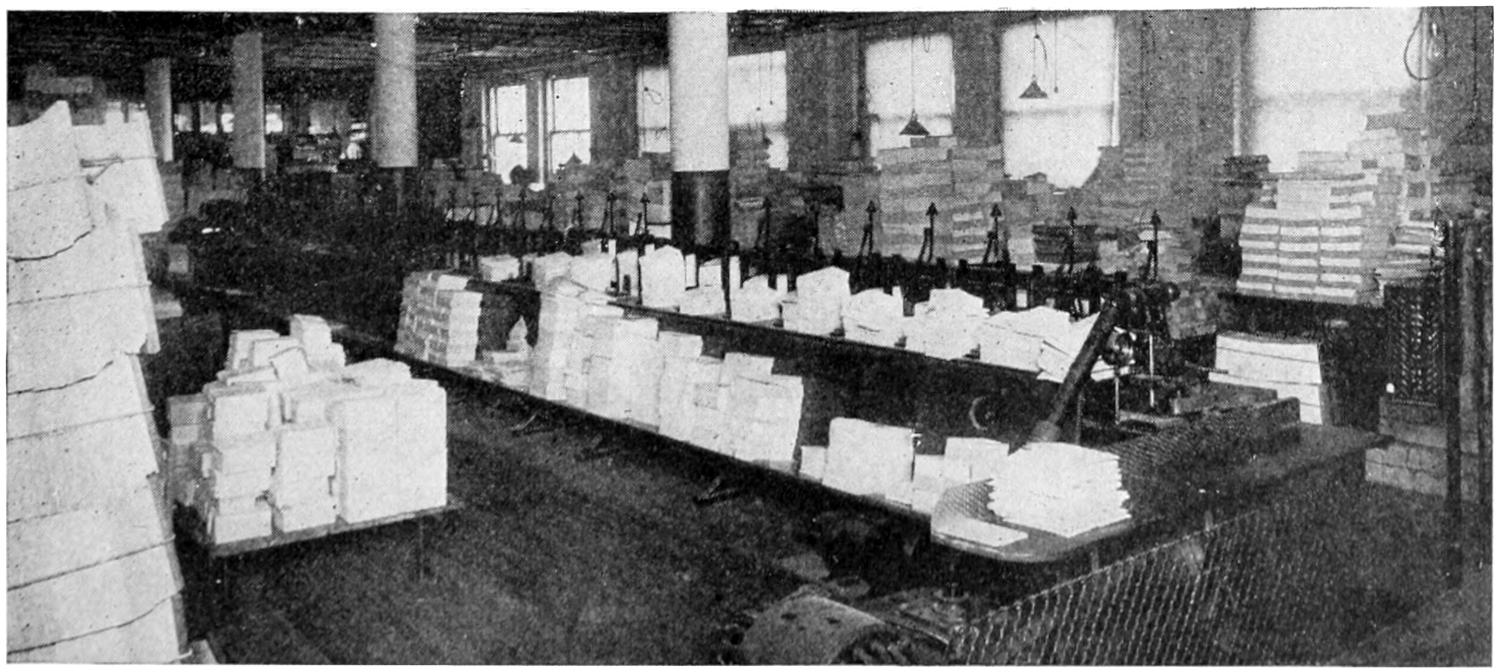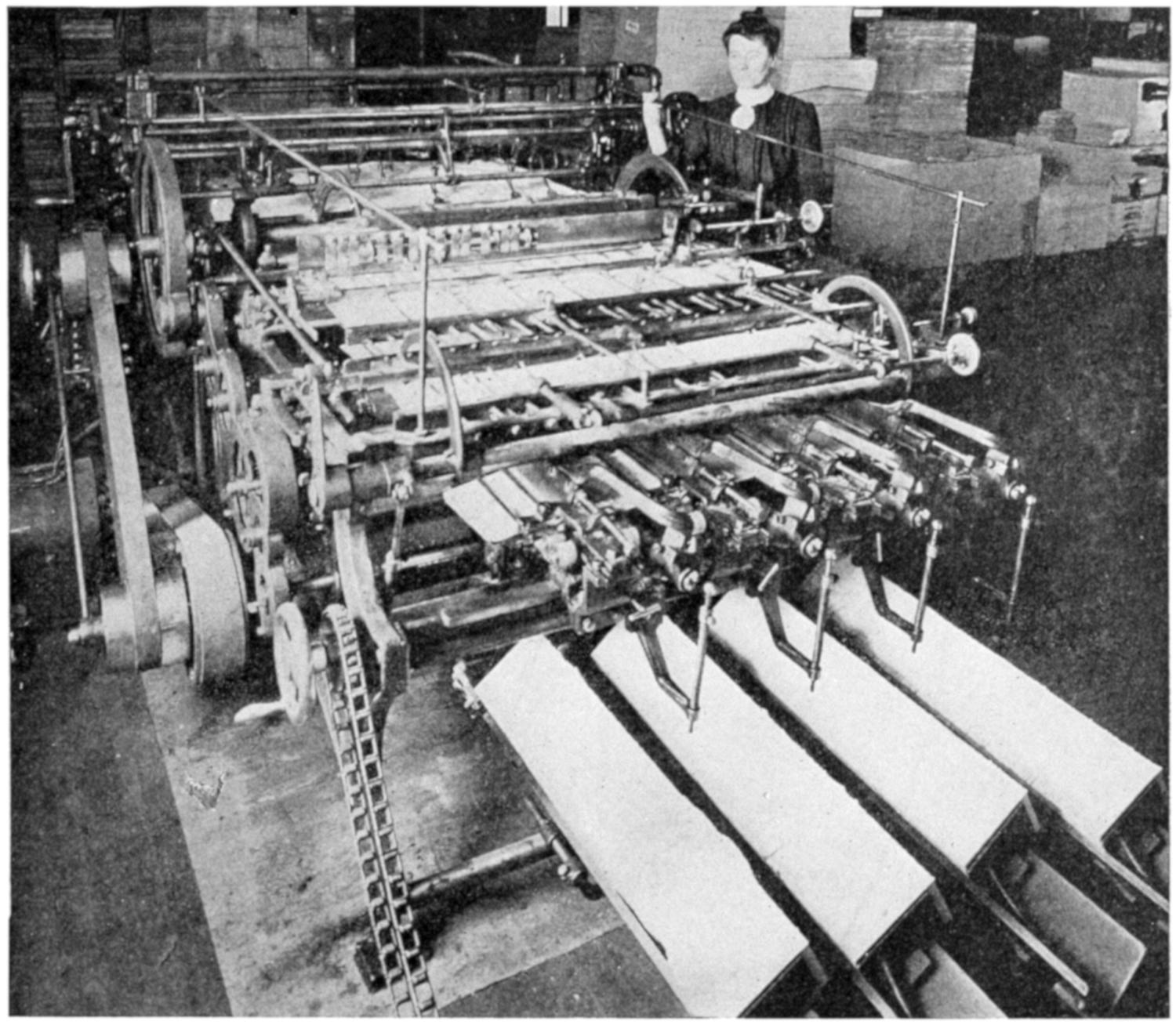 Here we see a machine which takes the folded sections of 16 pages each, which are called “signatures,” and sorts them, dropping them into compartments in order, so that each compartment finally contains the printed matter for one book all arranged in the order which it will be bound.