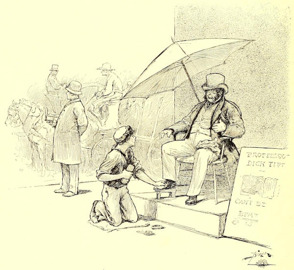 So one day when Dick was very hard at work blacking a customer’s boots, a short, stout man with a heavy face and a bald head, stopped on the pavement and stared for two or three minutes at the bootblack’s sign, which read: