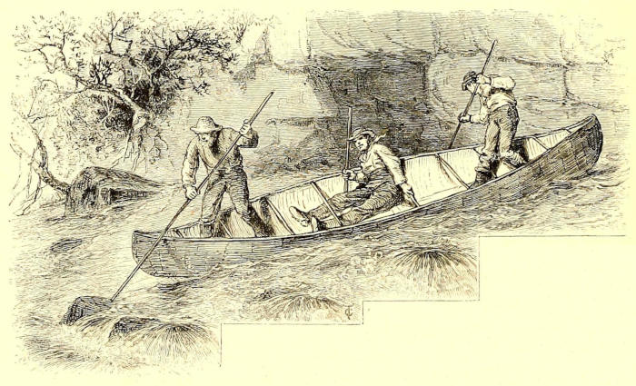 At the nearest ranch on the western side of the mountains, there lives a German who was the first pioneer to bring cattle in among these valleys. The encounters that he has had with all the various animals that live in the forest are very interesting. Not long ago, this old fellow built a new cabin for himself at the foot of a mountain. Before his house was finished, he went out one day and killed a fine fat deer. Bringing the carcass home at night, he hung it up against the back of[726] his house, and then hanging a blanket over the doorway which was still without a door, he went to bed. He slept soundly, but there dimly seemed to him to be some disturbance about the house during the night; and when he went out in the morning, every bit of his fine deer was gone, and the bear tracks up and down the mountain-side showed what had become of it. But game was plentiful, and it was not long before his deer was replaced by a big-horned sheep, which is the most tender and juicy meat that ever was eaten. This time he was more careful, and lay awake half the night, fearing that he should lose his stock of fresh meat. When it was very late and he was about to give up watching, he at last heard a sound at the back of the house. Something was at work on his wild mutton. There was a noise of scratching and tearing. It seemed as if several bears were making short work with his meat. He seized his loaded rifle and jumped out of bed with very scanty clothing on. Going to the doorway and drawing aside the blanket, he saw that the night was cloudy and as dark as Egypt. He stopped and thought for a moment that it would be impossible to kill a bear in such darkness, even if he should be able to hit it, for these beasts are so tough that they will carry a dozen bullets about in their bodies without much inconvenience, if they are not wounded in the heart or the brain. So our friend laid down his rifle and took instead a loaded shot-gun. “This is the thing for them,” he said to himself; “it will pepper them all over and scare them so they never will come again.” Then, with gun in hand he silently climbed the projecting logs at the nearest corner of the cabin, and creeping across the roof, peeped over the edge above the place where the sheep was hung. Something appeared to be moving below in the darkness. Taking a random aim, he blazed away. The shot scattered and evidently took effect; for there arose a chorus of growls and howls and yells that would have made the bravest man’s hair stand on end; there was a scampering and shuffling of many feet up and down, and around the cabin; even in the thick darkness he could see many great fat creatures running and sniffing angrily about to find who had attacked them. He saw that he was besieged on his own roof by at least a dozen furious, hungry bears. “They didn’t scare worth a cent,” he said. It was not long before they discovered whence the shot had come, and knowing very well that there is strength in numbers, they determined to have that man for supper, even if they had to put off their supper till breakfast-time. So while some sat down here and there, the others walked about, grunting and growling over their injuries. Bears can climb quite as well as men, and old Frank stood with fear and trembling in the middle of the roof, ready to receive with the butt of his gun the first nose that should rise above the edge. If two had happened to mount the roof on opposite sides, there would have been a small chance of life for the poor man. But the bears thought that solid ground was the safer place for them, so there they staid; and up above sat old Frank shivering, how long he never knew. It seemed centuries. It was a sharp, frosty autumn night, and, as he had on very little clothing, Frank was soon chilled almost to his bones. But the bears’ coats were warm enough. They were more hungry than they were cold, so there they sat and growled and waited for their prey to come down and be eaten. Soon a bitterly cold wind began to blow. Every joint in the poor man’s body stiffened; but it seemed pleasanter to freeze to death than to be eaten up by those ugly beasts, so he bore his discomfort as best he could. The hours of that night seemed to be endless, and the chill grew terrible; but at last a dull gray streak appeared in the East. No man was ever more glad to see the first sign of dawn than was that chilly watcher. Bears are very shy by daylight, and as the twilight little by little grew into broad day, Frank’s visitors trotted away disappointed and sulky up to their dens on the mountain. Their victim, more dead than alive, was able at last to climb down, and kindle a fire to warm himself. He still lives to tell the story in the same log cabin; but it has a good stout door now, and he will never again go bear-hunting with a shot-gun.