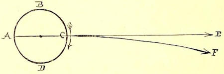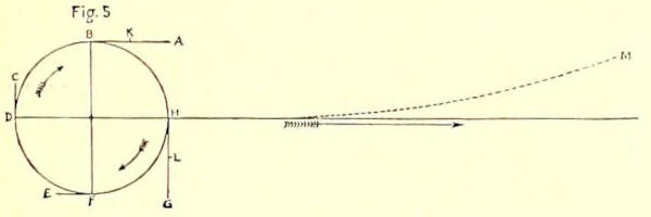 Now, suppose the ball to move in the direction indicated by the large arrow, Fig. 5, then the resistance on the side B would increase, that on the side F would decrease, hence AB would increase, while EF decreased proportionately. Again, the air in front of the ball at H is condensed, that in the rear at D is rarefied, hence the resistance at H is increased, that at D being lessened, and GH is increased, while CD is lessened.