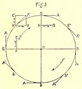 Let Fig. 3 represent a ball revolving about its center O, in the direction indicated by the arrows, but the ball, as a whole, not moving in any direction. Let BB, BB, be lines at right angles to each other. Let the resistance of the atmosphere be represented by lines AB, AB, AB, AB, and AB′, AB′, AB′, AB′, running in a direction opposite to the revolution of the ball. The lines AB, AB, AB, AB are already perpendicular to BB, BB, and need not be changed. But the lines AB′, AB′, AB′, AB′ must be resolved into components perpendicular to BB, BB. This has been done in one case, the components being CB′ and DB′. But the force CB′ acting on the point B is equivalent to the force EF acting on BB, and the force DB is equivalent to the force GH acting on the other BB.