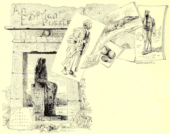 The above Egyptian puzzle is an illustrated pyramid, as the diagram in the lower left-hand corner indicates. When rightly guessed, the central letters (indicated by crosses) will spell the name of a famous statue that is said to emit sounds like those of a harp as the sun rises. The illustrations answer to the following definitions.
