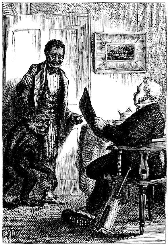 We have just five minutes more before nurse comes, so I will end with a short story my father told me, of something which happened many years ago in Jamaica. A new Governor was expected to arrive by the following steamer; he was coming from Demerara, where monkeys abound; his wife 25was very fond of these pets, and had sent on before her a large iron cage full of monkeys of all sorts and sizes, in charge of a servant. These animals created great excitement on their arrival in Spanish Town, especially among the negroes, who had never seen a monkey, and fancied they were inferior beings of the same class as themselves. The cage was fastened outside the ‘King’s House’ (where the Governor was to live), and for a few days all went well. I must explain to you that the next house to this was one where the President of the Council lived, and was only separated from it by a large garden. Owing to the carelessness of the servant, the cage door was found open one morning, and the monkeys were disporting themselves in the President’s garden, making sad havoc among his fruits and flowers. They were all captured after a little time, except one huge baboon, who climbed into a high tree, and hid himself so cleverly that he could not be found. When the coast was clear, Mr. Monkey came down, and set out on his travels, 26making his first visit to the President. The black hall-porter was so astonished and alarmed at this unwonted visitor, that he hastily ran upstairs, the baboon following him closely, flung the door of the breakfast-room open, and said in trembling tones: ‘One lilly black genlemans to see massa,’ and then retreated as fast as he could, shutting the door behind him. Now the poor old President had only one leg, and his wooden substitute lay on a chair near him, for he never put it on unless he wanted to move about. He was very indignant at the impudence of his uninvited guest, who immediately began to help himself to the dainties on the table, and he flung his wooden leg at the intruder, never reflecting that he could not stir without its help. When my father happened to look in an hour afterwards he found the old gentleman speechless with rage, still helpless on his chair, and the monkey scrimmaging all over the room, upsetting inkstands, breaking china, and creating the greatest havoc among the President’s books and papers.
