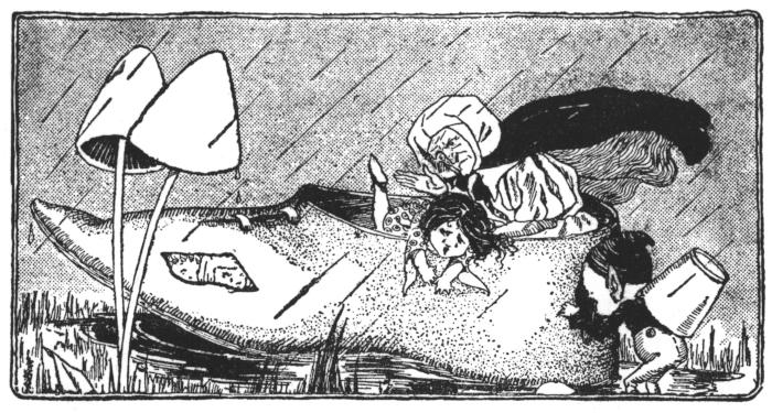 He had not gone far through the forest when he heard a sound of crying. So he took the bucket from over his head and looked about. Then it was that he saw a great big shoe standing in a puddle, and it was from this shoe that the sound of crying came. Dandelion crept nearer, and, looking through a little hole in the heel, was just in time to see an old woman smacking a wee girl about his own size.