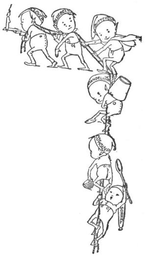 Now, the little goblin woman thought the world of her six little sons, and she had given them all pretty flower names—Clover, Buttercup, Sorrel, Bluebell, Cowslip, and Dandelion.