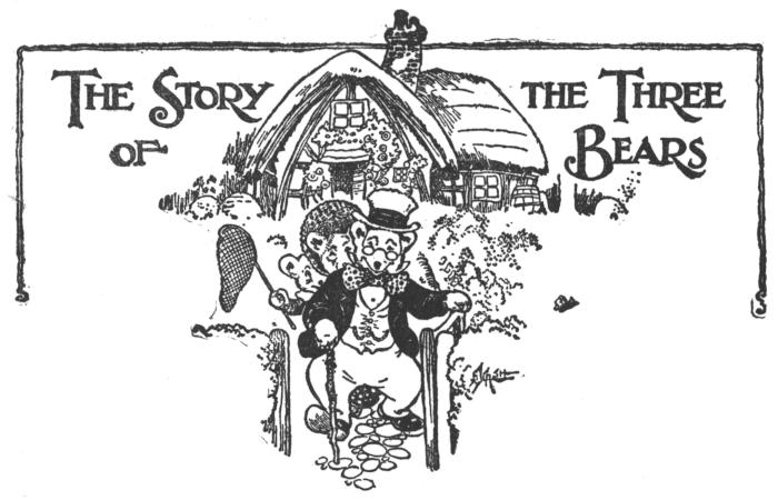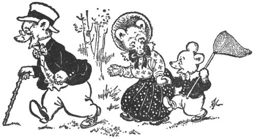 Mrs. Bear heard him coming and took her bonnet from its peg, and when the strings were tied beneath her chin, and Mr. Bear had taken his thorn stick from the corner, and little Master Bear had found his butterfly net, they all set off in the wood for a walk, clicking the gate behind them.