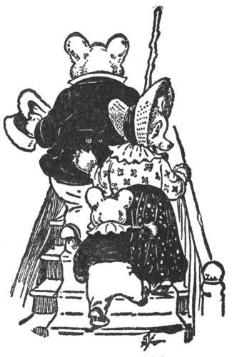 No time was to be lost in such sad straits, and Mr. Bear had his foot on the stairs before Mrs. Bear had so much as decided how the little chair could be mended. She felt sorely puzzled, but, picking up her gown in front, she followed Mr. Bear up the stairs, while little Master Bear clambered, heavy-hearted, up behind her, holding on very tight to the back breadth of her skirt, for who could tell what would happen next!