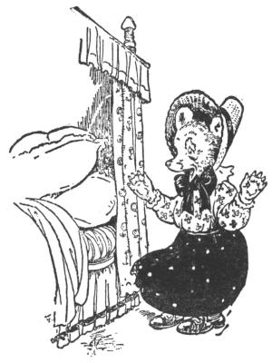 Poor Mrs. Bear! she turned round to look at her own white bed, with its pretty dimity curtains, and she called out in her middling-sized way, “Oh, deary, deary, deary me, someone has been sleeping on my bed!” Her feelings and the counterpane were sadly ruffled.