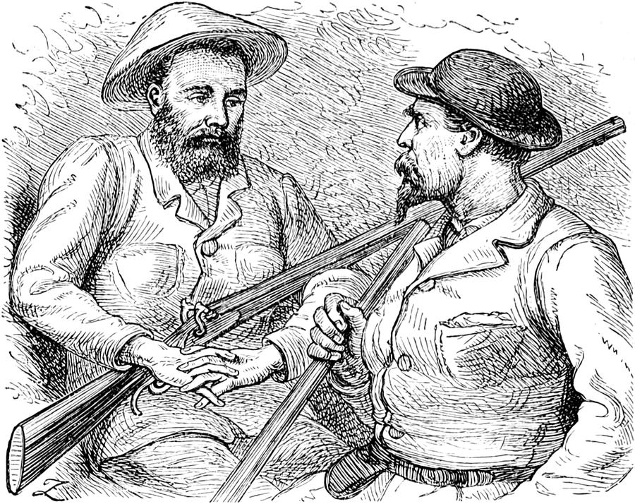 Indem ich meine doppelläufige Flinte von Selim’s Schultern nahm, suchte ich mir ein Dutzend Ladungen Rehposten aus und ging, nachdem ich zwei davon in die Läufe gethan und meine Revolver bereit gemacht hatte, auf sie zu. Ich bemerkte, wie die Leute zu ihren Flinten griffen, als ich näher kam. Als ich 30 Schritt von den Gruppen entfernt war, sah ich die Köpfe von zwei Leuten über einem Ameisenhaufen zu meiner Linken erscheinen, ihre Flintenläufe nachlässig auf den Weg gerichtet.