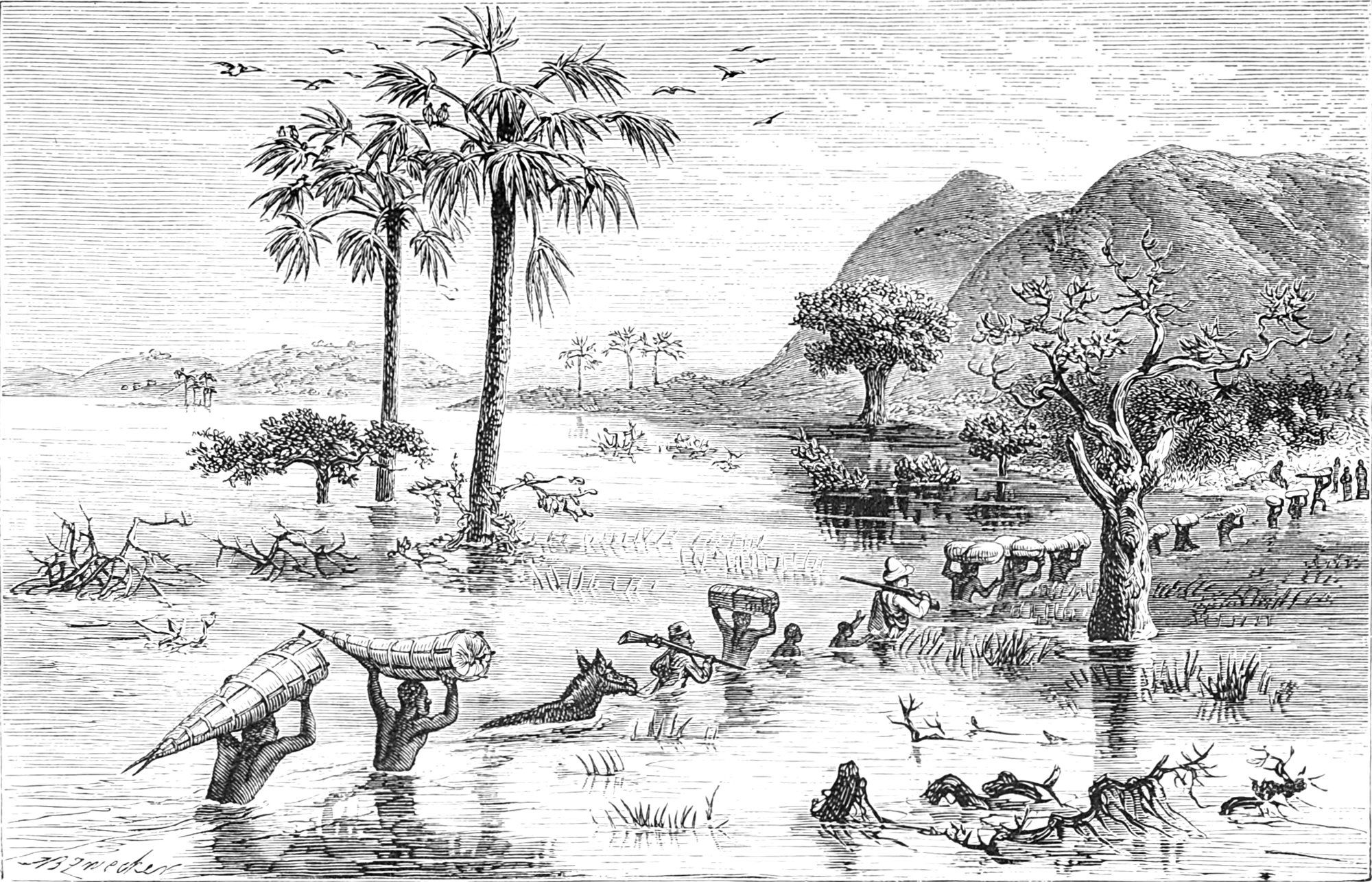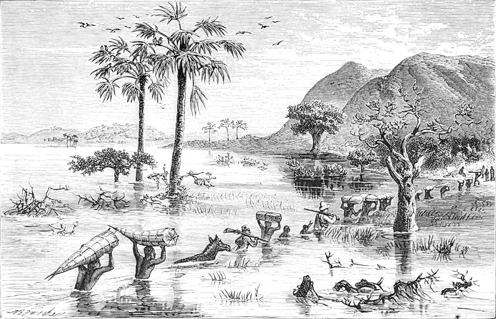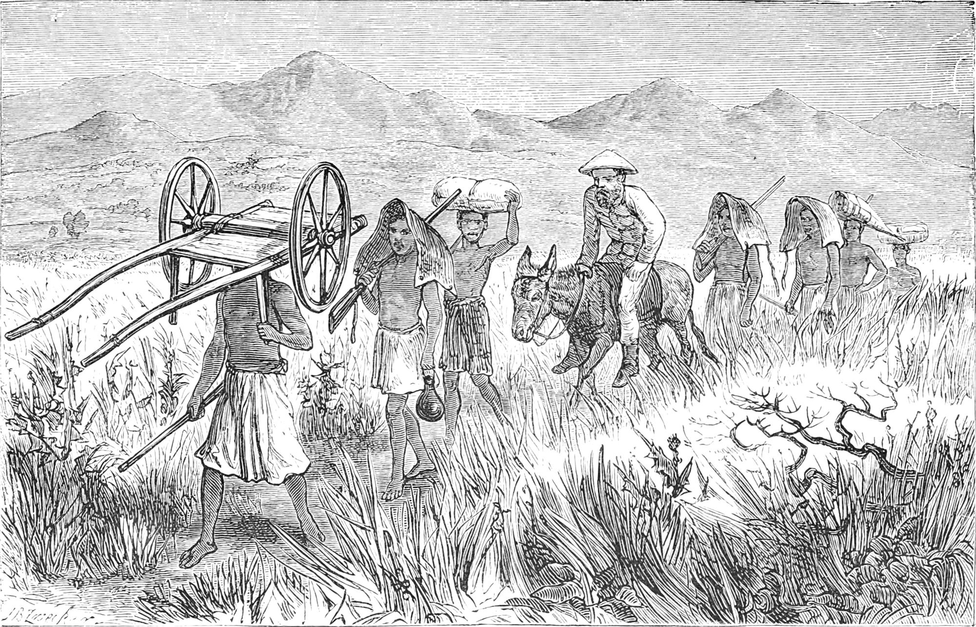 Wiederum wurde der Befehl zum Marsch ertheilt und alle nahmen ihre Lasten mit erstaunlicher Munterkeit auf und entschwanden alsbald den Blicken, Bombay und Ambari in Ketten, zusammen mit den Deserteuren Kingaru und Asmani, mit den schwersten Lasten beladen, hinter uns her.