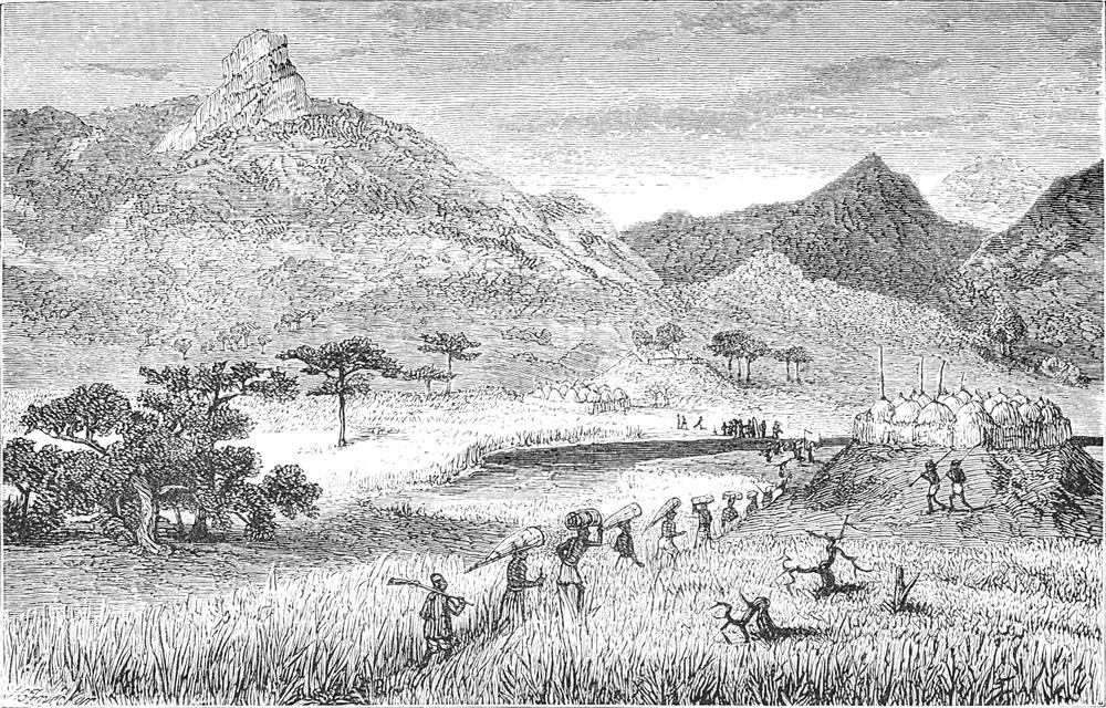 Von dem Nullah oder Mtoni zogen wir nach Mwaru, dem Hauptdorf des Districts Mwaru, dessen Häuptling Ka-mirambo ist. Unser Marsch führte uns über verlassene freie Plätze, die einst von Ka-mirambo’s Leuten besetzt gewesen, welche jetzt aber vor etwa zehn Jahren von Mkasiwa während seiner Kriegführung gegen Manwa Sera vertrieben worden waren. Niongo, der Bruder des letztern, führte jetzt eben Krieg mit Mbogo und war durch Mwaru am Tage vor unserer Ankunft durchgezogen, nachdem er von seinem Feinde eine Niederlage erlitten hatte.
