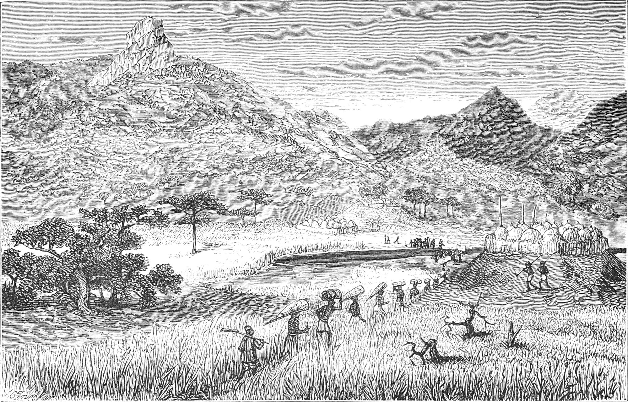 Die Hügelkette, welche sich am westlichen Horizont dahinzog und von Utende aus sichtbar gewesen war, überschritten wir an diesem Tage. Der westliche Abhang windet sich hier schräg nach Südwesten und wird vom Flusse Mrera, der sich in den Malagarazi ergiesst, entwässert. Schon hier nahmen wir den Einfluss des Tanganika wahr, obwol wir noch zwölf bis fünfzehn Märsche von dem See entfernt waren: das Gebüsch wurde dichter und das Gras ungemein hoch. Dies erinnerte mich an die Seedistricte von Ukwere und Ukami.