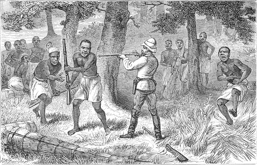 Ich hielt an, warf den Lauf meiner Flinte in die Höhlung der linken Hand, zielte kaltblütig auf sie und drohte ihnen die Köpfe zu zerschmettern, falls sie nicht vorträten, um mit mir zu sprechen. Diese beiden waren der riesenhafte Asmani und sein getreuer Freund Mabruki, die Führer Scheikh bin Nasib’s. Da es gefährlich war, einem solchen Befehl nicht nachzukommen, so kamen sie sogleich; ich sah aber, als ich Asmani im Auge behielt, dass er seine Finger am Drücker seiner Flinte bewegte und dieselbe in Bereitschaft hielt. Wiederum erhob ich meine Flinte und drohte, ihn sofort zu erschiessen, wenn er nicht seine Flinte fortwerfe.