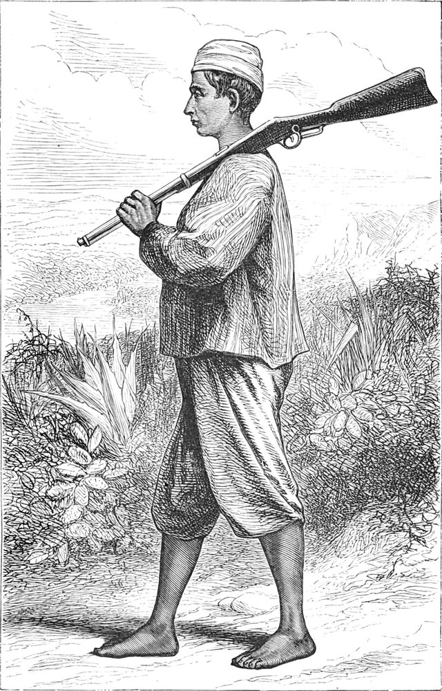 Khamisi ist ein netter, reinlicher Junge von ungefähr zwanzig Jahren, thätig, laut, prahlerisch und der Feigste der Feigen. Er pflegt bei jeder Gelegenheit zu stehlen, hängt mit Vorliebe an seiner Flinte, ist immer sehr ängstlich, wenn eine Schraube losgeht oder ein Stein nicht Feuer geben will; doch bezweifle ich, dass er vor starkem Zittern im Stande sein würde, seine Flinte gegen einen Feind abzufeuern. Er würde sich wol eher auf seine Füsse verlassen, die klein und wohlgeformt sind.