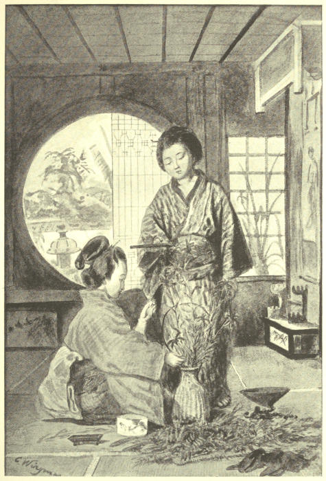 [15] “Imamairi Tenshi no Tsuboné,” “recently arrived lawful waiting-woman.” “Tsuboné” is literally “the room occupied by the women.” Cf. German, Frauenzimmer, and Arabic, Harim.