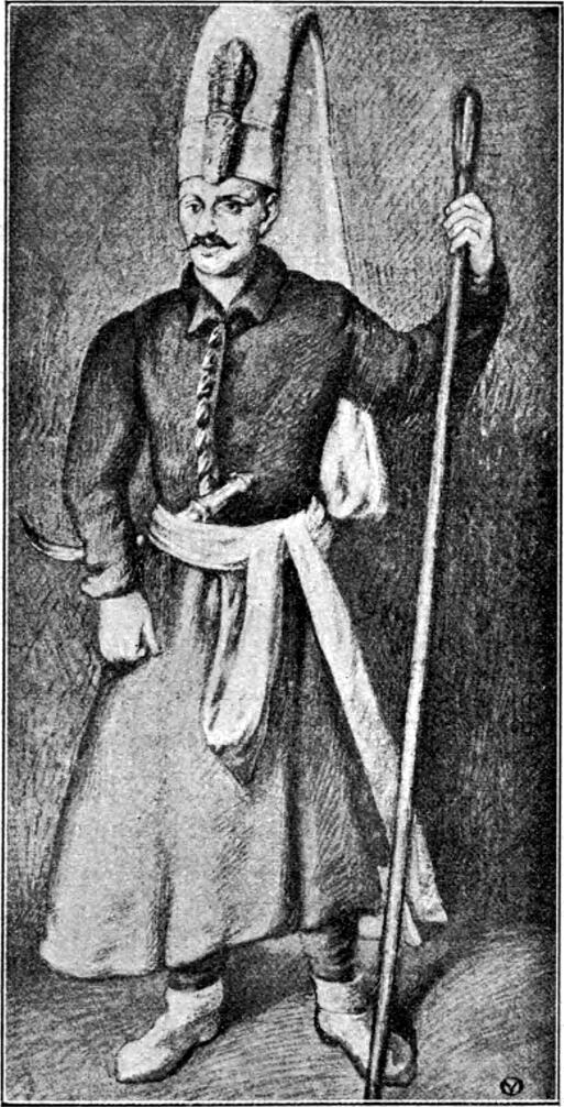 A mi janicsárunknak három szekere és hét rabja van. Öten vannak még kéknadrágos, piros csizmás, fehér süveges janicsárok, három meg prémes sapkáju, nagy dárdáju azab. A félszemünek porral lepett fehér strucctoll leng a süvege elejétől hátrahajoltan, csaknem a háta közepéig.