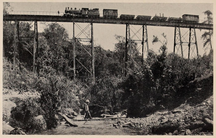 As we stood round the log-fire at evening, the thunder and lightning roared and flashed; and then down came the rain and pelted hard all night. One of the tents was quite flooded; the bed and furniture were rescued and the occupant moved into another’s tent pitched on slightly higher ground. We had arrived in the rainy season, and were told that we must not be surprised if we got a daily soaking. It rather damped one’s enthusiasm for camping out and cycling. This district is called the Kidong Escarpment, and is a ledge of land that suddenly drops[10] some 500 feet. The railway takes a circuitous route to avoid this drop, but at that time a most elaborate temporary line had been laid down the precipitous bank, the cars being worked by cables. One had here an example of the almost insurmountable difficulties that faced the engineers of the Uganda railway, difficulties emphasised by the fact that all material required had to be imported from India or England. Viaducts, some of which are of gigantic height, frequently connect rock to rock, and along these the train has cautiously to pass. At other times the brave little locomotive pants and gasps as it toils along with its burden; now and again it stops to gain breath, then it goes on again, climbing, ever climbing, till it has reached an altitude of 7,000 feet.