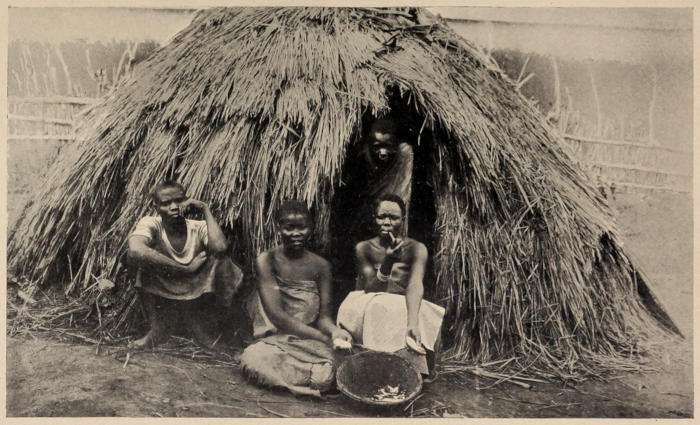 One of these events took place after we had been in the country only a few months, when we were decidedly new to the way things were managed out here, and still retained a fair amount of the provincialism of home training; so when a teachers’ conference was announced we conjured up in our minds a kind of forthcoming Mildmay or Keswick Convention on a small scale, but the arrangements took a slightly different form. The first day opened with a big feast to all the workers. The dispensary was converted for the day into the banquetting hall; the entrance was draped in gaudy native cloths, and the floors of the two rooms were carpeted with banana leaves. The men were allocated to one room and the women to the other. Long before the hour of the feast the guests had arrived and packed themselves as closely together as was possible in circles of seven or eight, the King and his chiefs forming one of the groups. An ox had been killed for the feast; it was boiled in banana leaves and served up with quantities of unsweetened, cooked bananas. Prodigious piles were placed in the centre of each circle of guests, and then business began! Off came their top draperies or coats, and with bare arms all eagerly outstretched towards the food they dived into their food with astonishing rapidity and energy. The banana mash was rolled round the fingers into balls and stuffed down their throats without any regard being given to mastication. The King and chiefs seemed to momentarily forget their dignity, and ate till the perspiration rolled down their faces. Tea was served round in kettles; every available cup, mug, basin and jug on the station had been collected together for the use of the guests—and the two-quarts jugs were far more popular than afternoon tea cups.