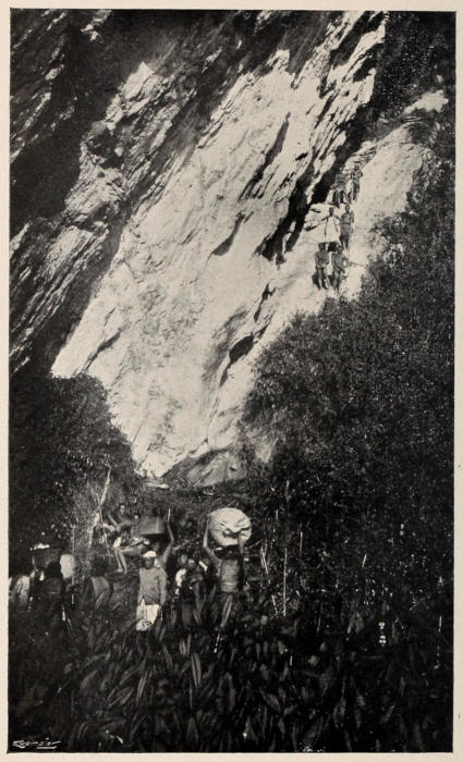 The region of Bamboo Forests was next reached, and it was disappointing to find that what looked so attractive from a distance beneath when seen from within was nothing but a monotonous stretch of stiff brown sticks surmounted by masses of green grass. The bamboos had completely monopolised the soil to the exclusion of almost every other plant. For hours we were pushing our way through these obstinate poles that would not bend or budge an inch to let us through. Men went before to slash them down, and as we stumbled over the broken stems my poor skirt was literally torn into shreds, even though it had been shortened eight inches the previous day. Emerging from bamboo-land we crossed a stretch of marsh and found ourselves surrounded by frowning bare rock peaks which rose almost perpendicularly from where we stood. Pointing up to a spot about one thousand feet above us, our guide indicated the only possible halting place. Although so near, it took us over two hours to reach; with the utmost caution we had to drag our bodies up the sheer face of the rocks. At one place we had recourse to a rough native ladder formed of two long bamboo poles with rungs of the same tied with grass. This was placed against an absolutely smooth-faced stretch of rock, where for a space of ten to fifteen feet no hold could be obtained. To add to the danger, strong mountain streams were pouring down over the rocks, not only soaking us through, but making our grip less secure. Certainly I had never before been in such a critical position; it was quite impossible to get a real firm footing, and one slip might have resulted in dragging others down into the seething waters and rocks that lay beneath.