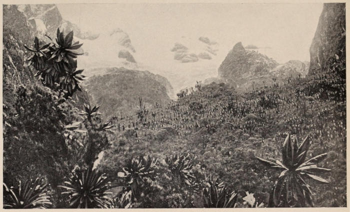 In 1903, Rev. A. L. Kitching, Mr. Fisher, and myself started off for a trip to that unfrequented region. Our baggage looked more suitable for a Polar expedition than a climb on the Equator. Every conceivable fusty and moth eaten winter garment was hauled out and packed into a waterproof sack; eider-down quilts, India rubber foot warmers, and bales of blankets for ourselves and boys formed part of the caravan. The reports of our mountaineering predecessors led us to anticipate an arduous and colossal task, but our ambition was not to attempt more than those who had a wider experience in mountain climbing than ourselves, but to stand on that untraversed land of ice where scarcely mortal foot had trod, and to inhale its cool life-giving air so that we might be refreshed for a return to work in the hot tiring lowlands.