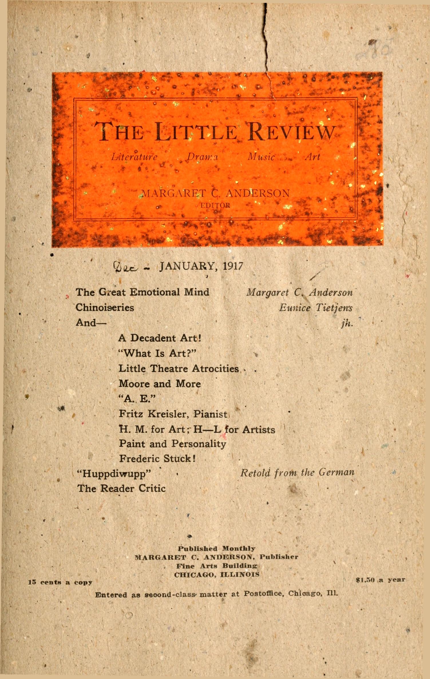 The table of contents on the title page was adjusted in order to reflect correctly the headings in this issue of The Little Review.