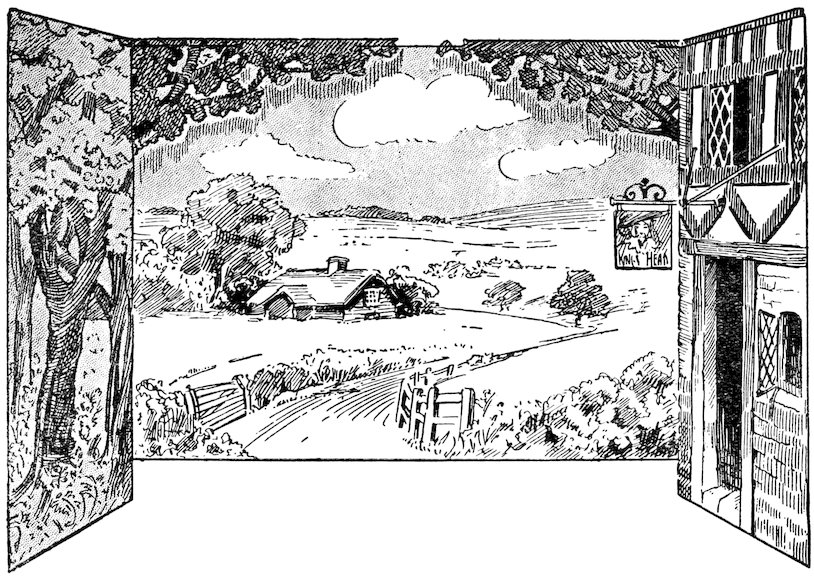 The earnest beginner will no doubt desire to adapt his designs to the play to be represented, but he will usually find very little guidance in the author’s directions. Such directions are scant and laconic, except where the position of a door, window, or fireplace is concerned. This reticence of authors is a blessing rather than a restriction, for such directions as ‘Interior of a cottage,’ ‘A drawing-room,’ ‘A stile by a cornfield,’ ‘A woodland stream,’ give the scene painter a free hand in depicting that which his fancy may dictate. A number of the illustrations in this book will be found useful as suggestions for exteriors and interiors suitable for a goodly collection of domestic plays dealing with home life, but where, as in many of Shakespeare’s plays, the scenario lies in Italy and other parts of Europe, or as in The Only Way and The Scarlet Pimpernel, Paris of the Revolution is dealt with, some attempt must be made to get local colour or the effect will be ludicrous. There are occasions where one need not be too particular. For instance, a Baronial Hall covers a long period of English History; it can even be made quite modern when the play deals with personages of ancient lineage, but the amateurs we saw who depicted a stirring incident in the Soudan war inside a Dickensian cottage, required too elastic an imagination from the audience. Where local colour must be got, the scene painter should look up some private prints or illustrations of the period, or, where possible, good 32pictures of the actual incidents in the play, an easy matter in the case of Shakespeare.